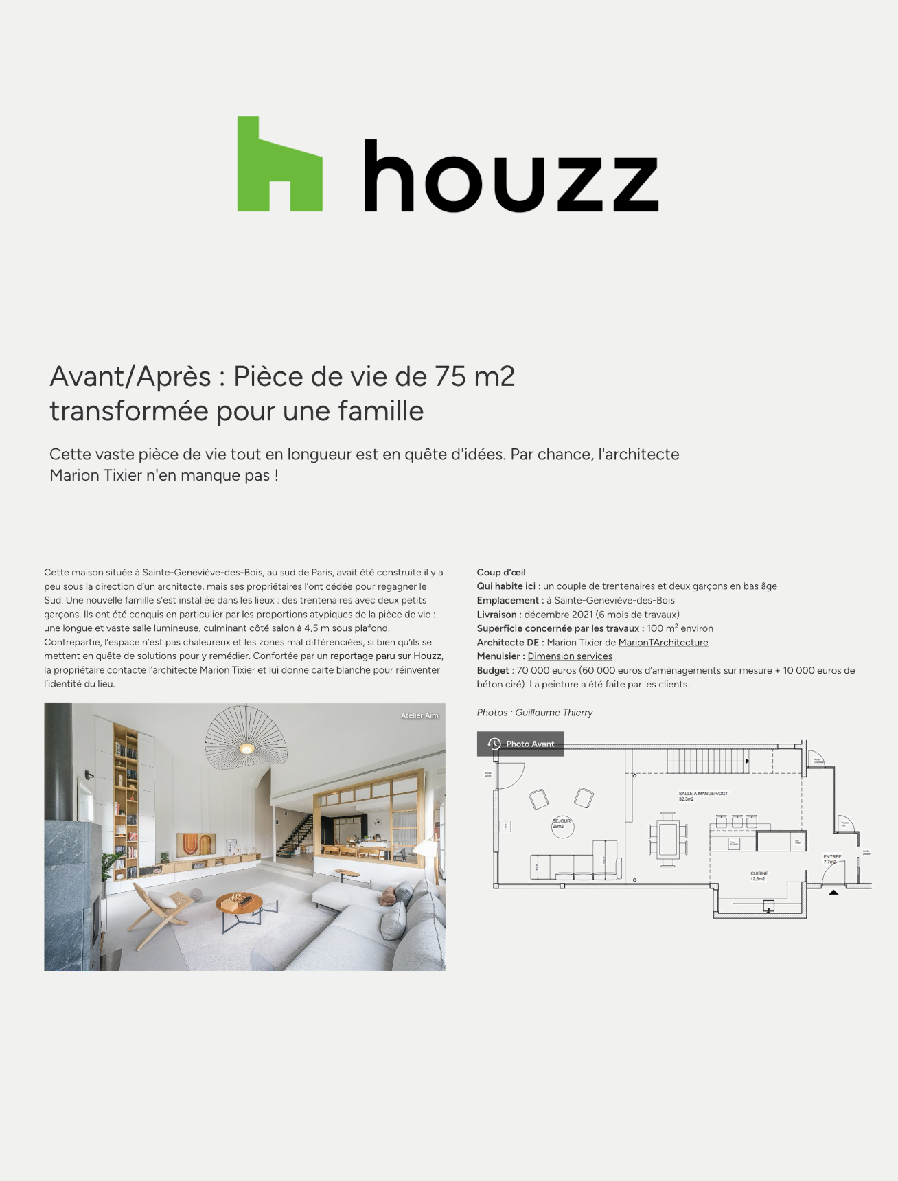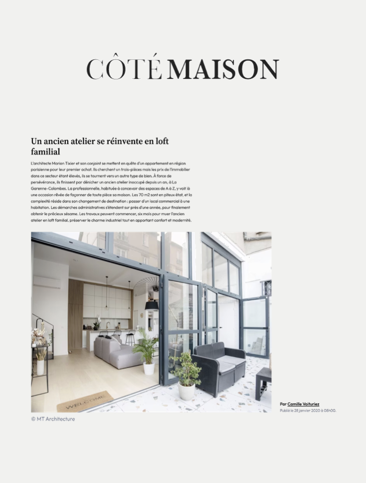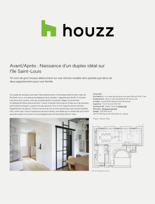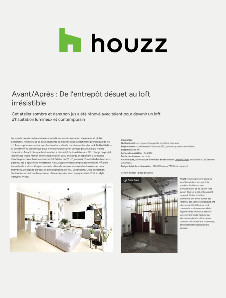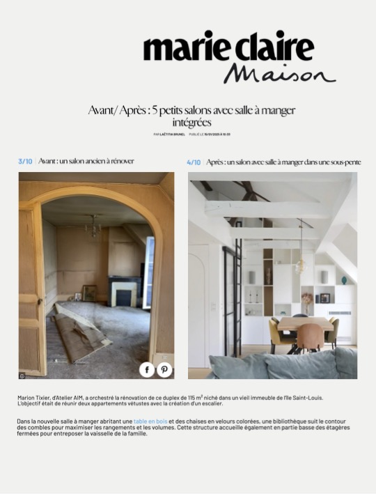 Presse. La presse met en lumière nos réalisations Janvier 2026 Avant / Après : Transformation d’un restaurant parisien Janvier 2026 Avant / Après : Les plus belles idées des architectes pour aménager les combles Janvier 2025 Avant / Après : 5 petits salons avec salle à manger intégrées Avril 2024 Avant / Après : Naissance d’un duplex idéal sur l’île Saint-Louis Septembre 2023 Maison & Travaux – Couverture & Article pages 72-79 Septembre 2023 Les claustras subliment l’espace Septembre 2023 Des dressings ingénieux pour optimiser l’espace Janvier 2023 Comment optimiser un salon ? Août 2022 Comment se créer un coin repas dans le salon ? Mai 2022 Maison & Jardin – Article p.37 Février 2022 Pièce de vie de 75 m² transformée pour une famille Janvier 2020 Un ancien atelier se réinvente en loft familial Avril 2019 De l’entrepôt désuet au loft irrésistible