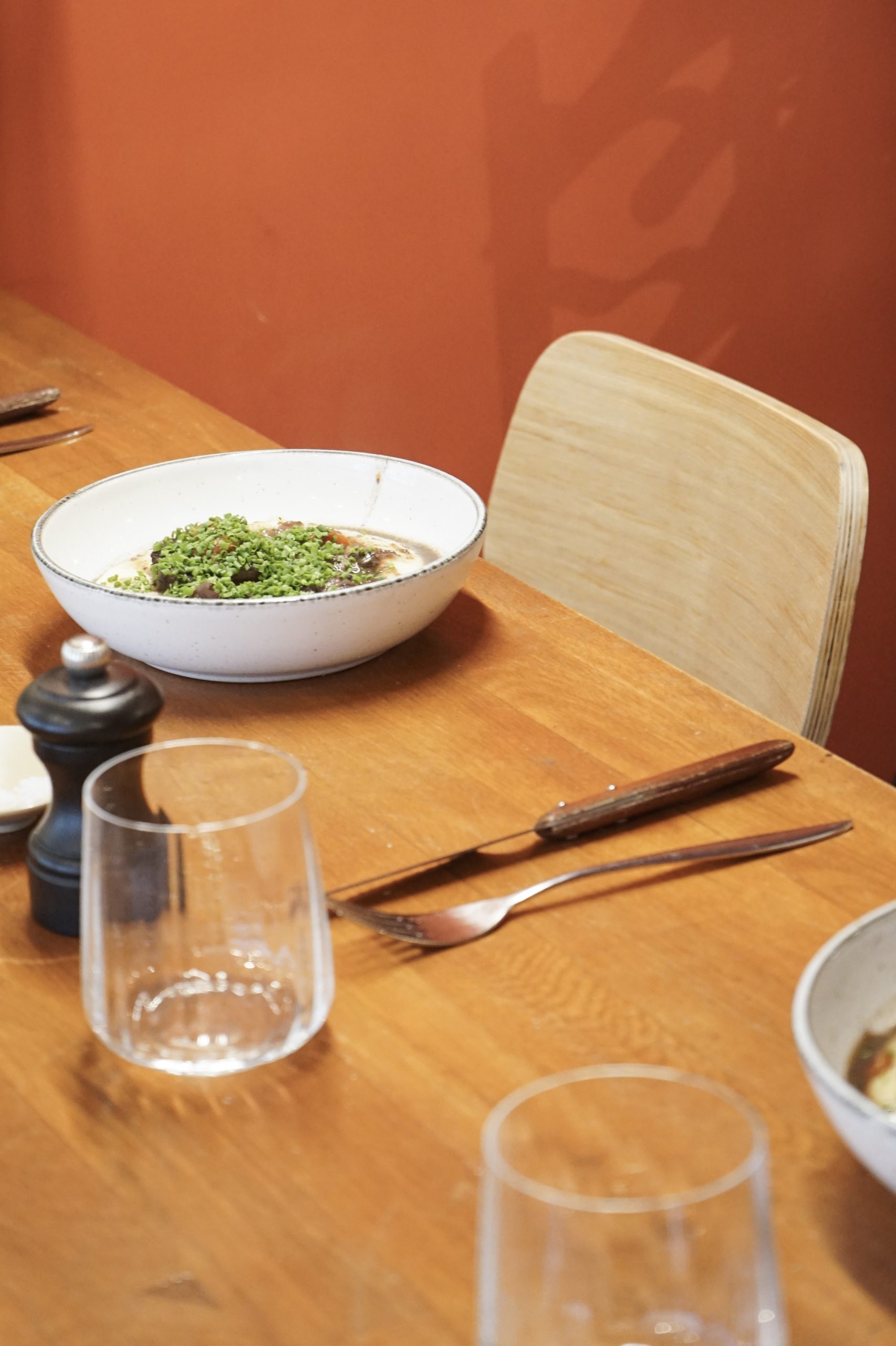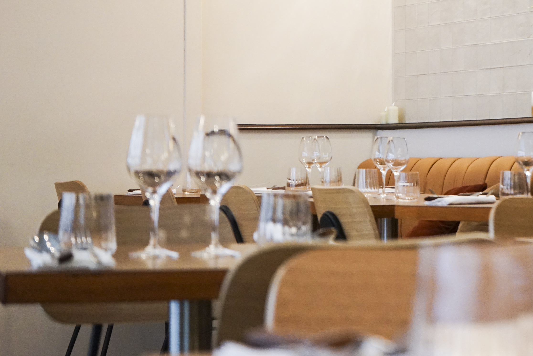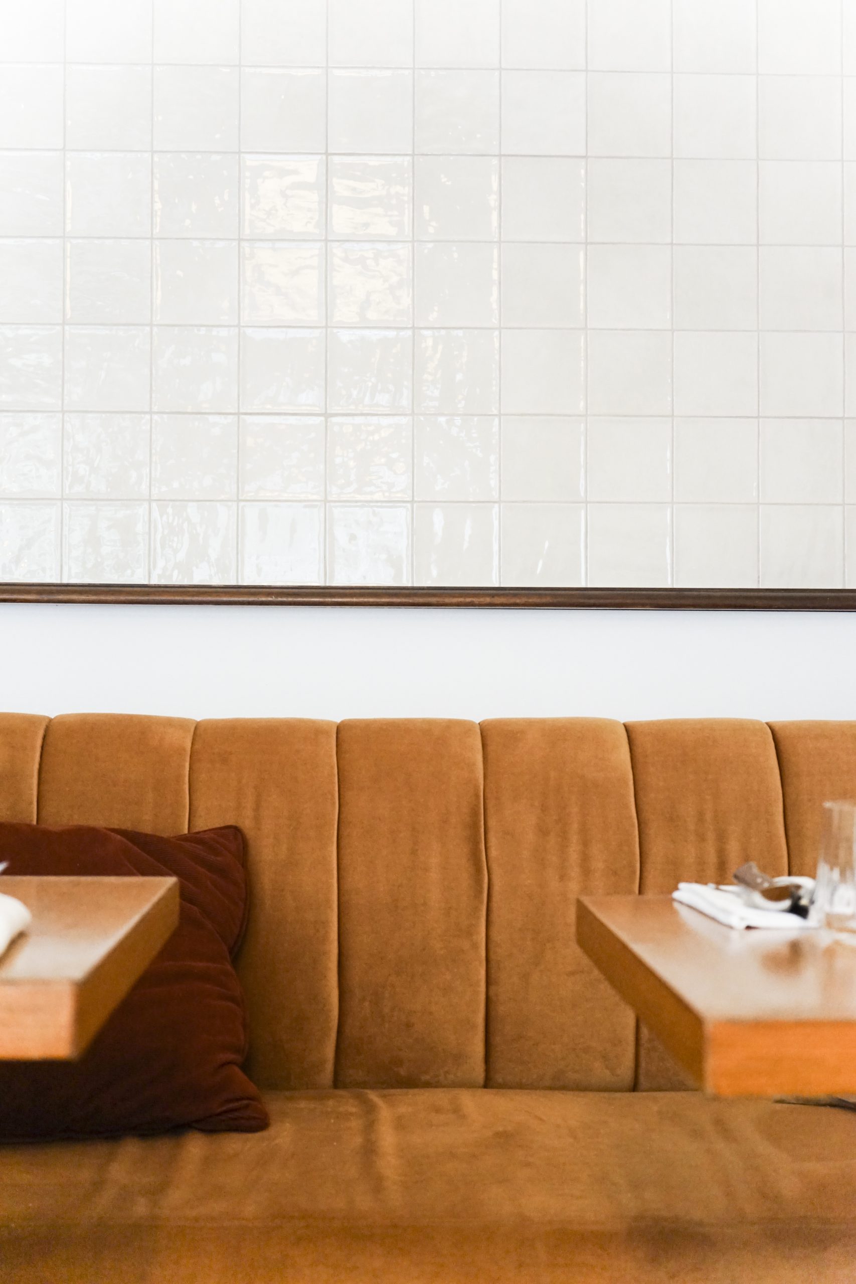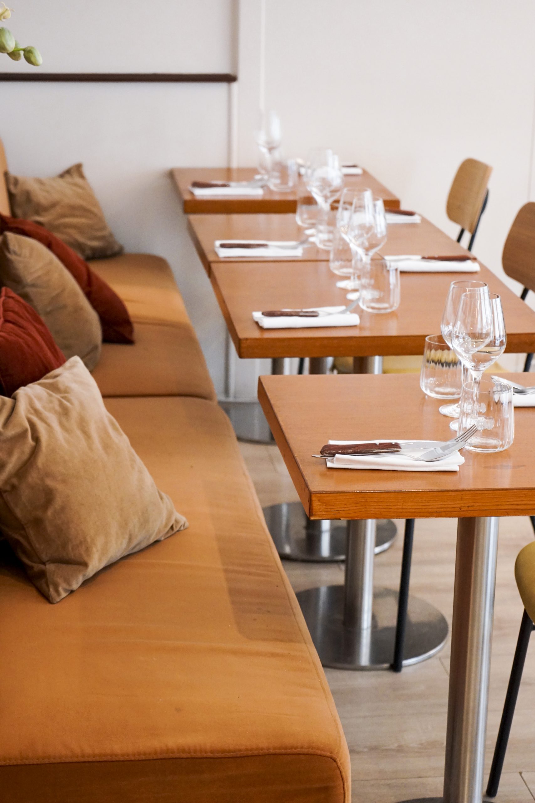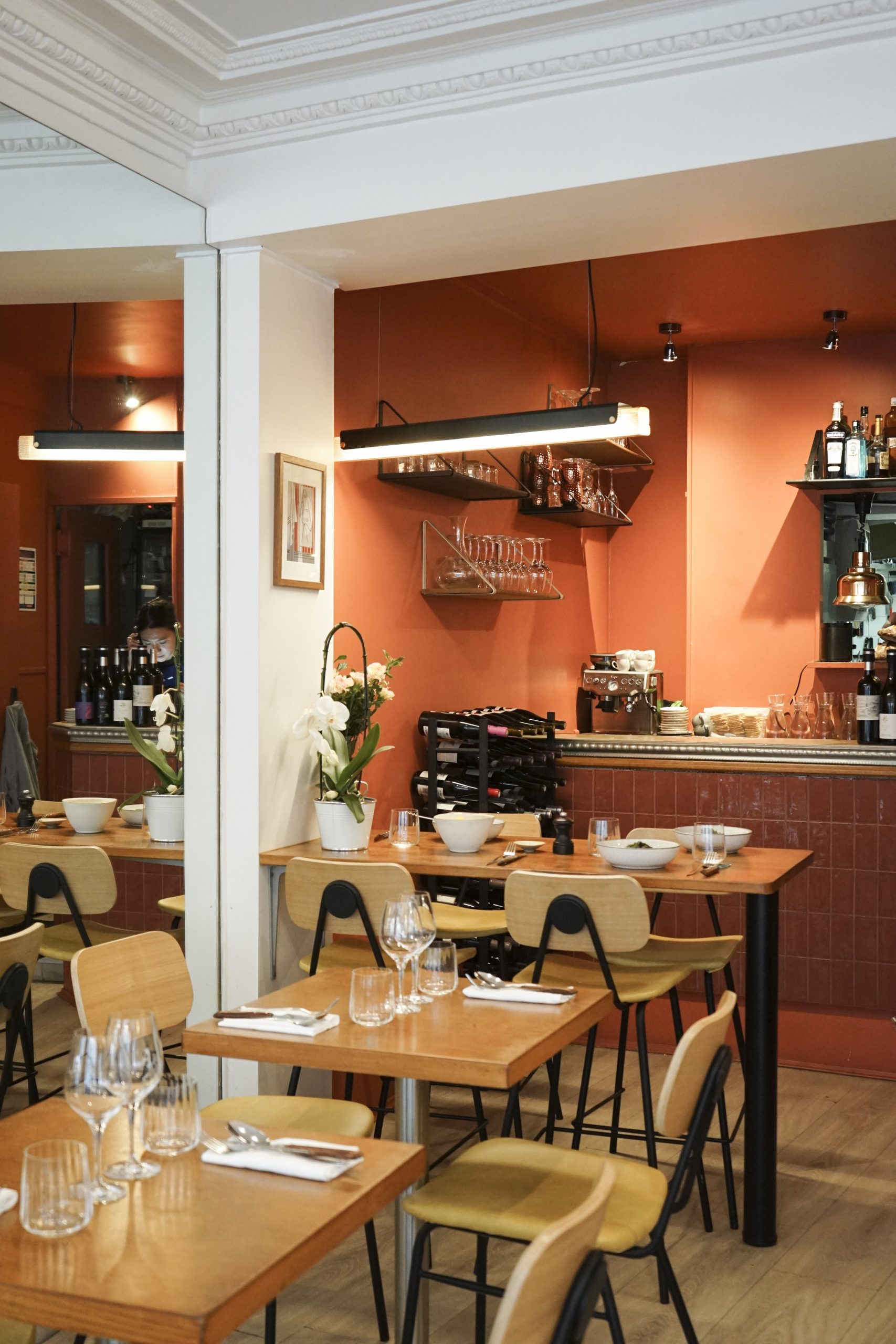 Chaque zone du restaurant a été pensée comme un univers singulier. L’espace bar, conçu comme une boîte graphique, se distingue par une teinte terracotta contemporaine, choisie par les clients, qui affirme l’identité du lieu et renforce son esprit convivial.