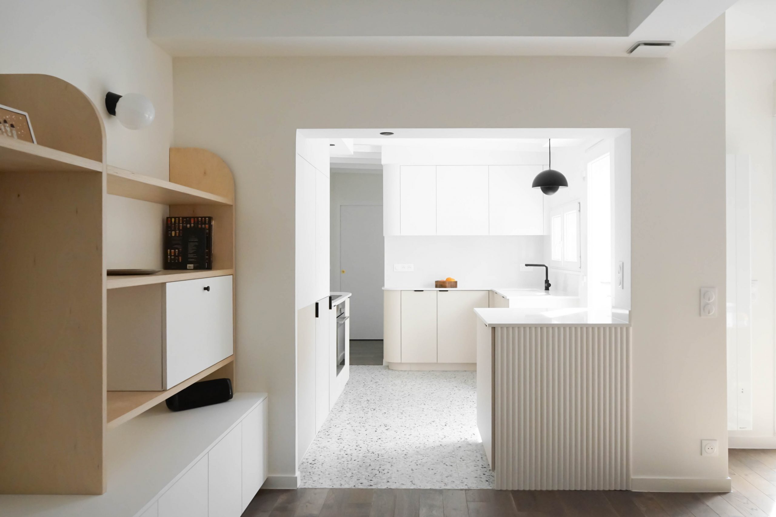 Situé en rez-de-chaussée avec terrasse, cet appartement à La Garenne-Colombes, accueillant une famille avec quatre enfants, nécessitait une refonte complète de la cuisine, de l’espace de vie et des pièces d’eau. Les maîtres mots du projet : fluidité de circulation, optimisation du rangement et ambiance chaleureuse.