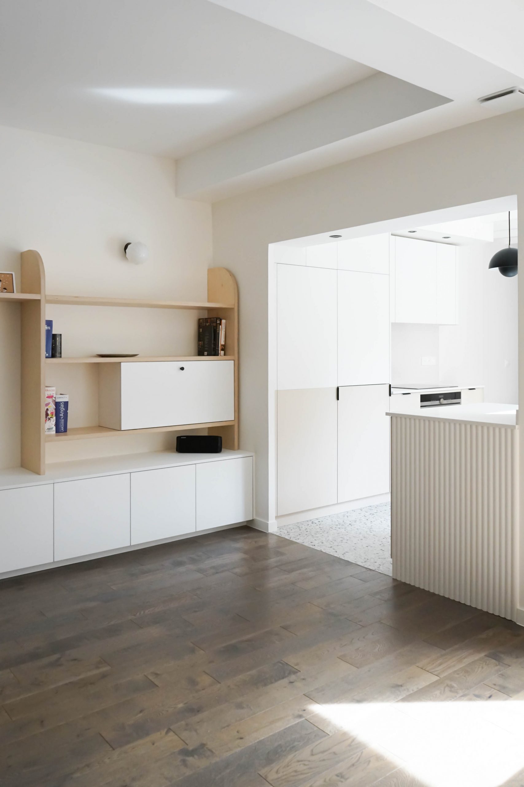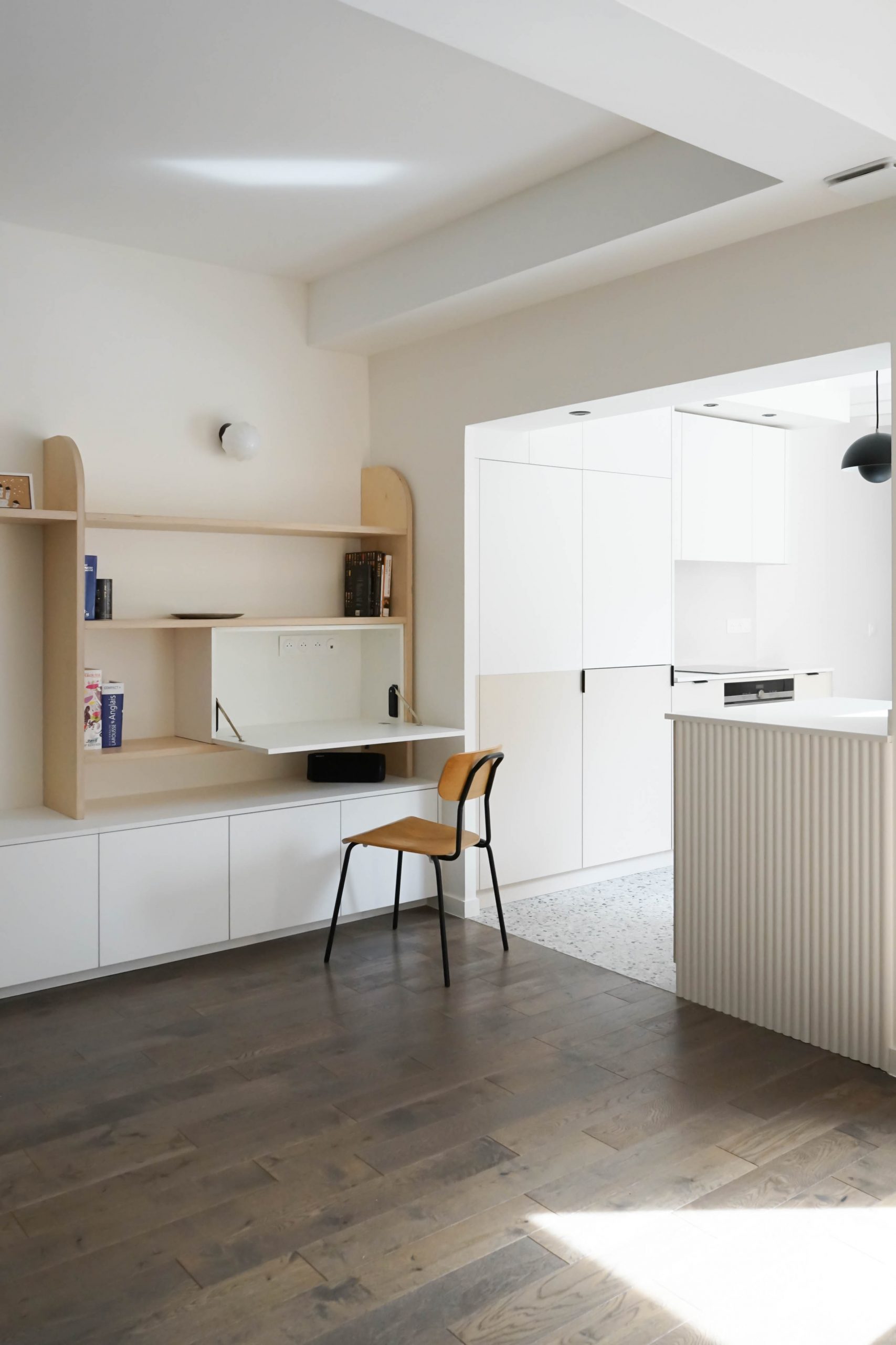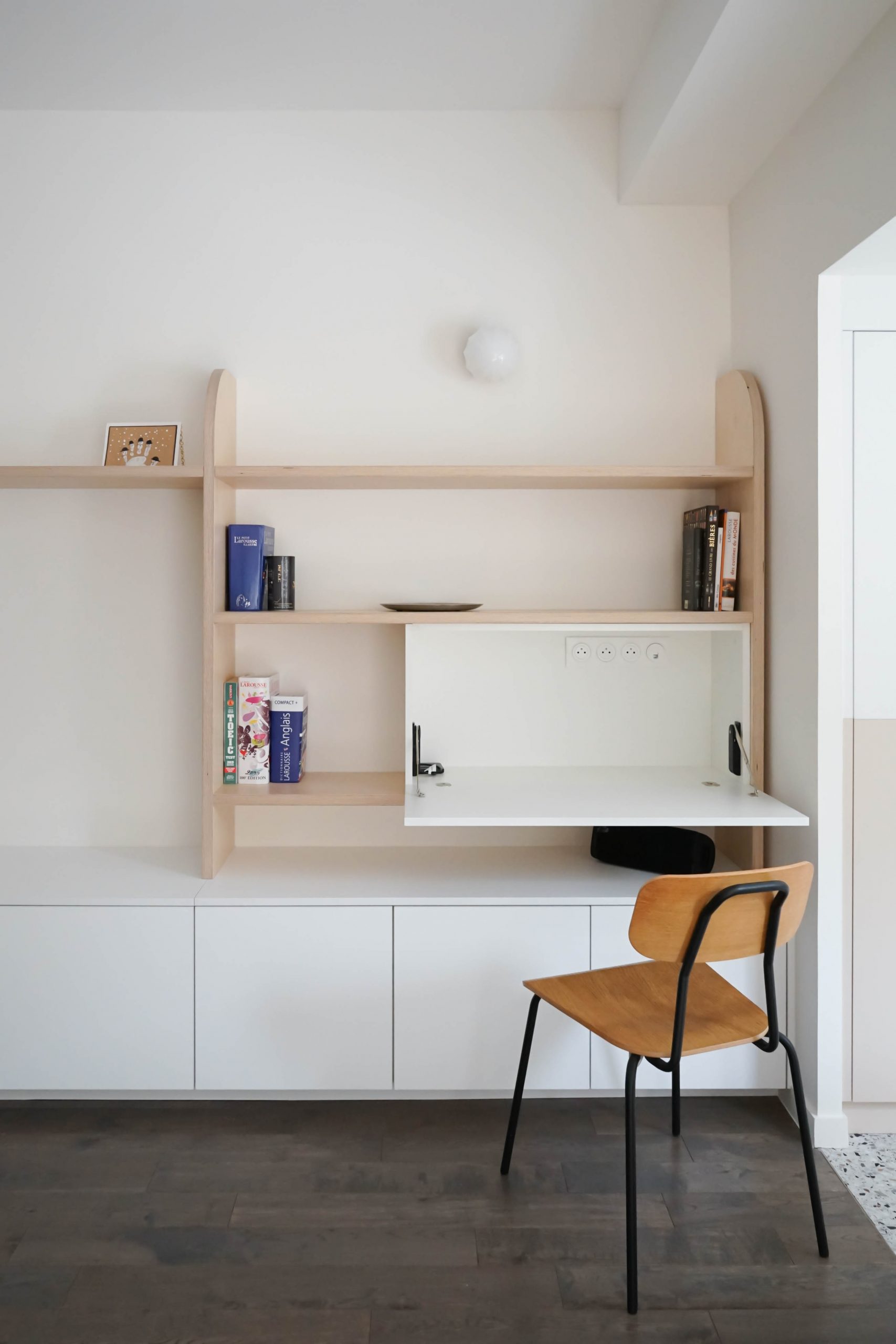 Dans le salon, chaque recoin a été optimisé : une bibliothèque intégrée se transforme en bureau d’appoint, tandis qu’un meuble TV sur-mesure, filant et aérien, offre de généreux rangements tout en allégeant visuellement la pièce. L’utilisation d’un bois clair type bouleau réchauffe l’atmosphère et apporte de la luminosité à cet espace naturellement sombre.