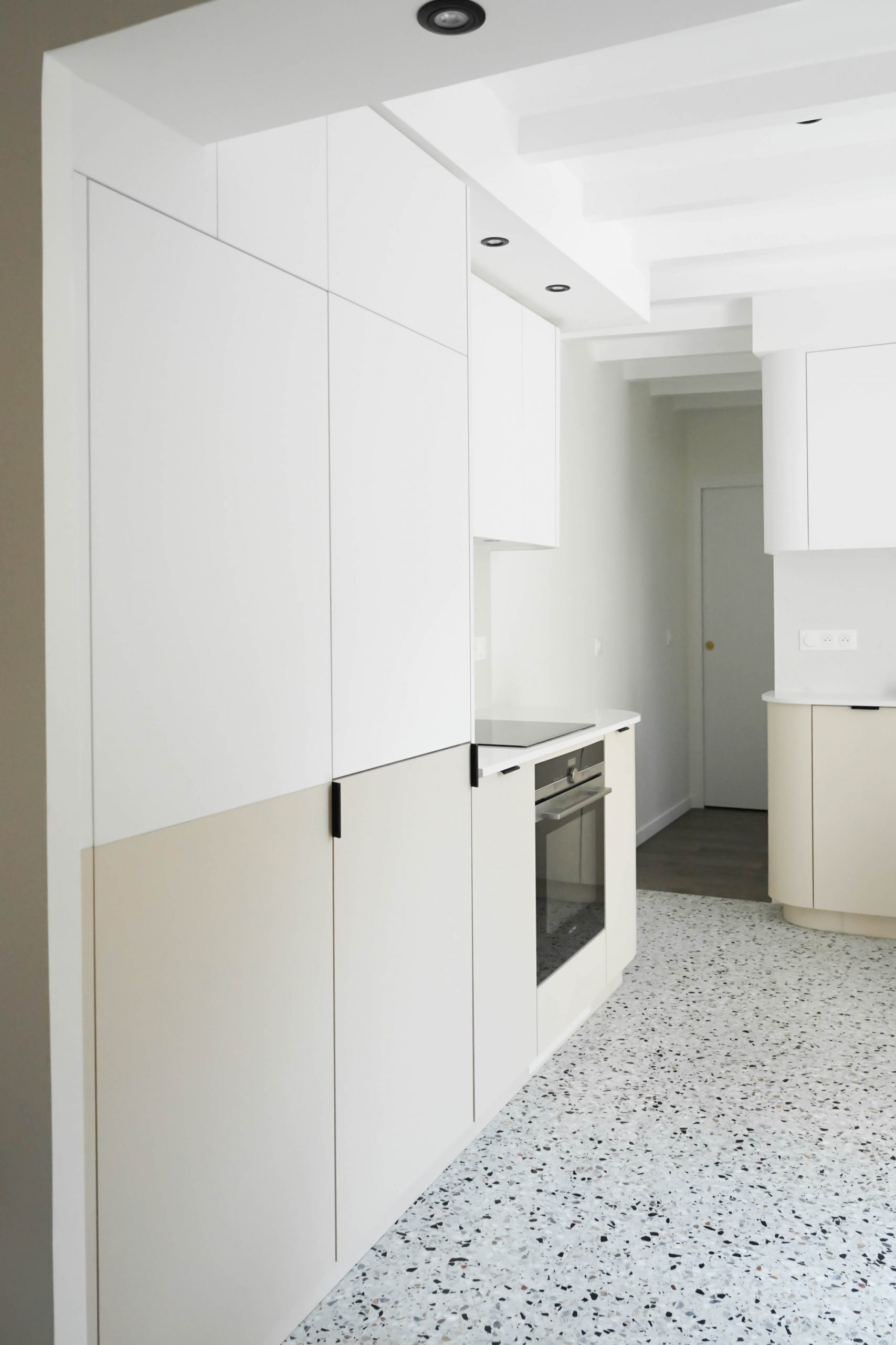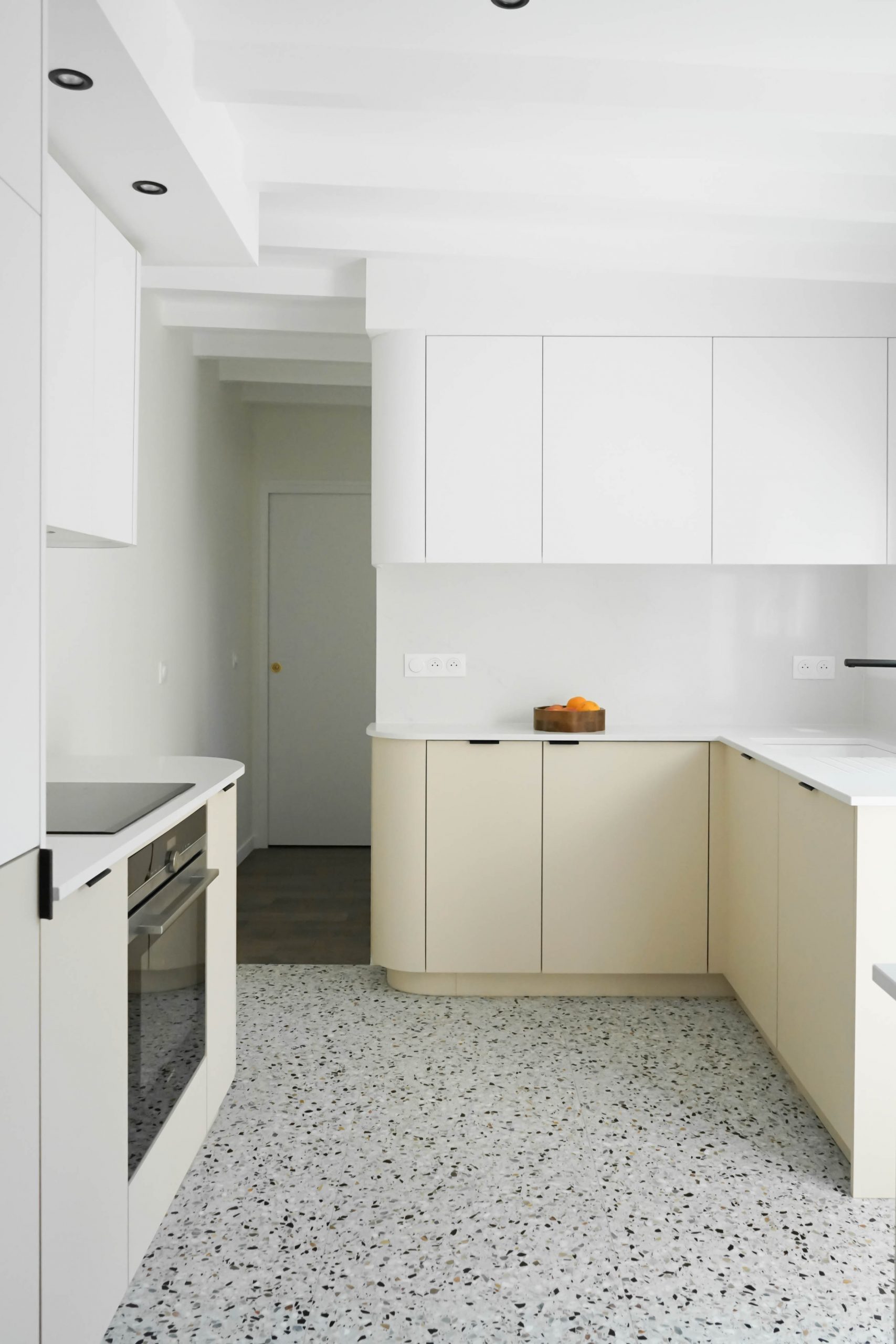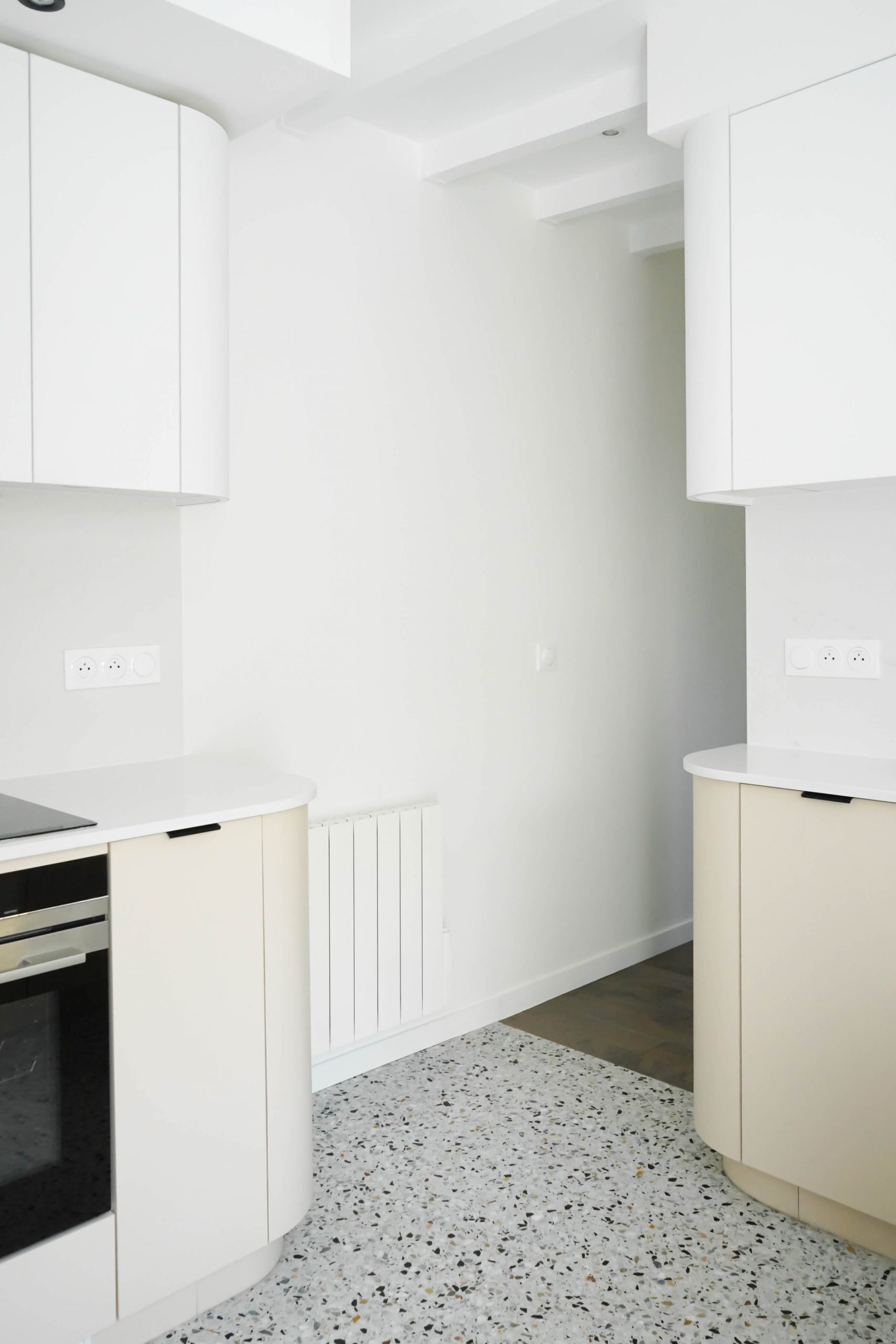 La cuisine, au cœur de la distribution, présentait une configuration complexe : ouverte sur le salon, traversante vers la chambre parentale et donnant également accès à la terrasse. Organisée en trois parties, elle a été repensée pour rester fonctionnelle tout en offrant une esthétique cohérente. Une composition bicolore aux teintes poudrées — beige et rose doux — associée à des touches de noir et un sol en terrazzo discret valorise l’ensemble avec subtilité.