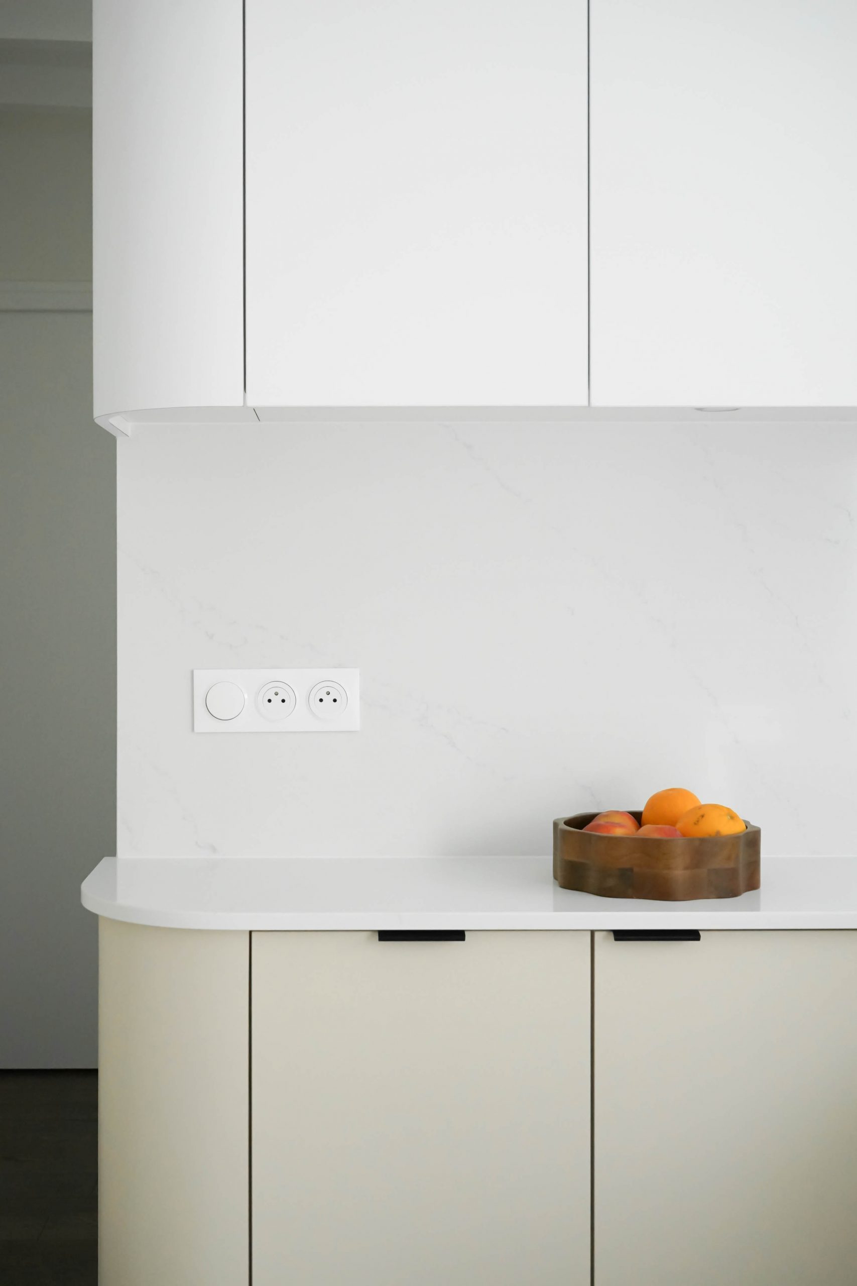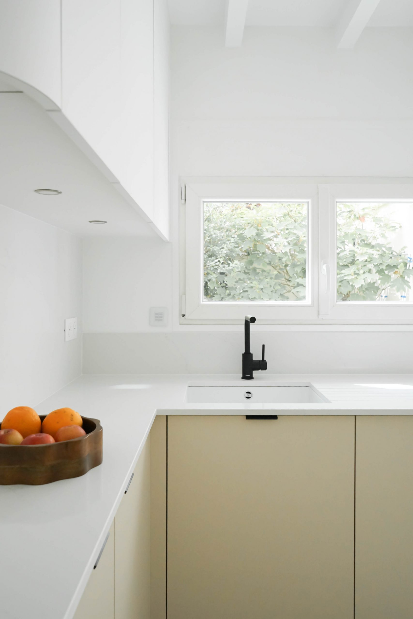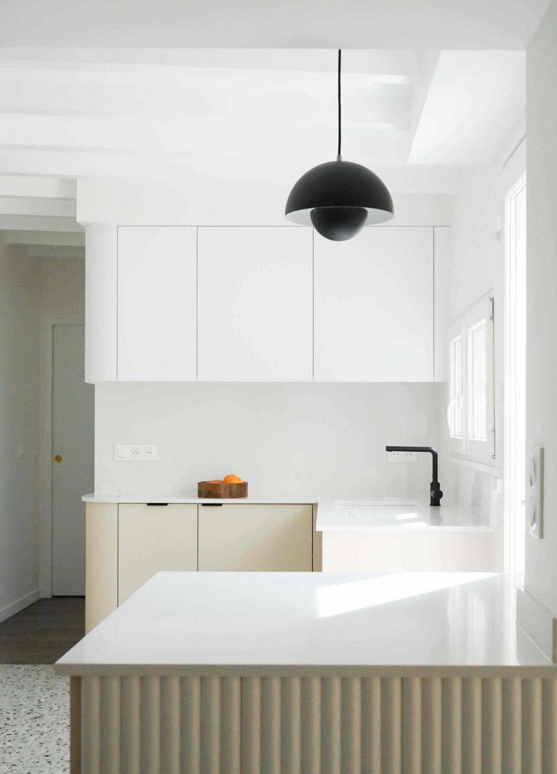 La cuisine, au cœur de la distribution, présentait une configuration complexe : ouverte sur le salon, traversante vers la chambre parentale et donnant également accès à la terrasse. Organisée en trois parties, elle a été repensée pour rester fonctionnelle tout en offrant une esthétique cohérente. Une composition bicolore aux teintes poudrées — beige et rose doux — associée à des touches de noir et un sol en terrazzo discret valorise l’ensemble avec subtilité.