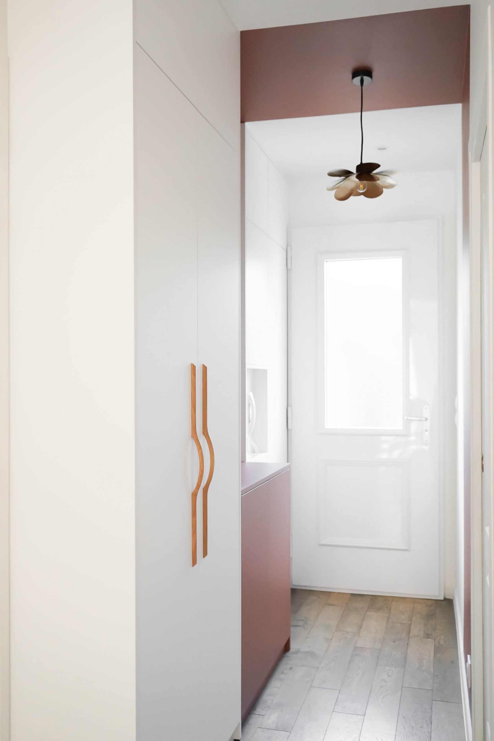 Enfin, l’entrée, étroite et peu fonctionnelle, a été transformée grâce à un mobilier sur-mesure de faible profondeur, combinant penderie, rangements pour chaussures, vide-poche et intégration des éléments techniques, dans une palette chaleureuse et cohérente avec le reste de l’appartement.