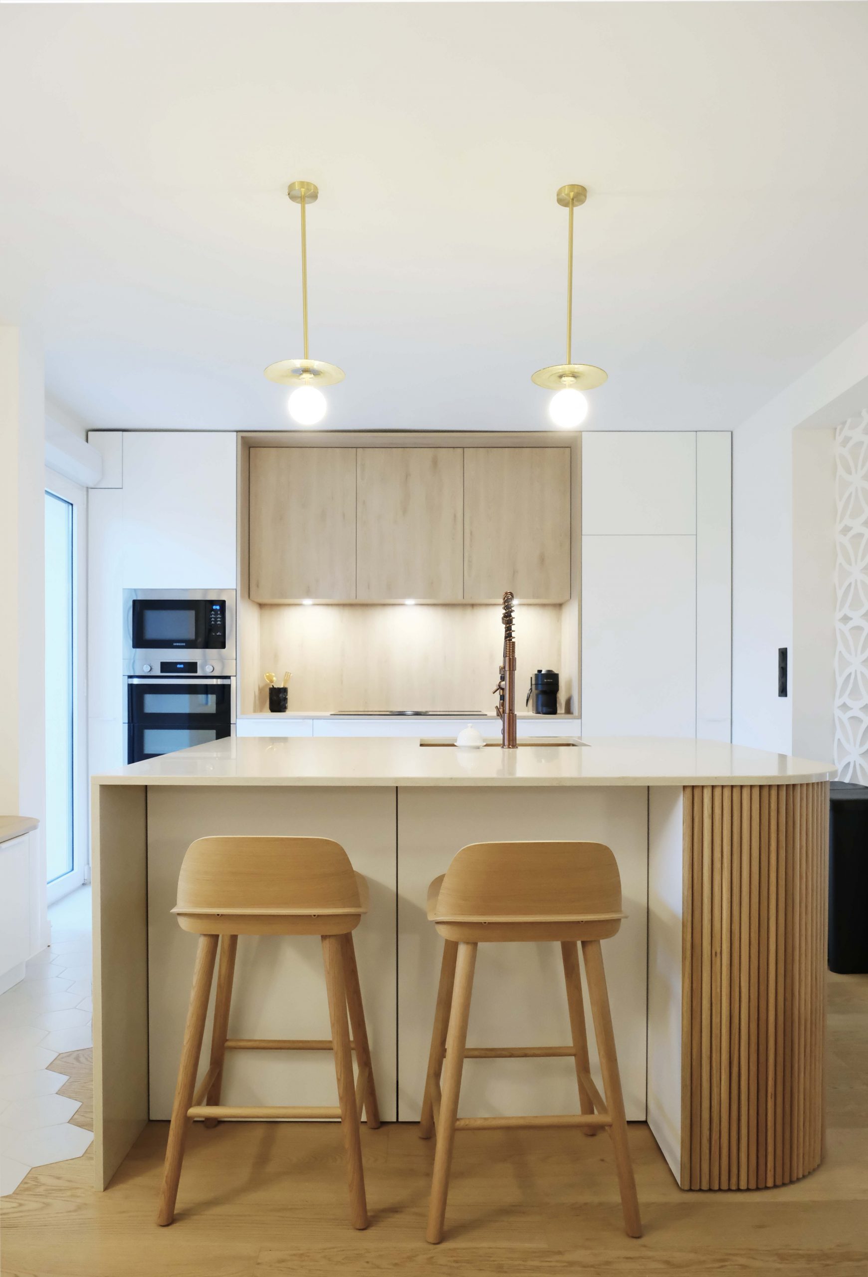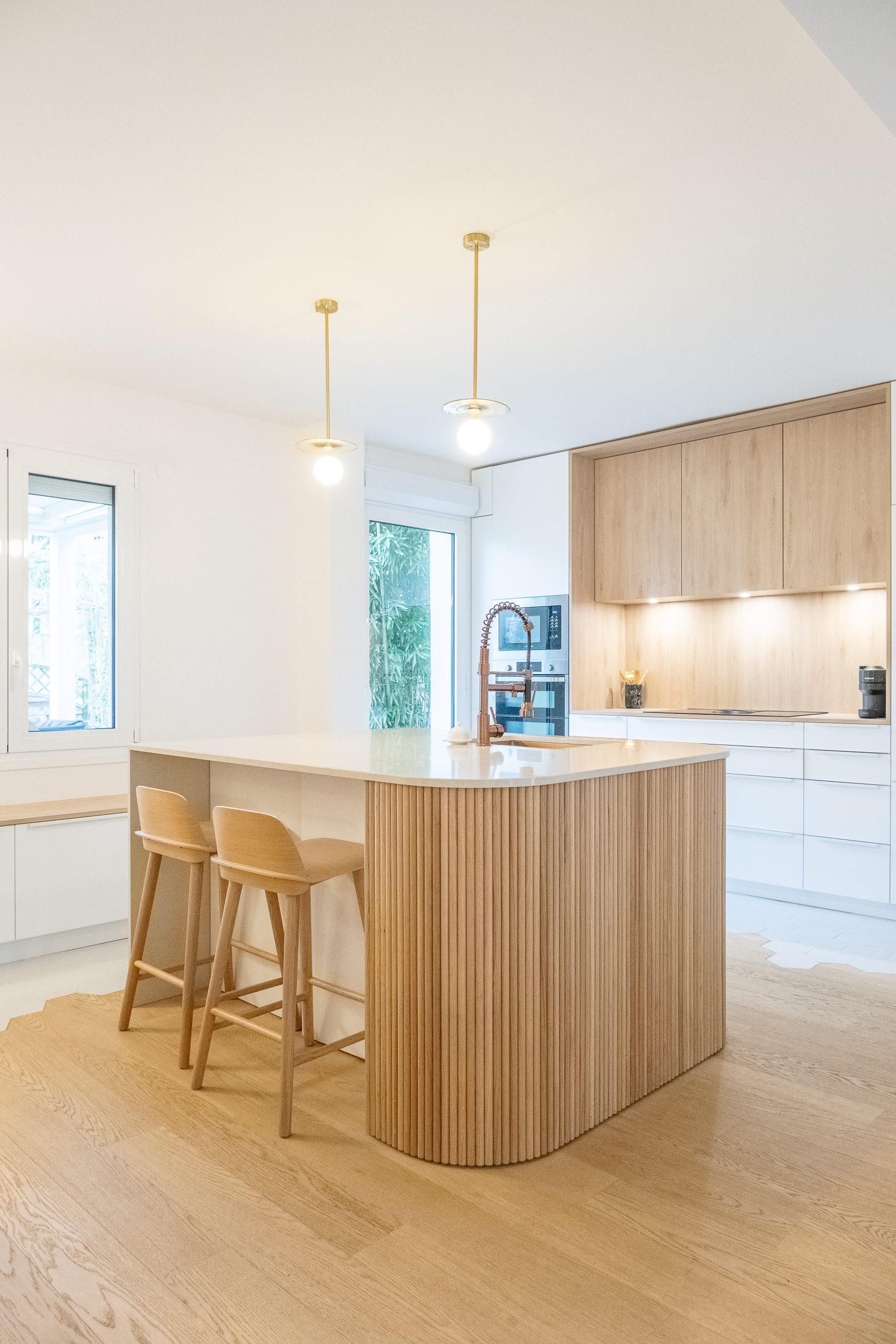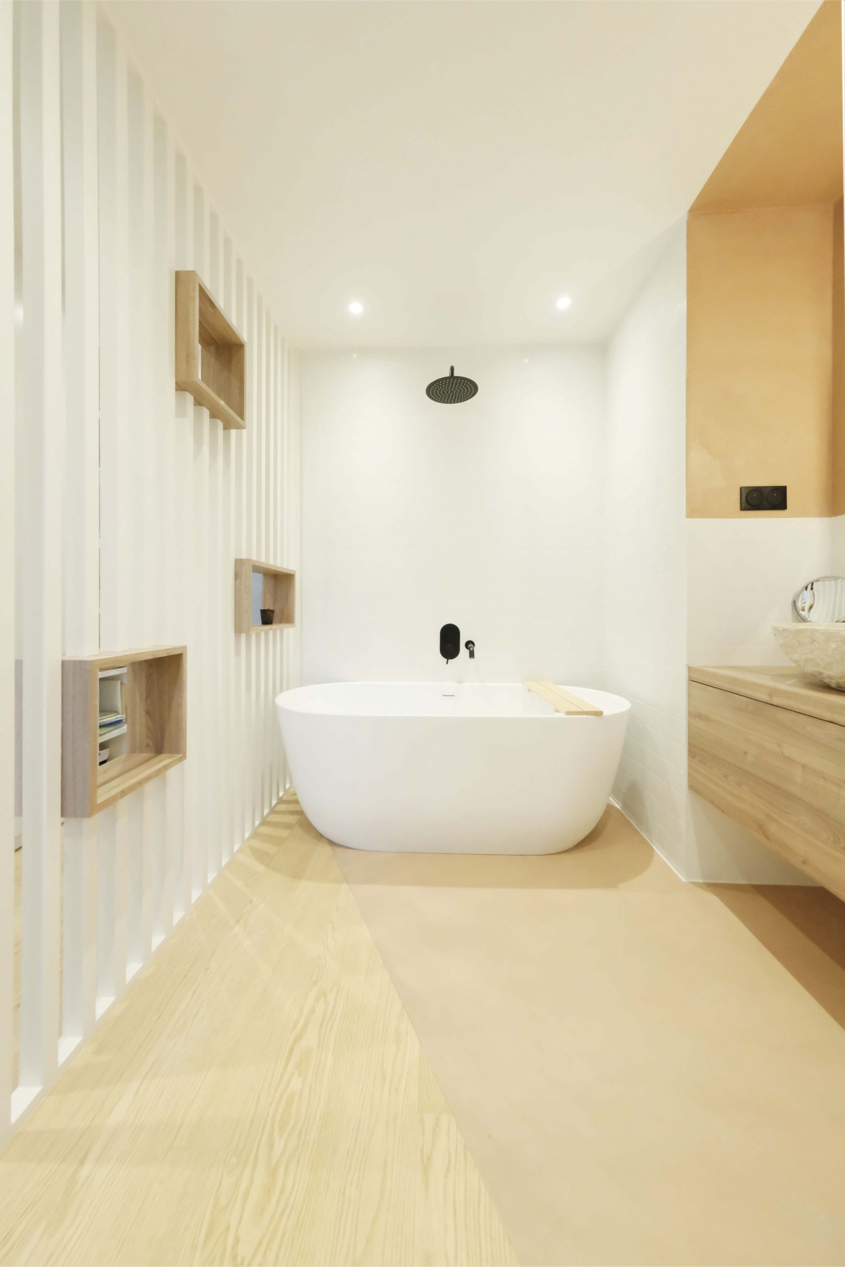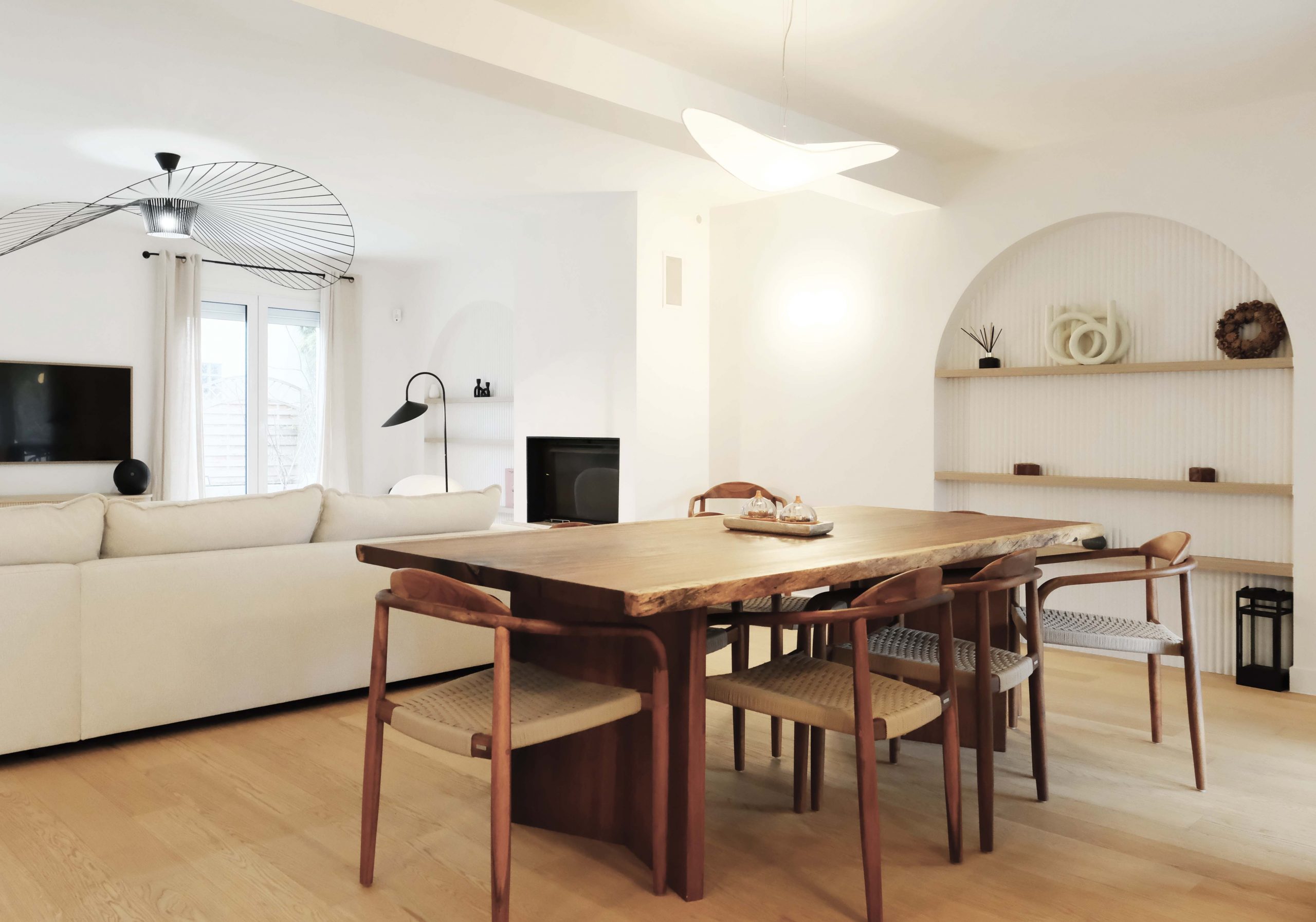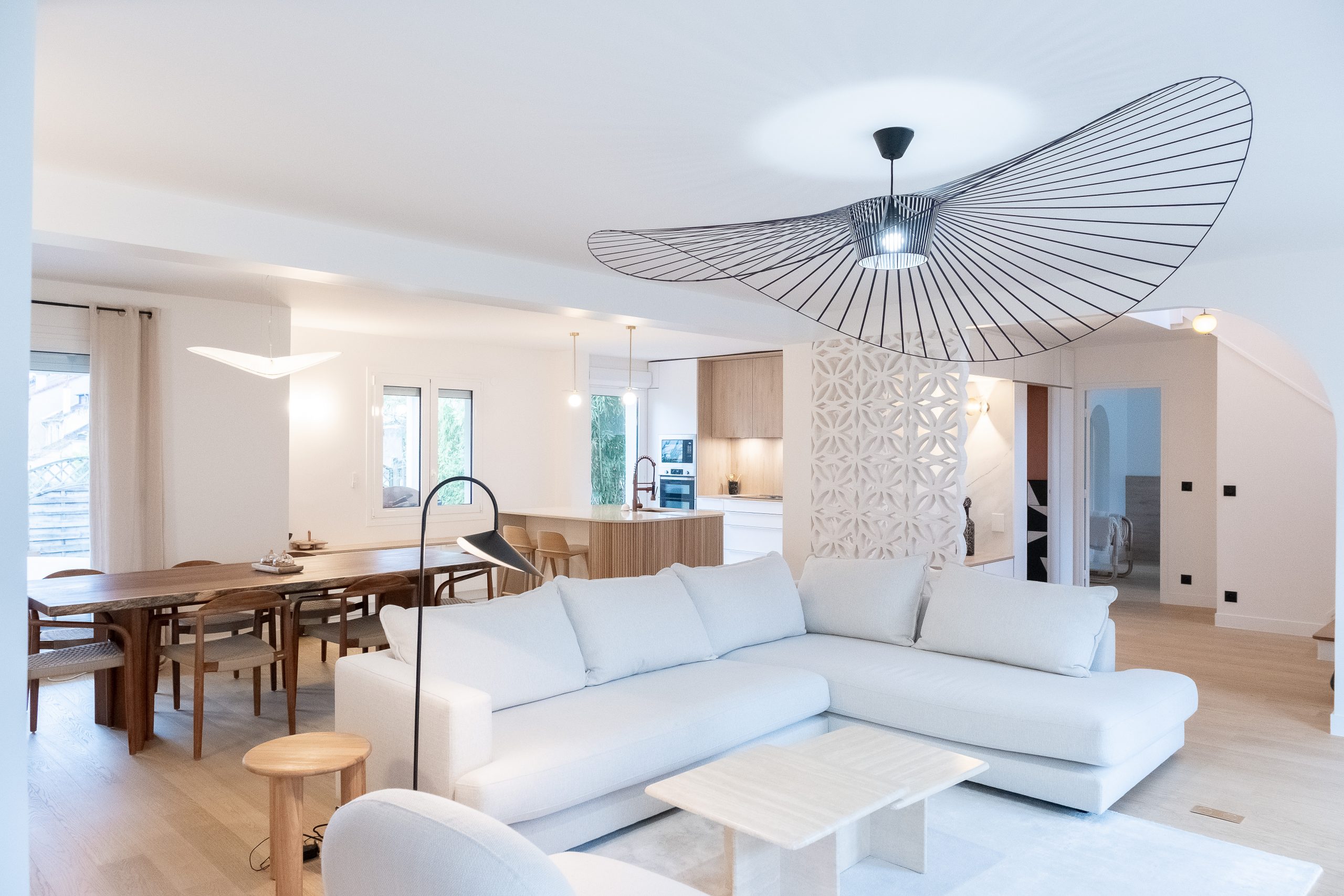 Les deux niveaux — rez-de-chaussée et étage — ont été entièrement repensés. Au rez-de-chaussée, l’espace de vie a été largement ouvert, avec la dépose d’un mur porteur et la pose d’un IPN de 8 mètres, afin d’optimiser la circulation et la lumière naturelle. La cuisine s’organise autour d’un îlot central, favorisant les échanges et la convivialité. Les tonalités dominantes — blanc, bois, béton — sont soulignées par un claustra en béton, des matériaux bruts élégants et un travail soigné sur les luminaires. Une salle de bain en béton ciré vient compléter l’ambiance contemporaine.