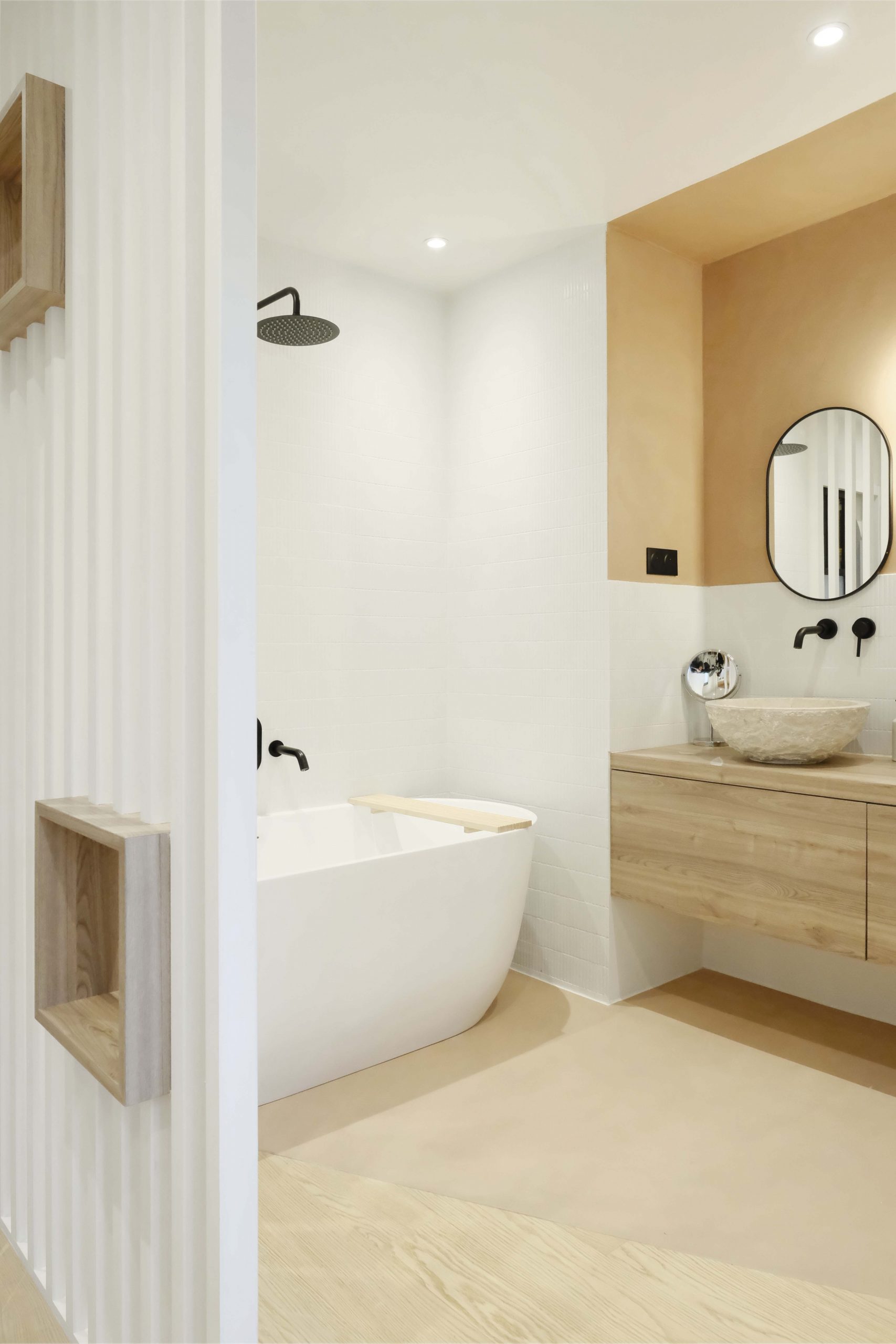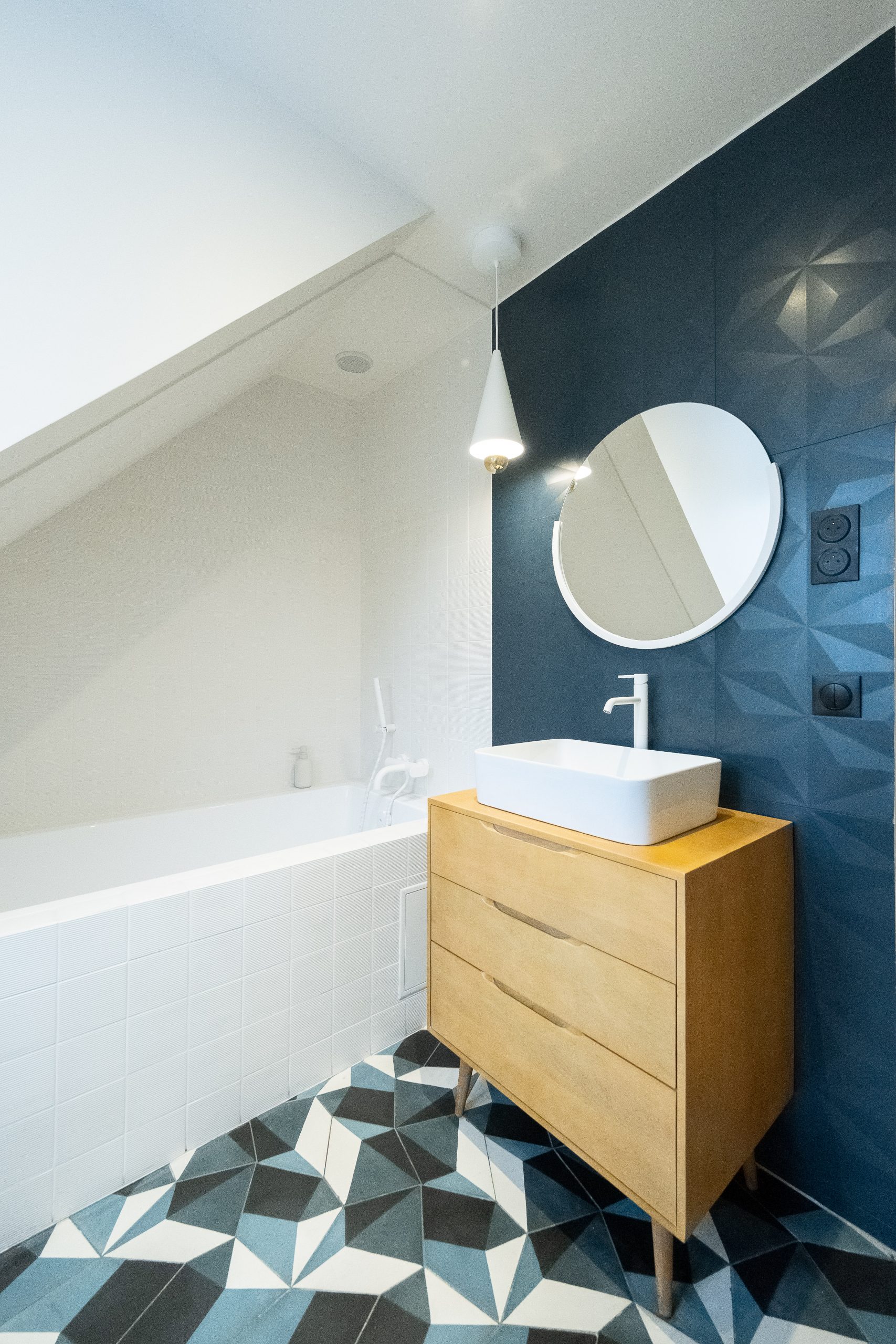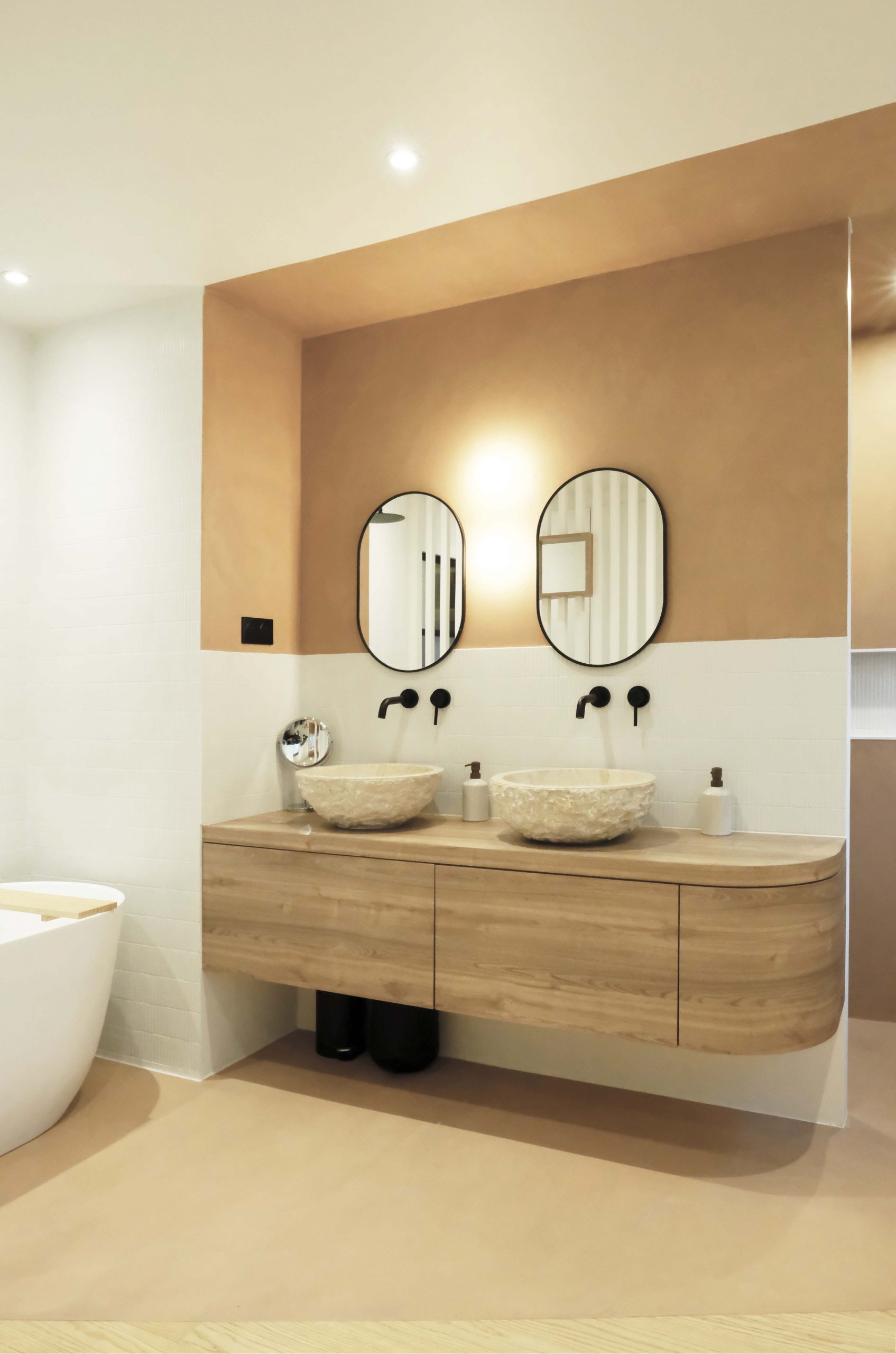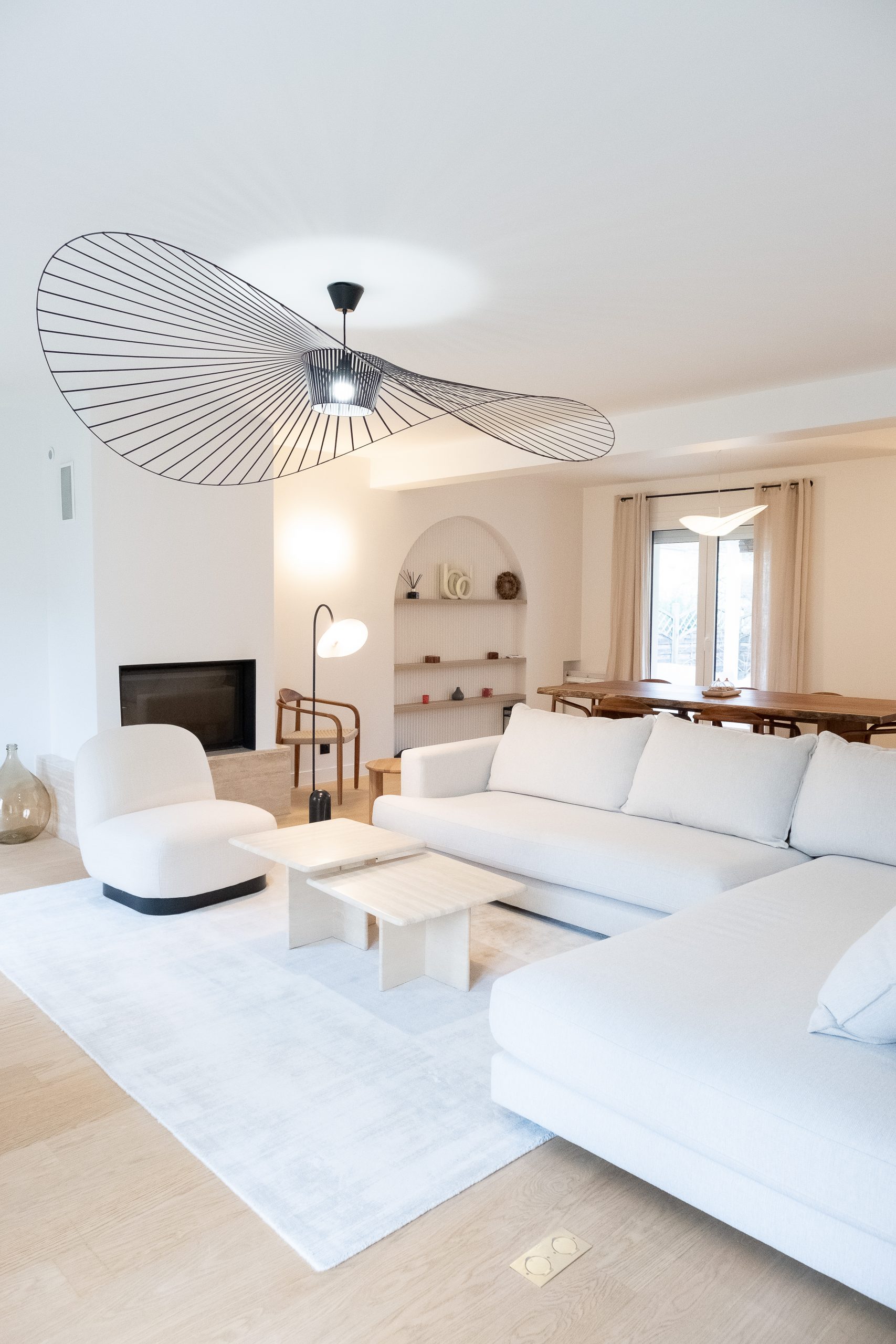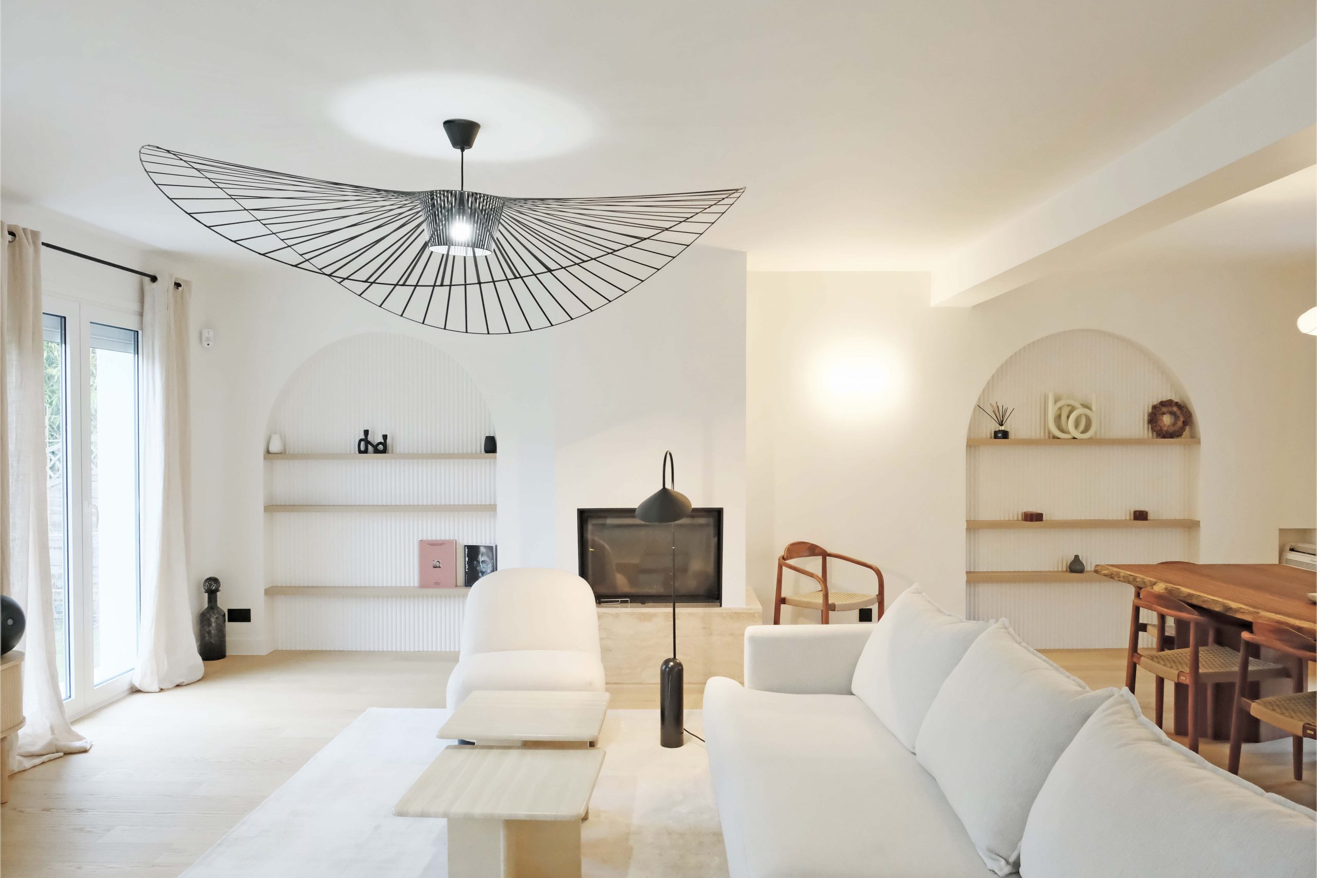 Les deux niveaux — rez-de-chaussée et étage — ont été entièrement repensés. Au rez-de-chaussée, l’espace de vie a été largement ouvert, avec la dépose d’un mur porteur et la pose d’un IPN de 8 mètres, afin d’optimiser la circulation et la lumière naturelle. La cuisine s’organise autour d’un îlot central, favorisant les échanges et la convivialité. Les tonalités dominantes — blanc, bois, béton — sont soulignées par un claustra en béton, des matériaux bruts élégants et un travail soigné sur les luminaires. Une salle de bain en béton ciré vient compléter l’ambiance contemporaine.