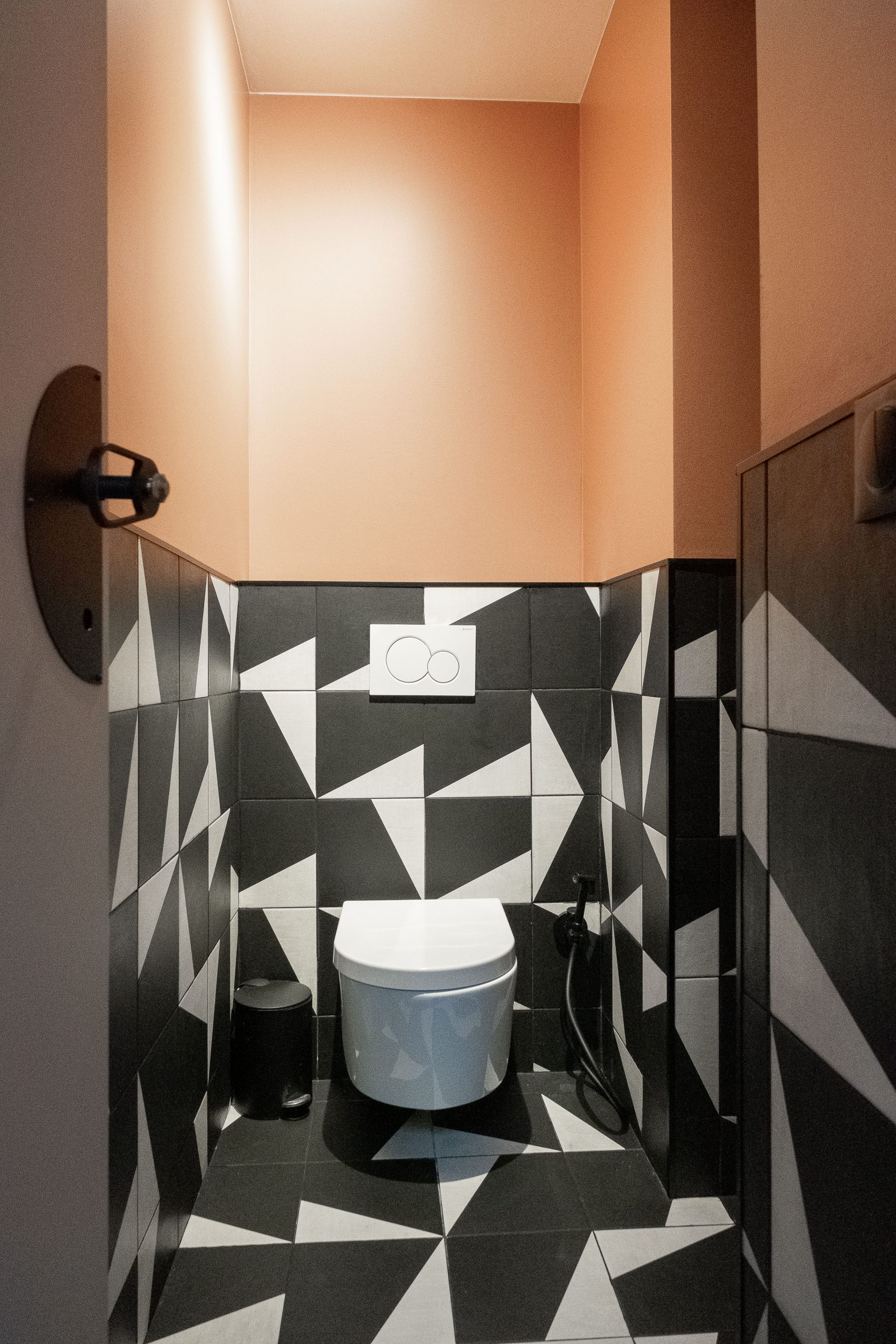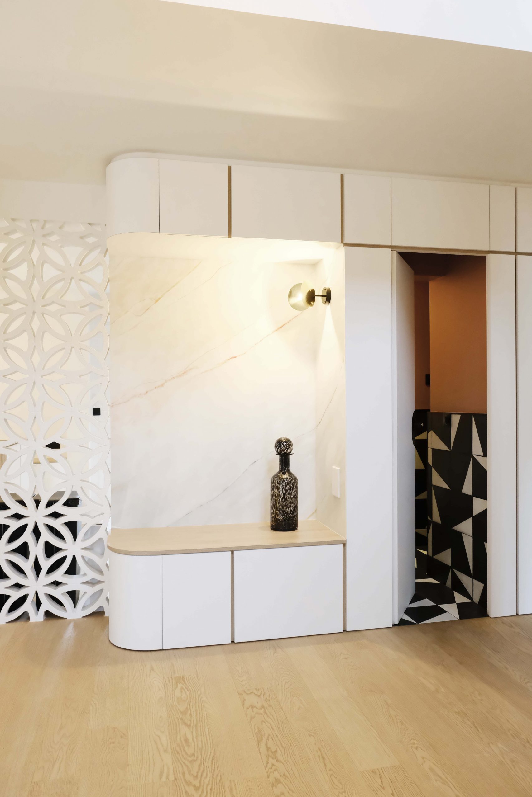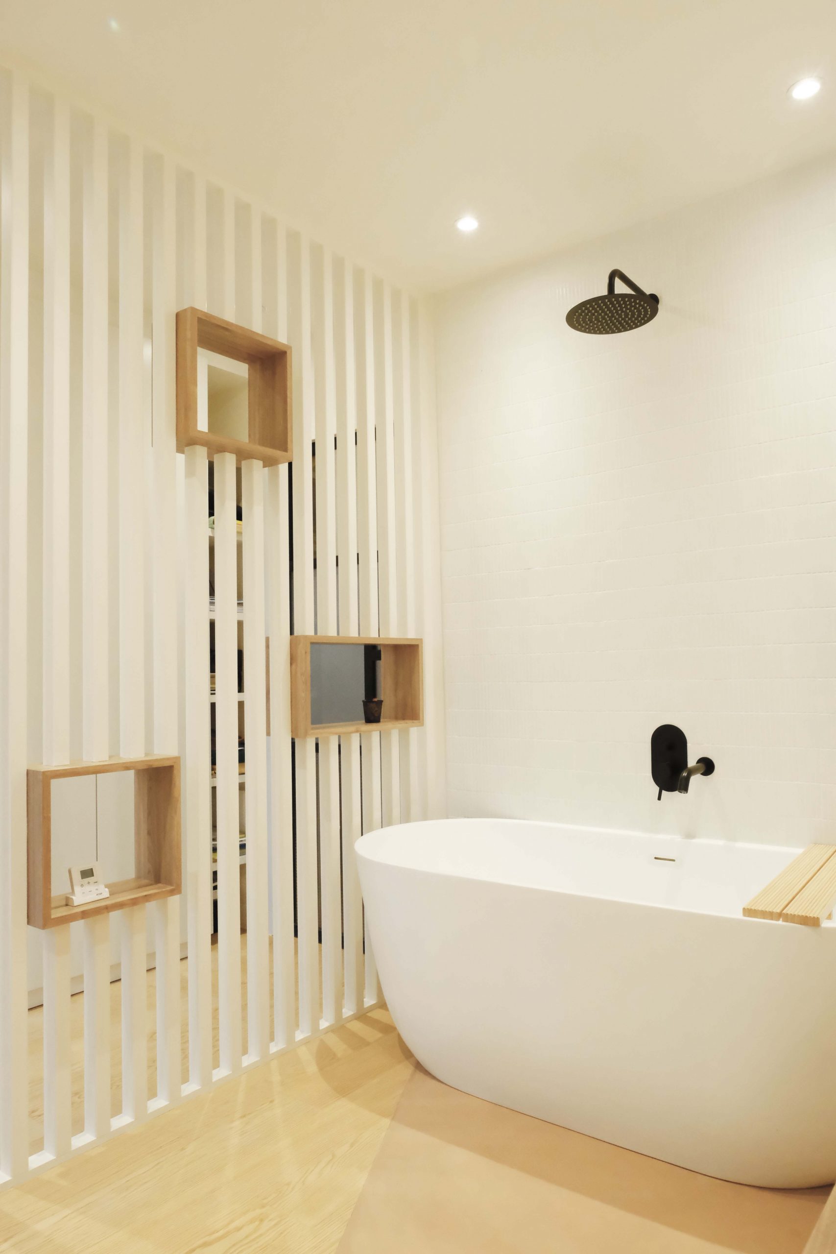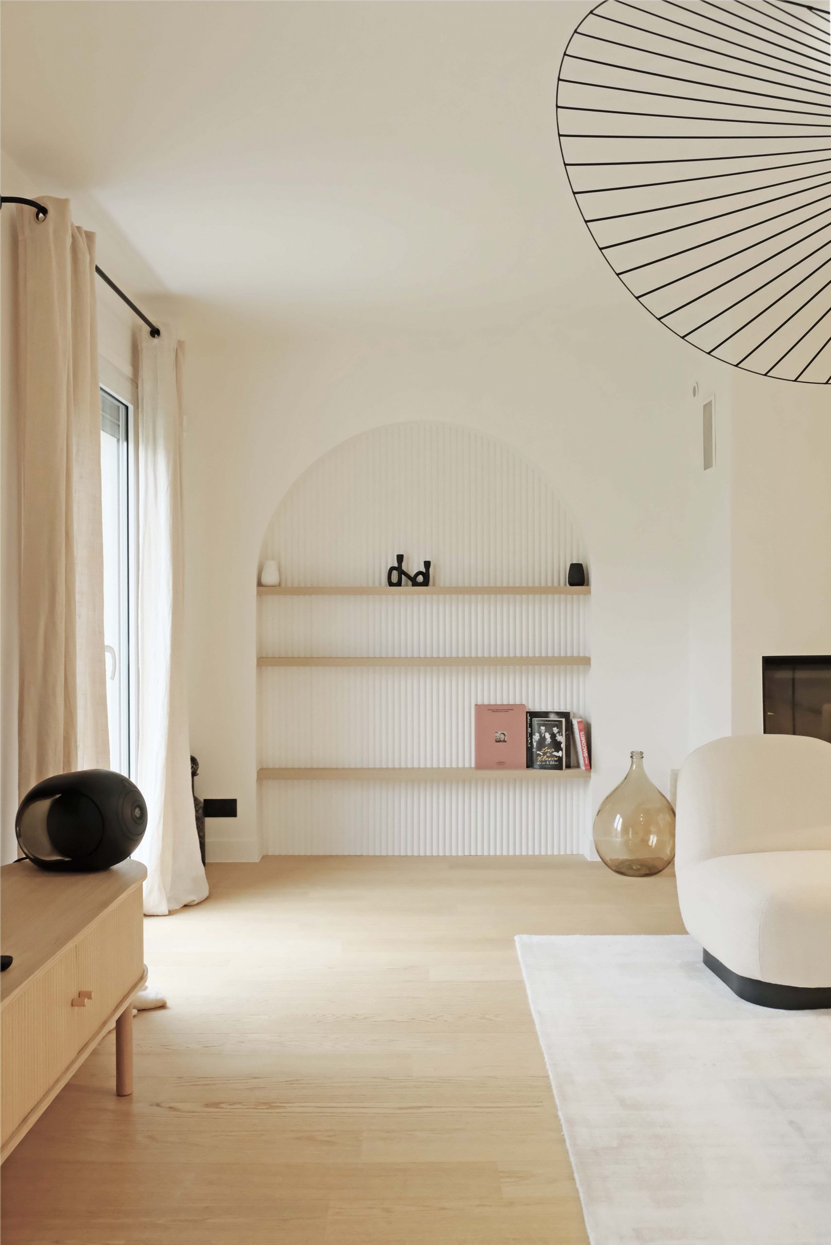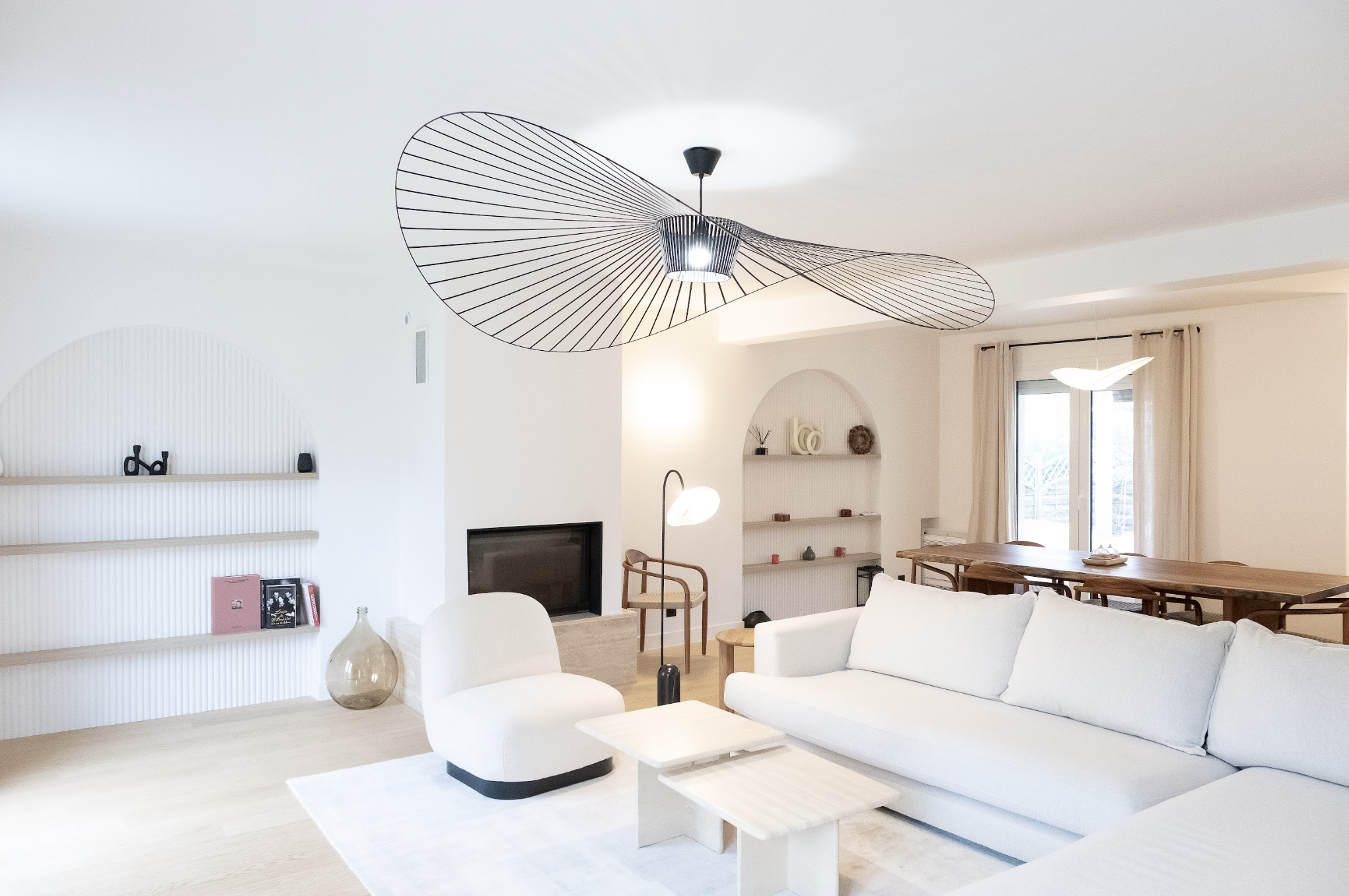 Les deux niveaux — rez-de-chaussée et étage — ont été entièrement repensés. Au rez-de-chaussée, l’espace de vie a été largement ouvert, avec la dépose d’un mur porteur et la pose d’un IPN de 8 mètres, afin d’optimiser la circulation et la lumière naturelle. La cuisine s’organise autour d’un îlot central, favorisant les échanges et la convivialité. Les tonalités dominantes — blanc, bois, béton — sont soulignées par un claustra en béton, des matériaux bruts élégants et un travail soigné sur les luminaires. Une salle de bain en béton ciré vient compléter l’ambiance contemporaine.