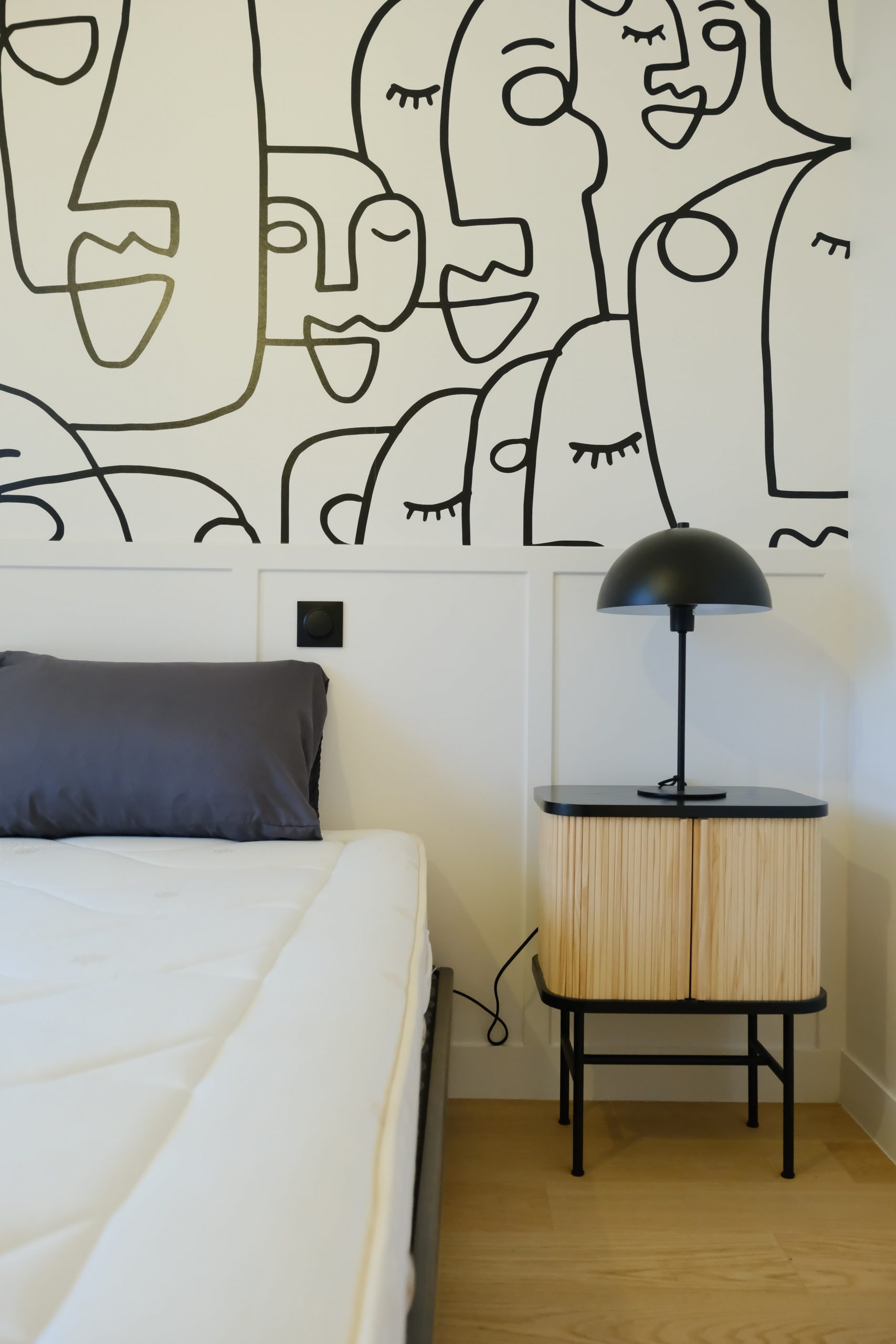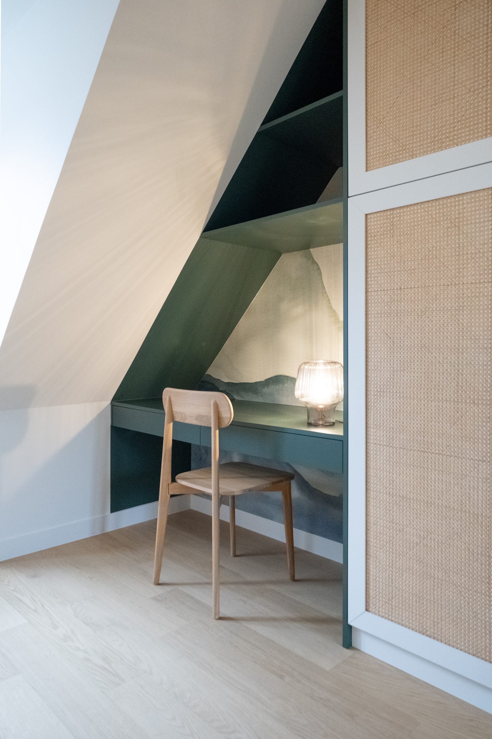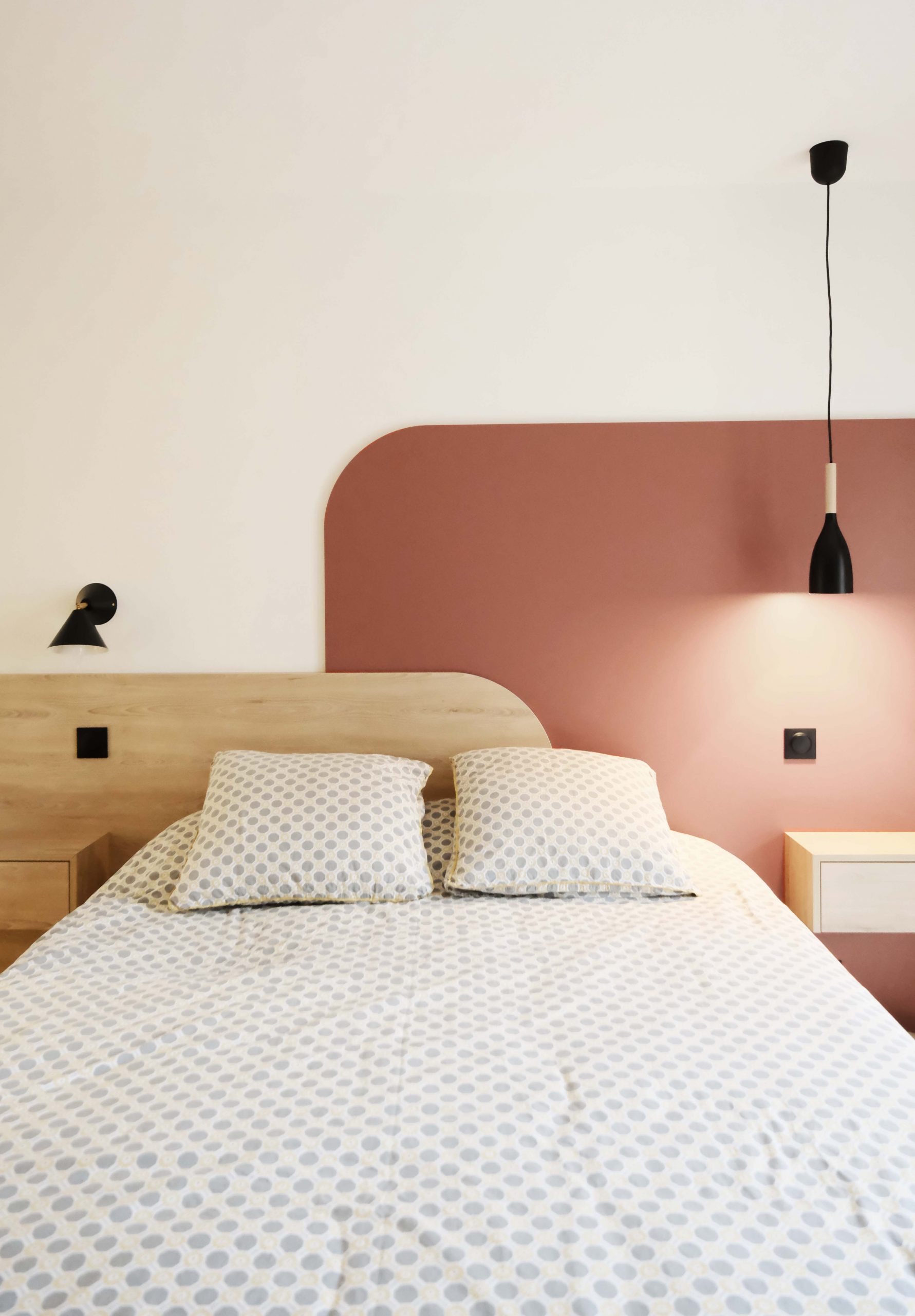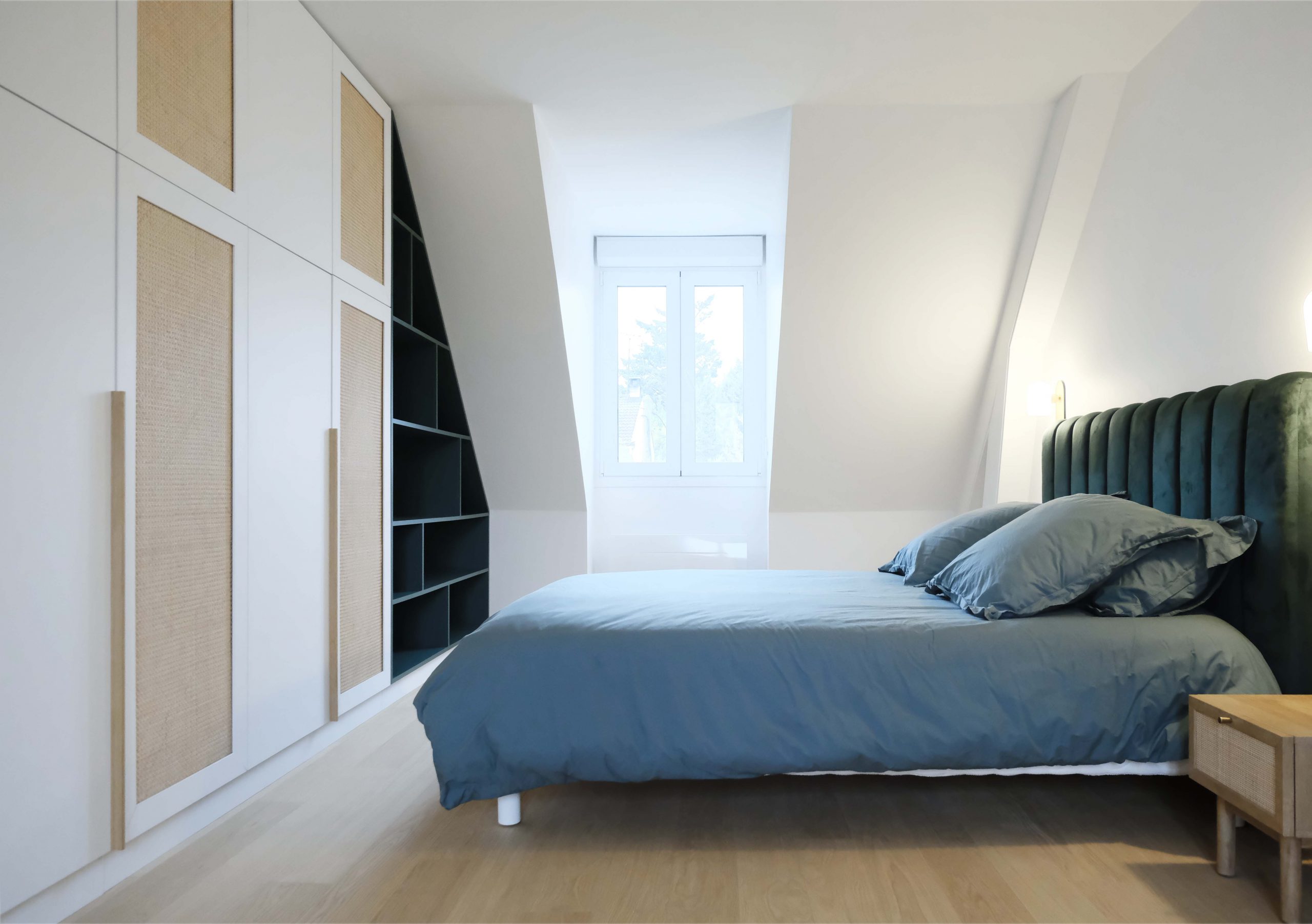 À l’étage, chaque chambre affirme une personnalité distincte grâce à un jeu de couleurs audacieux et à des têtes de lit dessinées sur mesure. L’escalier a été modernisé avec un garde-corps vitré, apportant légèreté et transparence. De nombreux aménagements sur mesure ont été intégrés pour renforcer le confort et le caractère du lieu. Le projet a également inclus des interventions techniques et extérieures : remplacement des fenêtres, ravalement de façade, sols extérieurs refaits, installation d’une climatisation — une rénovation globale pensée pour inscrire cette maison dans une nouvelle époque, sans perdre son âme familiale.