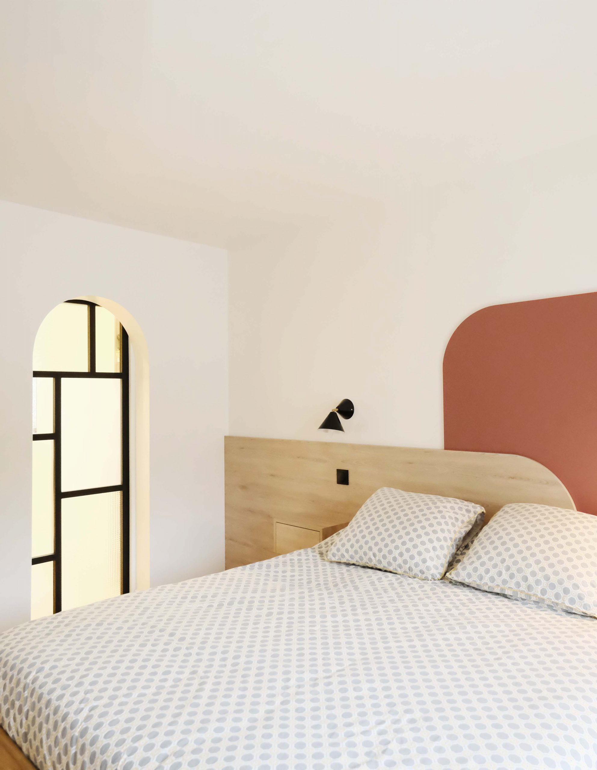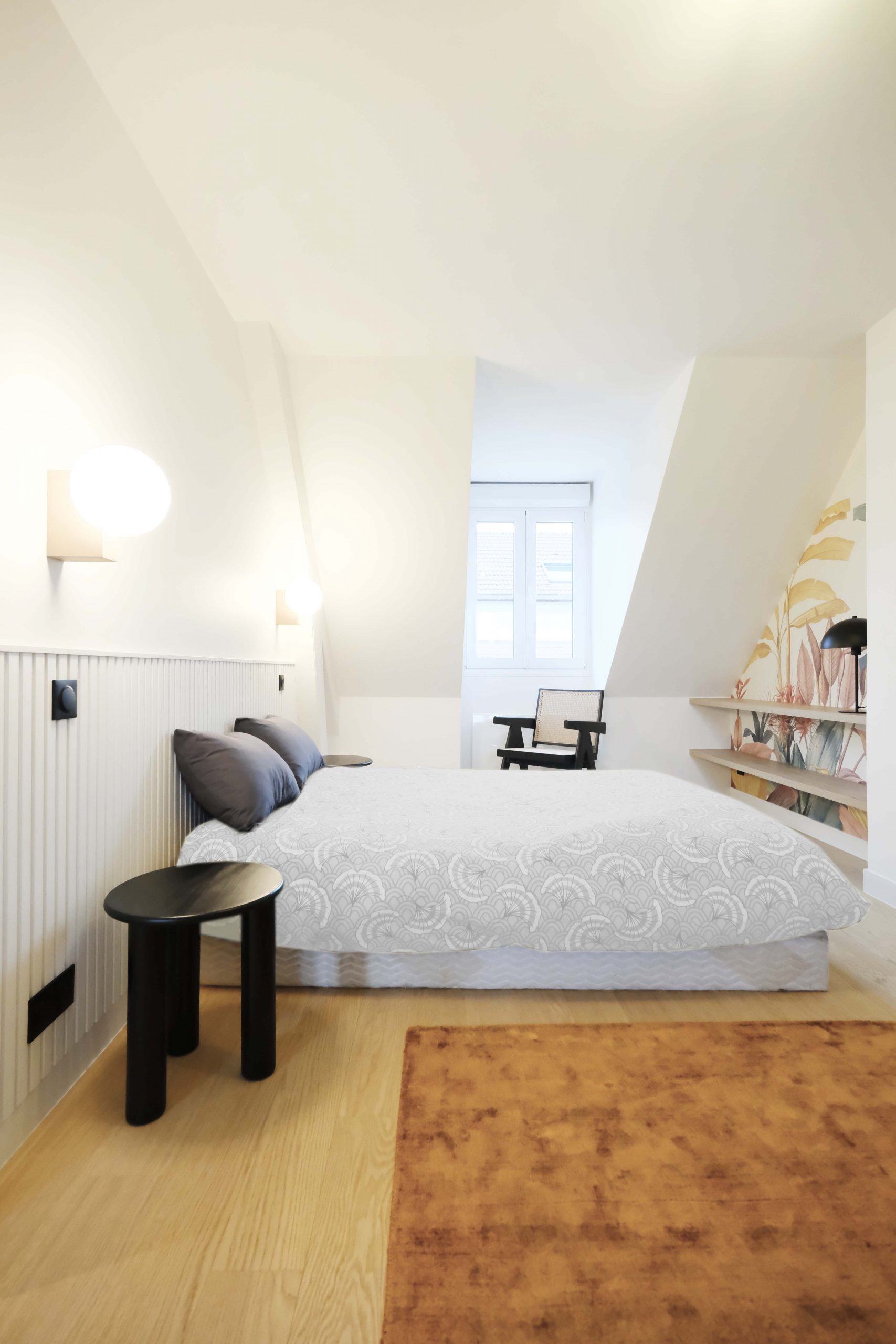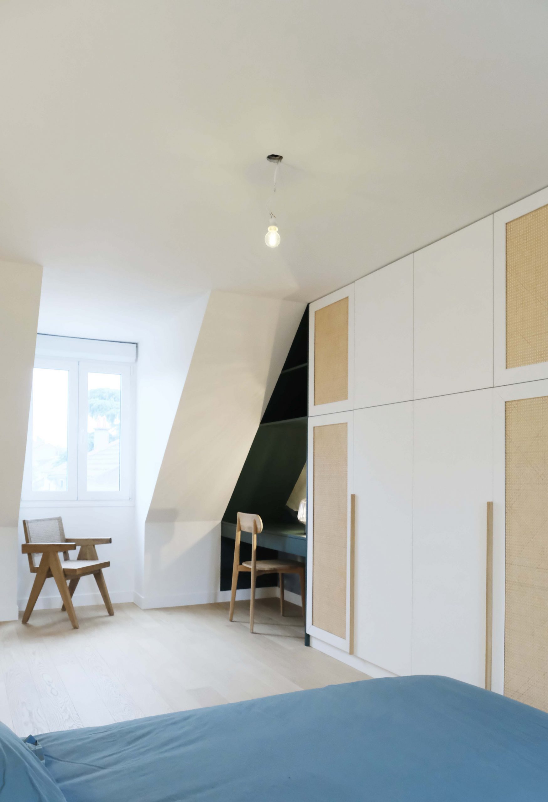 À l’étage, chaque chambre affirme une personnalité distincte grâce à un jeu de couleurs audacieux et à des têtes de lit dessinées sur mesure. L’escalier a été modernisé avec un garde-corps vitré, apportant légèreté et transparence. De nombreux aménagements sur mesure ont été intégrés pour renforcer le confort et le caractère du lieu. Le projet a également inclus des interventions techniques et extérieures : remplacement des fenêtres, ravalement de façade, sols extérieurs refaits, installation d’une climatisation — une rénovation globale pensée pour inscrire cette maison dans une nouvelle époque, sans perdre son âme familiale.