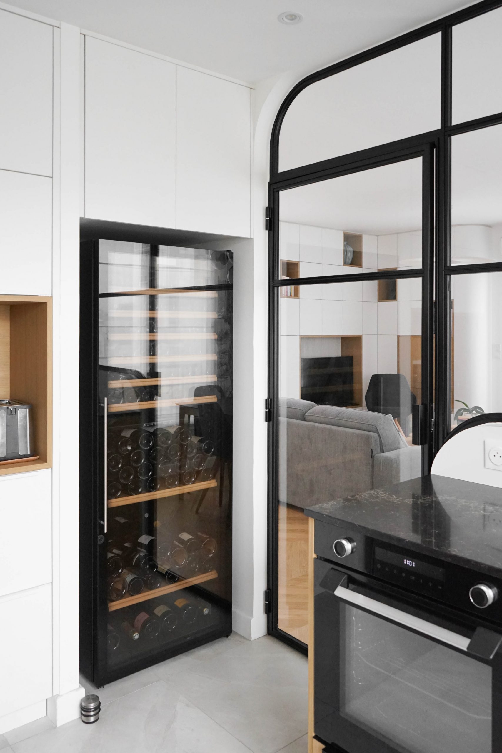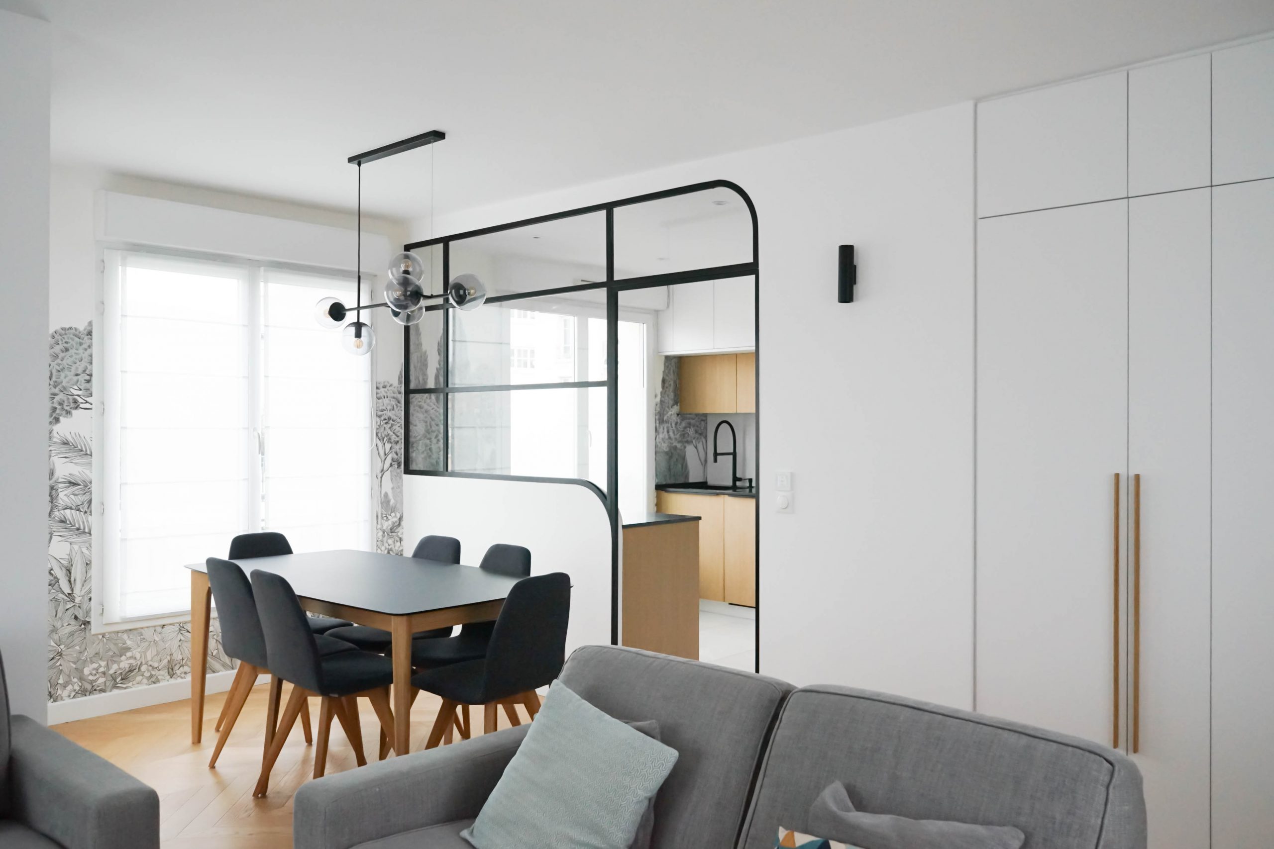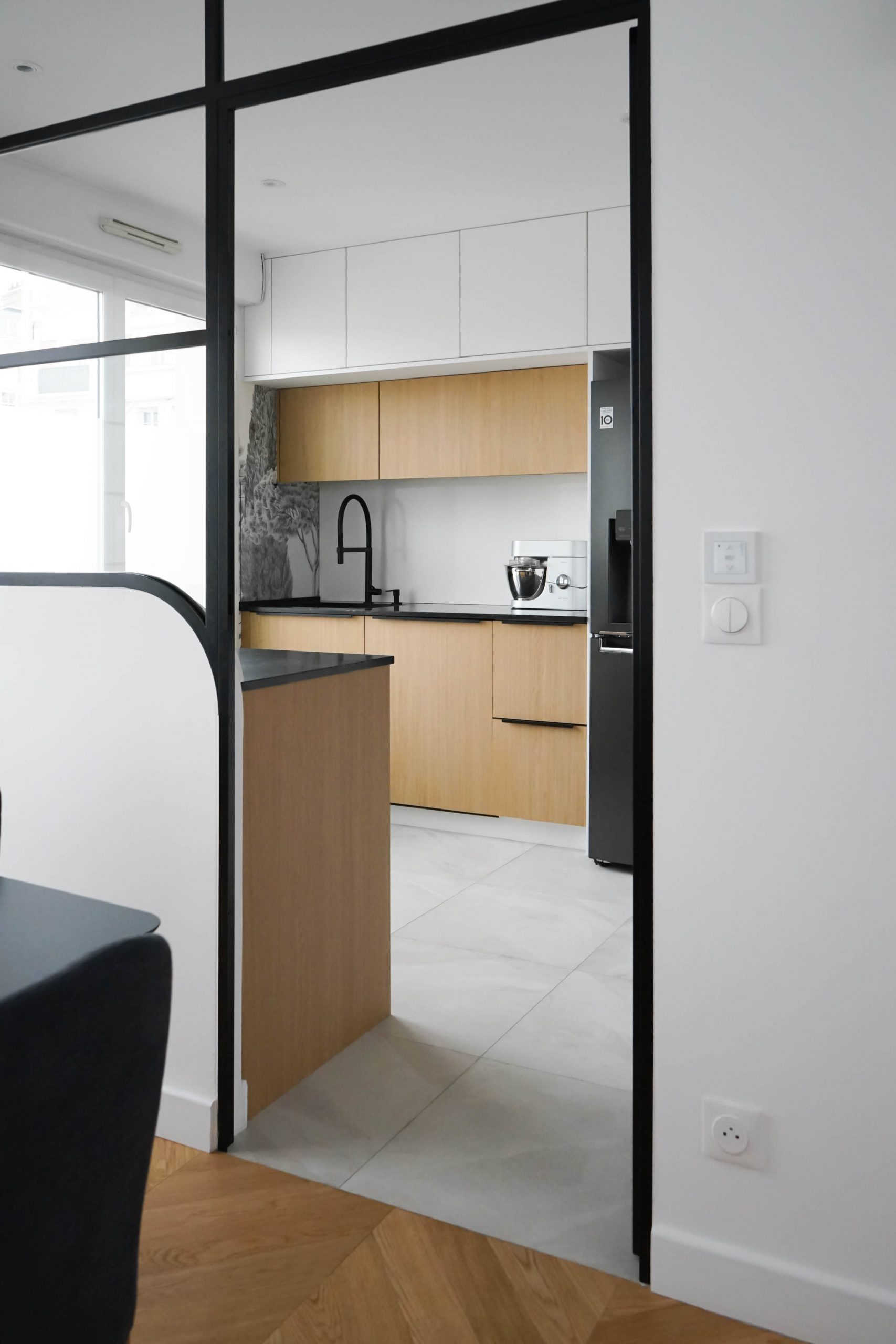 Situé au dernier étage d’un immeuble à La Garenne-Colombes, cet appartement de 100 m² a été entièrement repensé pour accueillir une famille de cinq personnes. Faute de trouver un nouveau bien adapté à leur budget, les propriétaires ont choisi d’optimiser leur logement actuel afin d’y intégrer toutes les pièces essentielles à leur quotidien. Le projet a débuté par un retravail minutieux du plan, avec un objectif clair : ne perdre aucun mètre carré. La nouvelle distribution comprend désormais quatre chambres (dont une suite parentale avec salle de bain), une seconde salle de bain, une buanderie et une cuisine judicieusement placée à proximité immédiate de l’espace de vie — contrairement à son implantation d’origine.