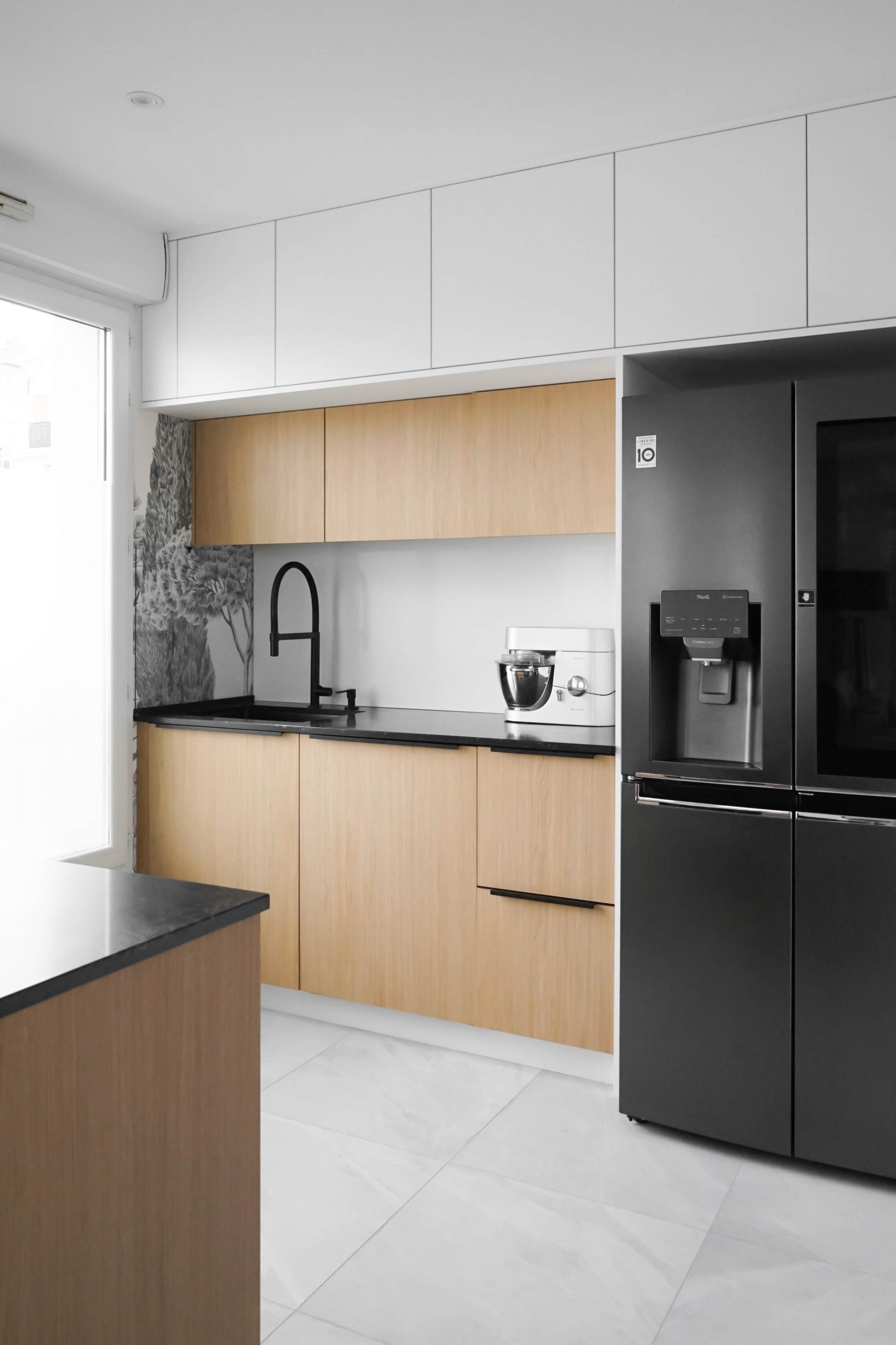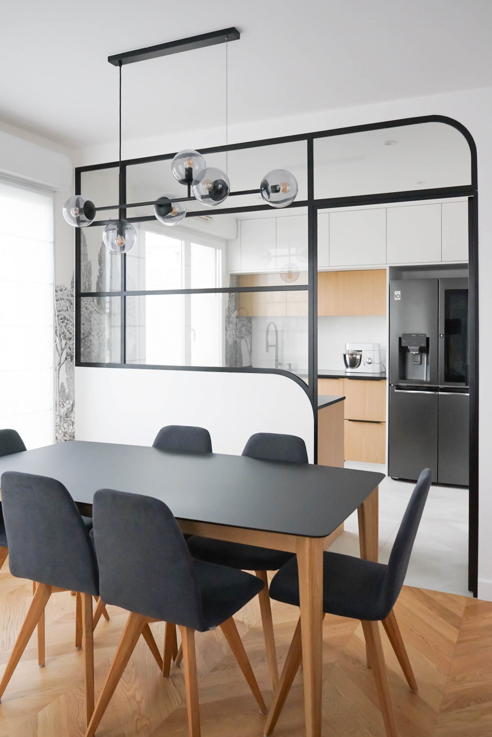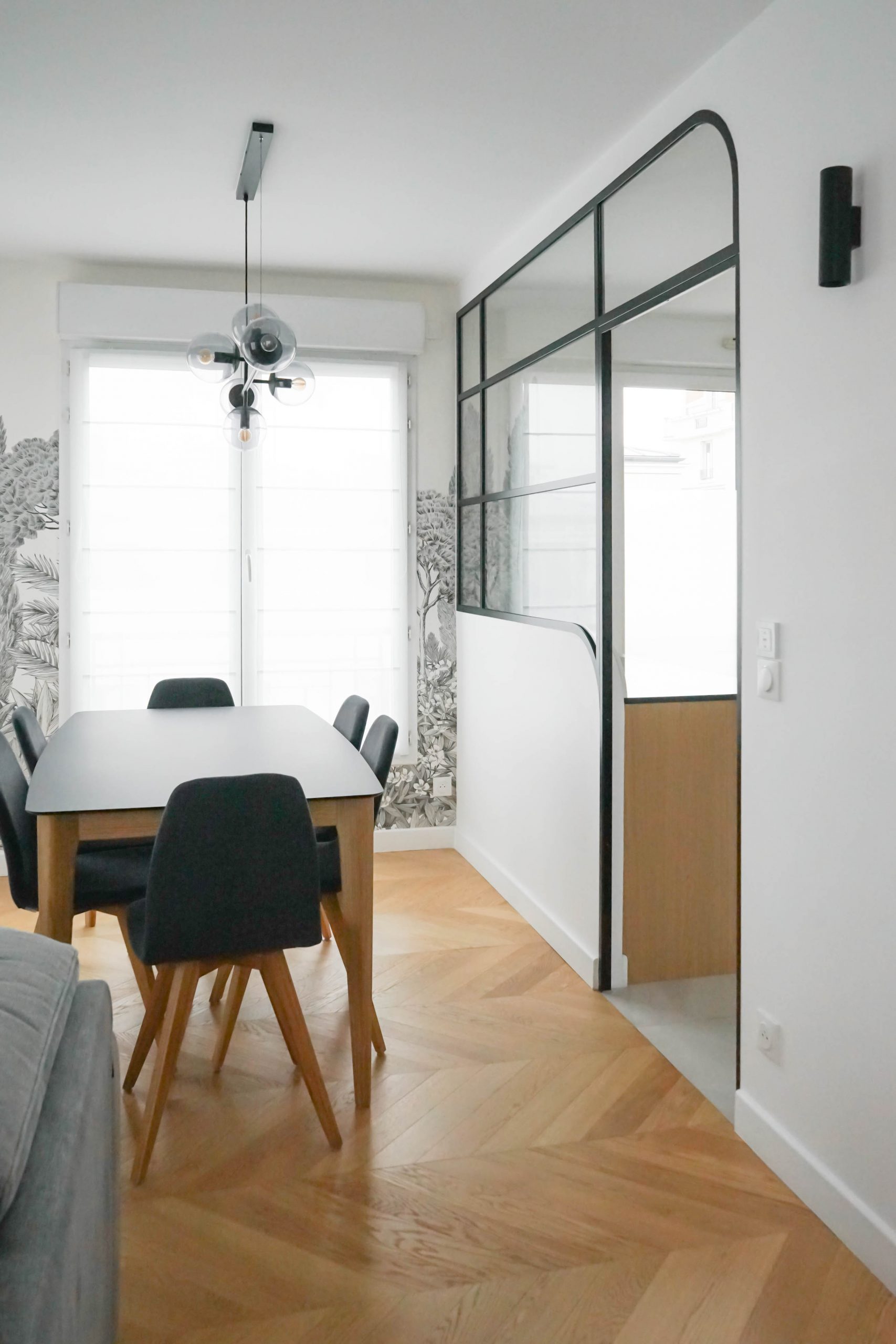 Situé au dernier étage d’un immeuble à La Garenne-Colombes, cet appartement de 100 m² a été entièrement repensé pour accueillir une famille de cinq personnes. Faute de trouver un nouveau bien adapté à leur budget, les propriétaires ont choisi d’optimiser leur logement actuel afin d’y intégrer toutes les pièces essentielles à leur quotidien. Le projet a débuté par un retravail minutieux du plan, avec un objectif clair : ne perdre aucun mètre carré. La nouvelle distribution comprend désormais quatre chambres (dont une suite parentale avec salle de bain), une seconde salle de bain, une buanderie et une cuisine judicieusement placée à proximité immédiate de l’espace de vie — contrairement à son implantation d’origine.