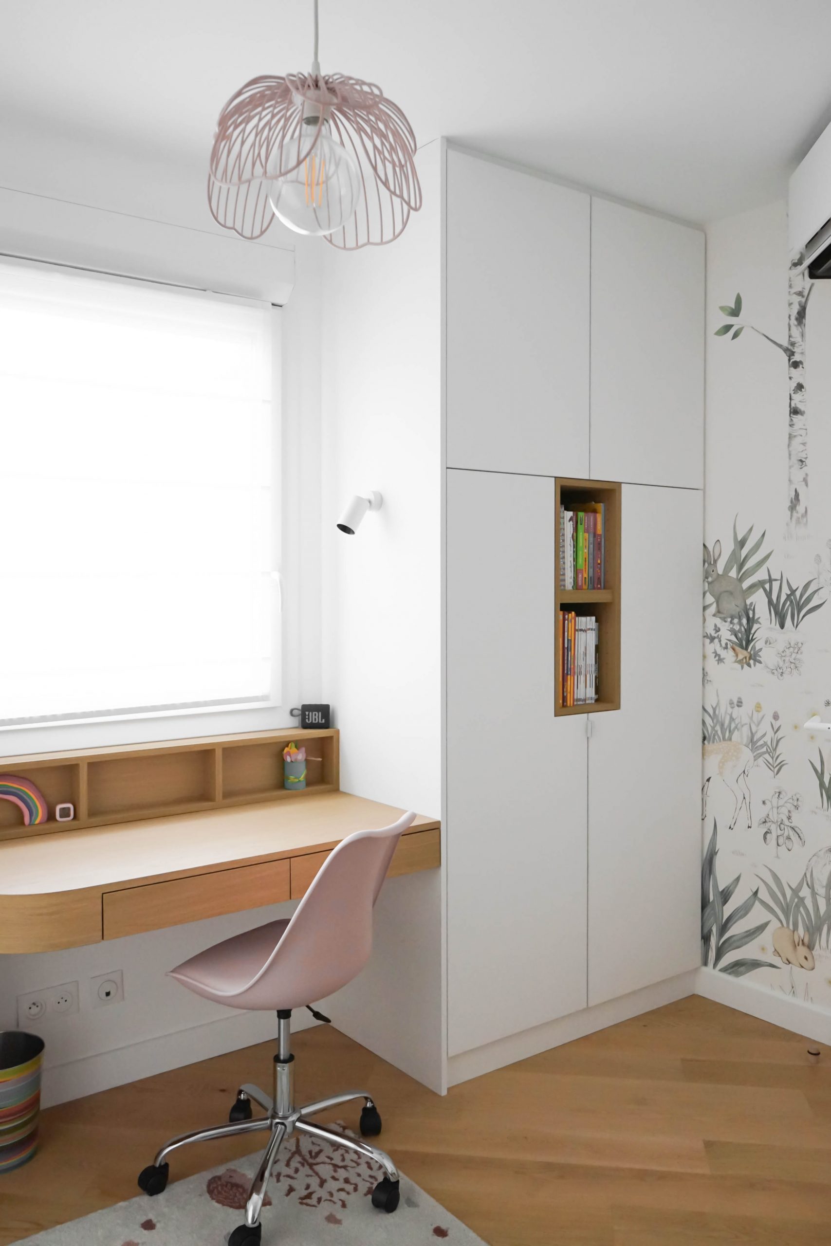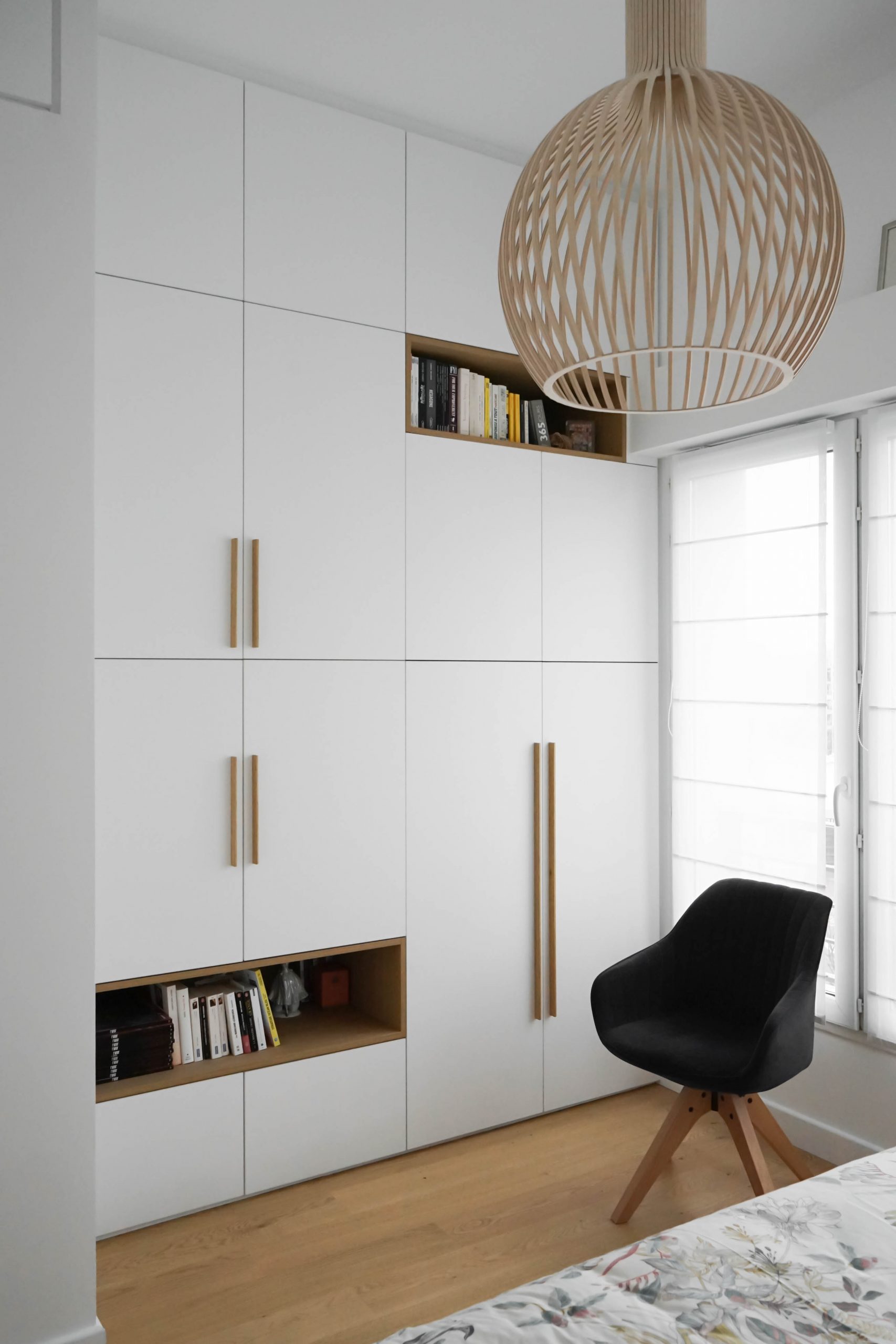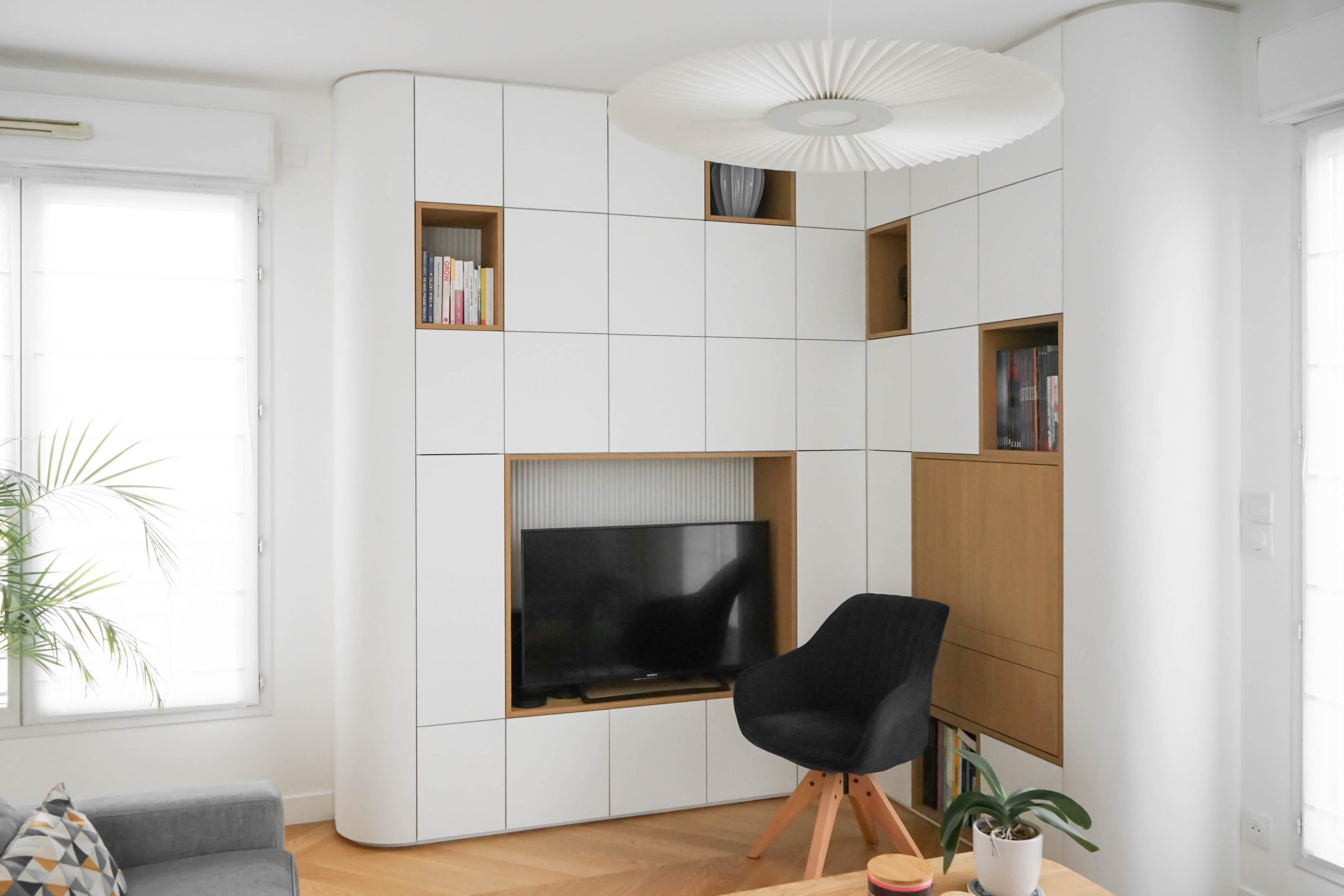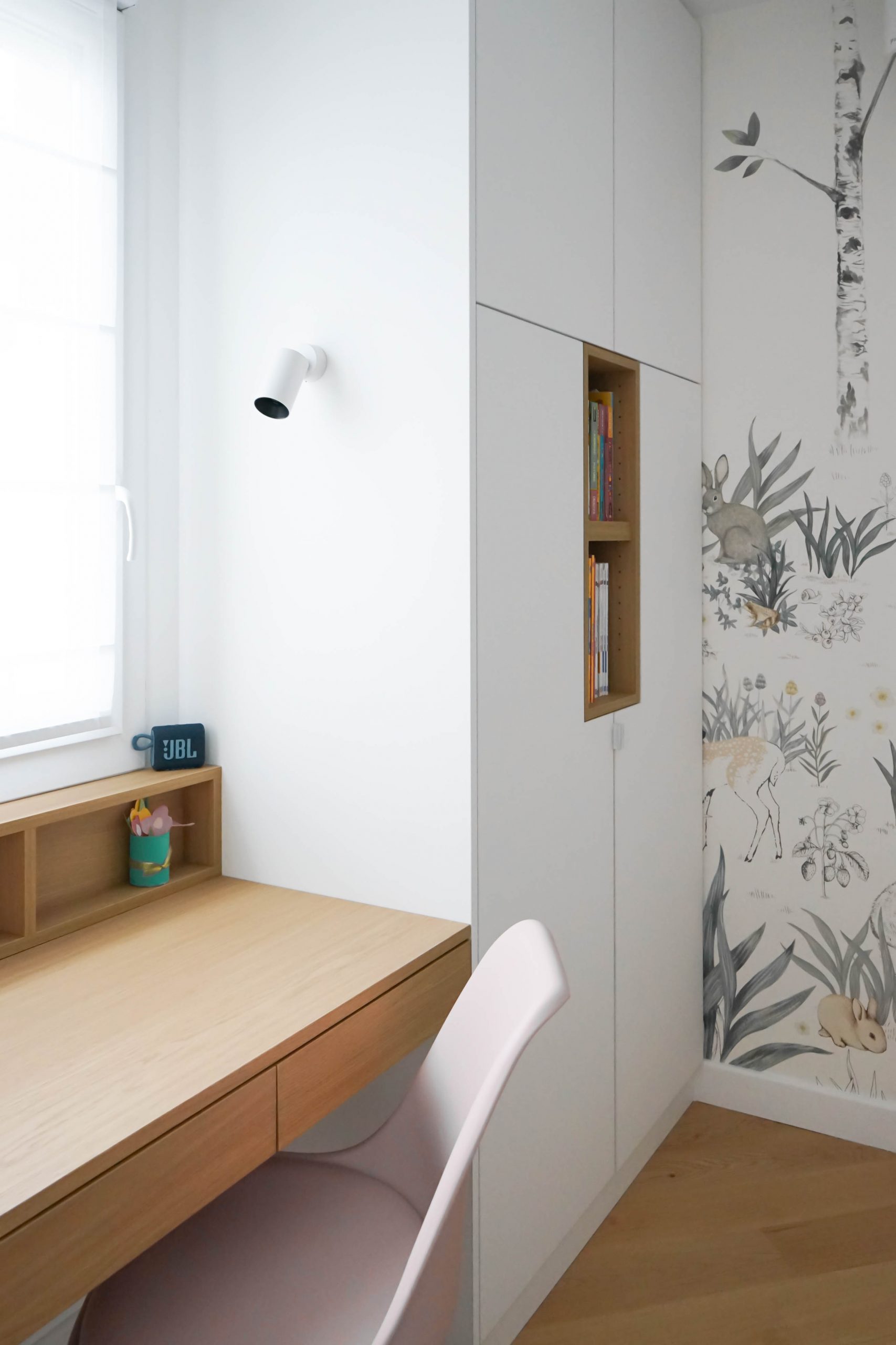 La configuration structurelle du lieu a permis une refonte totale de la distribution intérieure. Toutes les cloisons ont été déposées, offrant une liberté totale de réorganisation, seules les contraintes techniques (gaines, arrivées d’eau, réseaux) ayant guidé certains choix. Chaque pièce a été conçue sur mesure, avec un travail approfondi de menuiserie intégrée : placards, lits, bureaux, meubles TV, bibliothèques… Chaque élément a été pensé pour répondre aux besoins spécifiques et à la personnalité des membres de la famille. Le rangement est resté au cœur de la réflexion, garantissant un intérieur fonctionnel, fluide et chaleureux. Résultat : un projet dense, technique et totalement personnalisé, pensé pour accompagner les besoins évolutifs d’une jeune famille dynamique dans un lieu qui leur ressemble enfin.