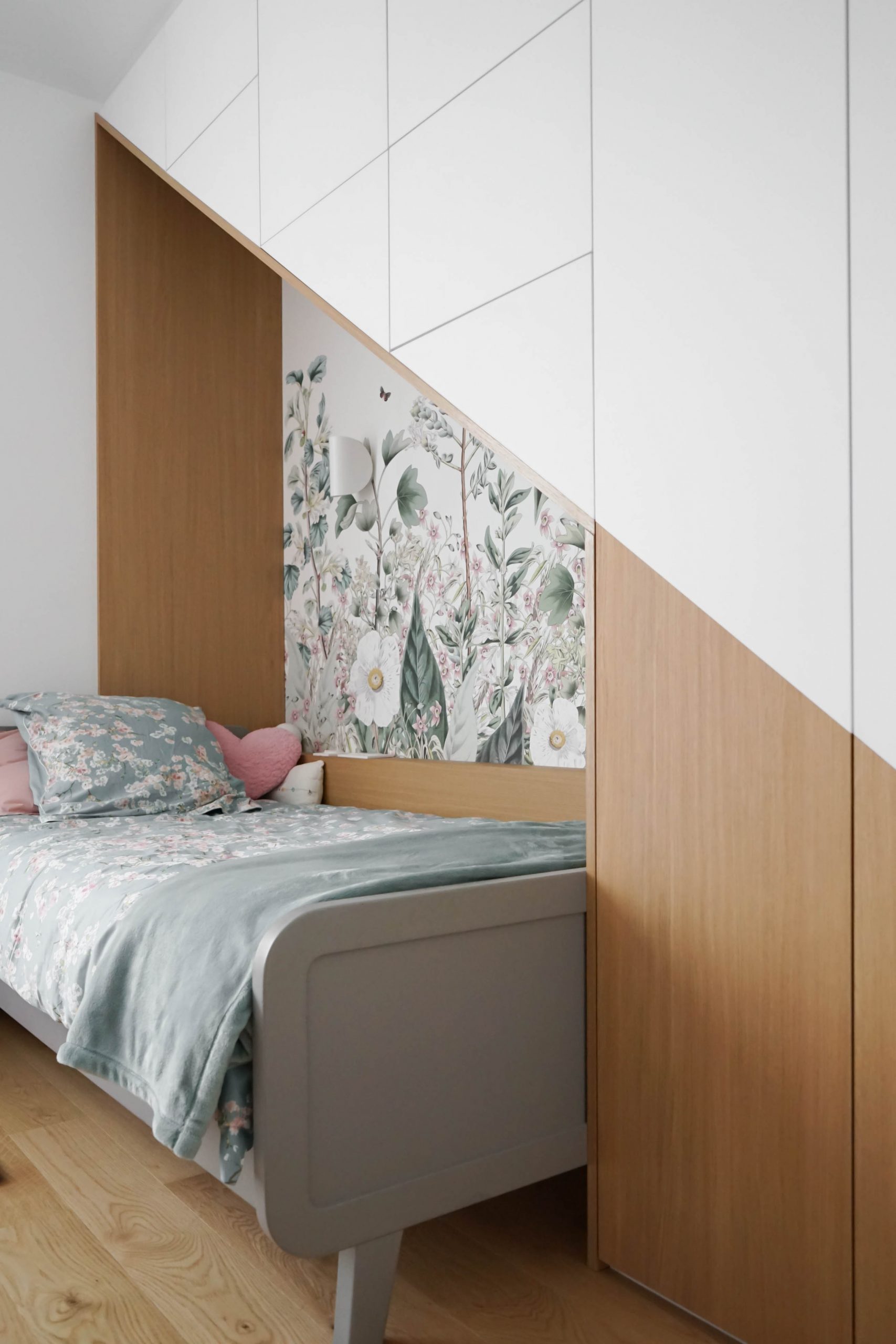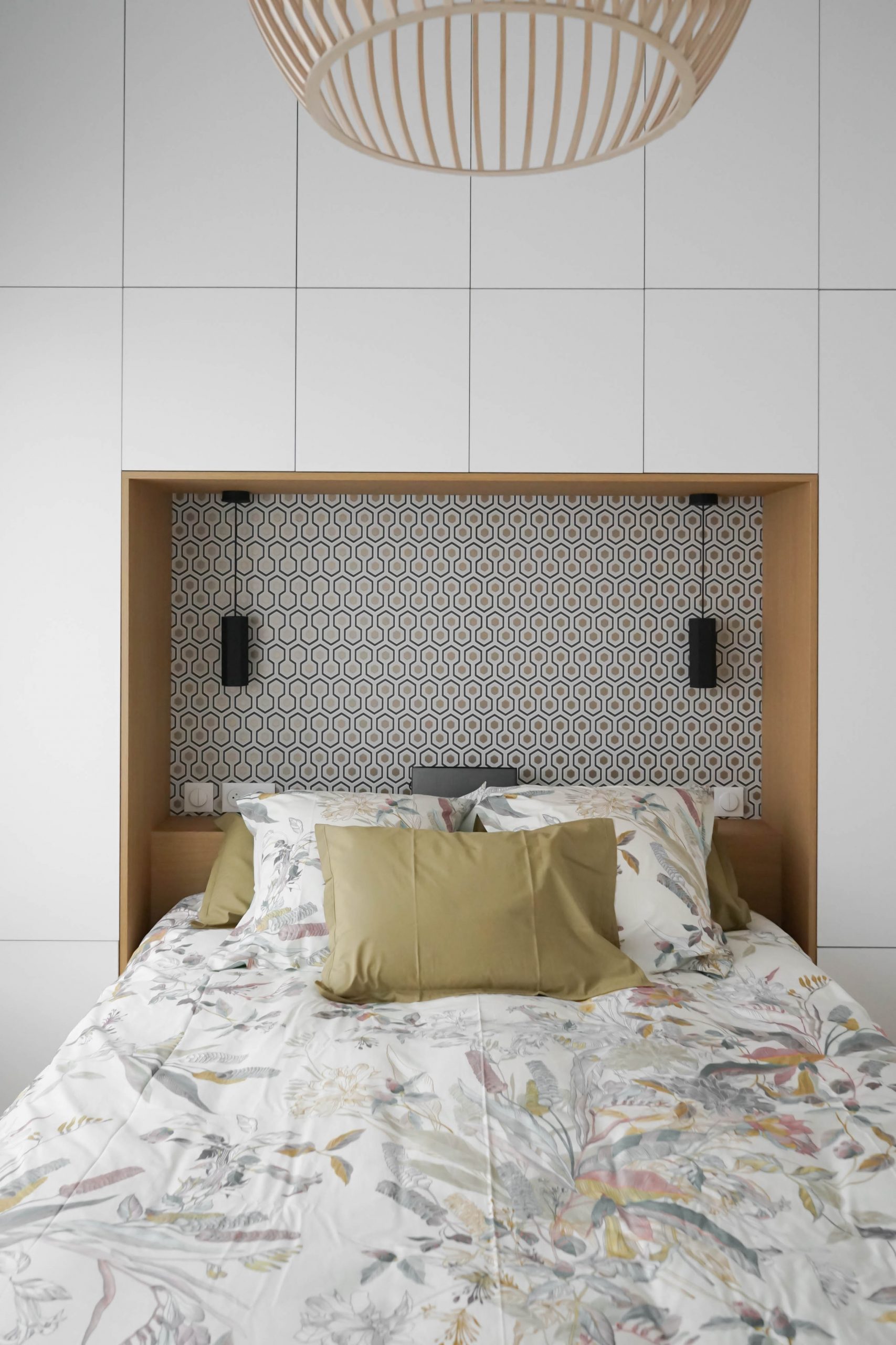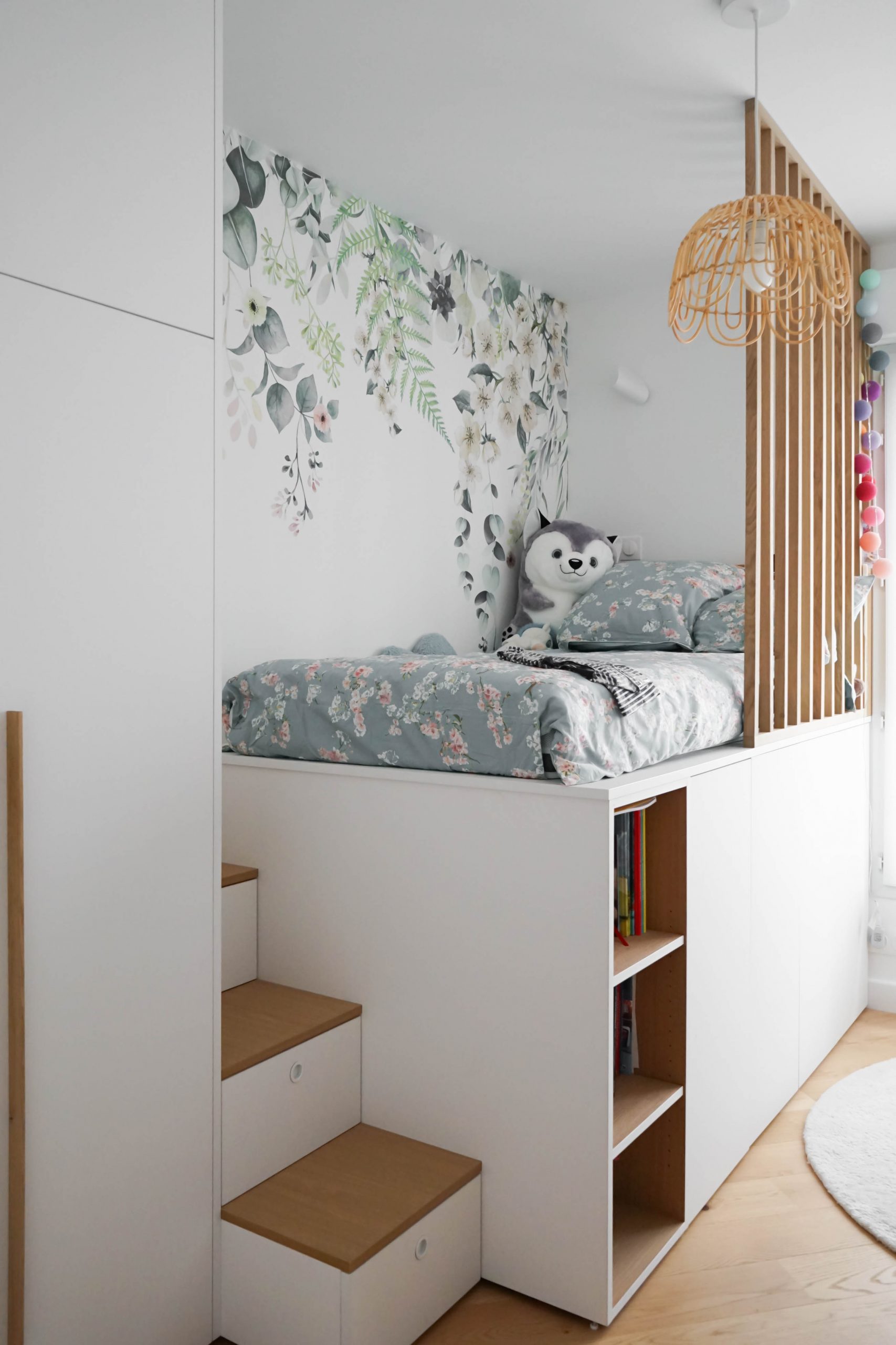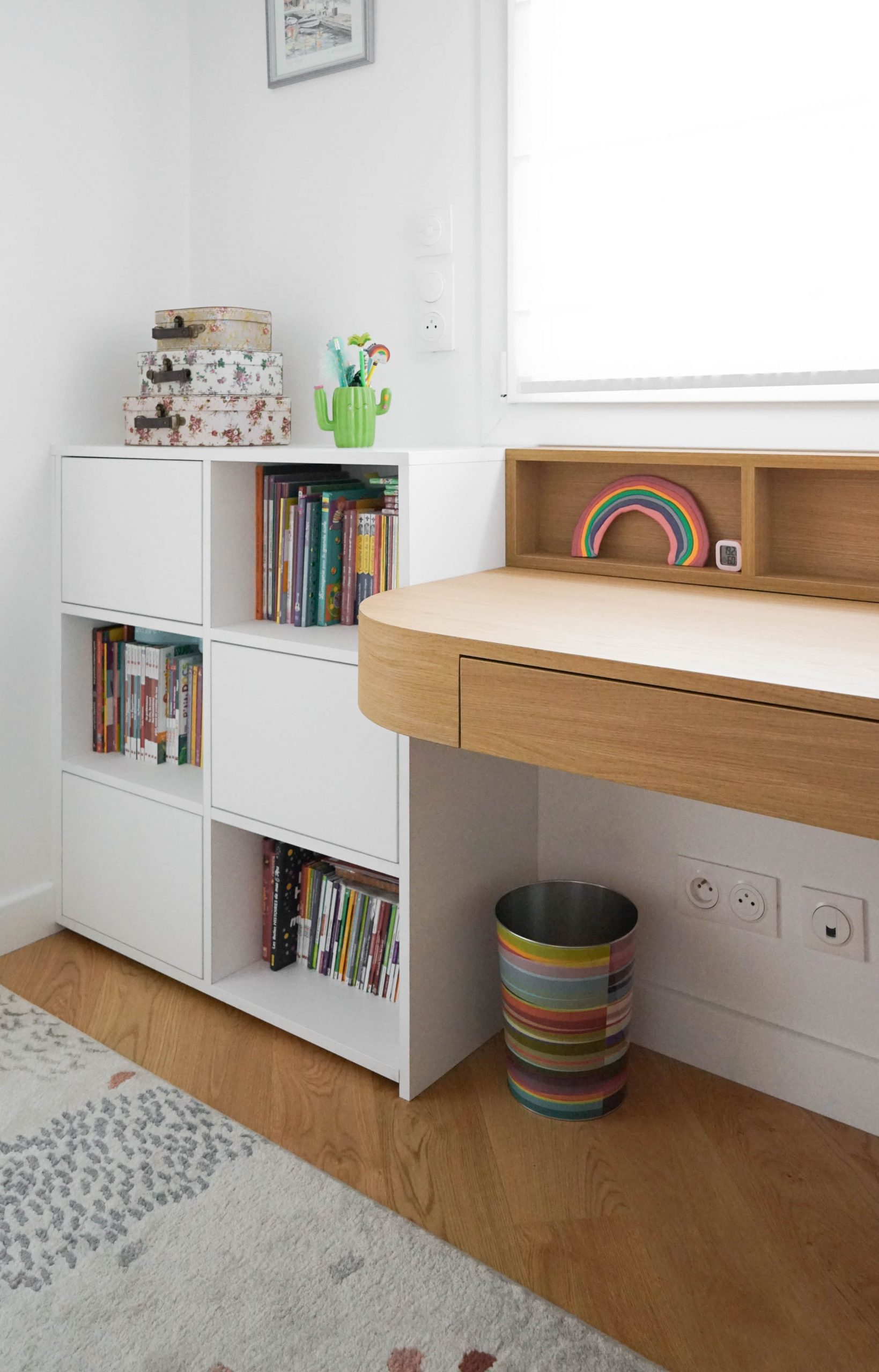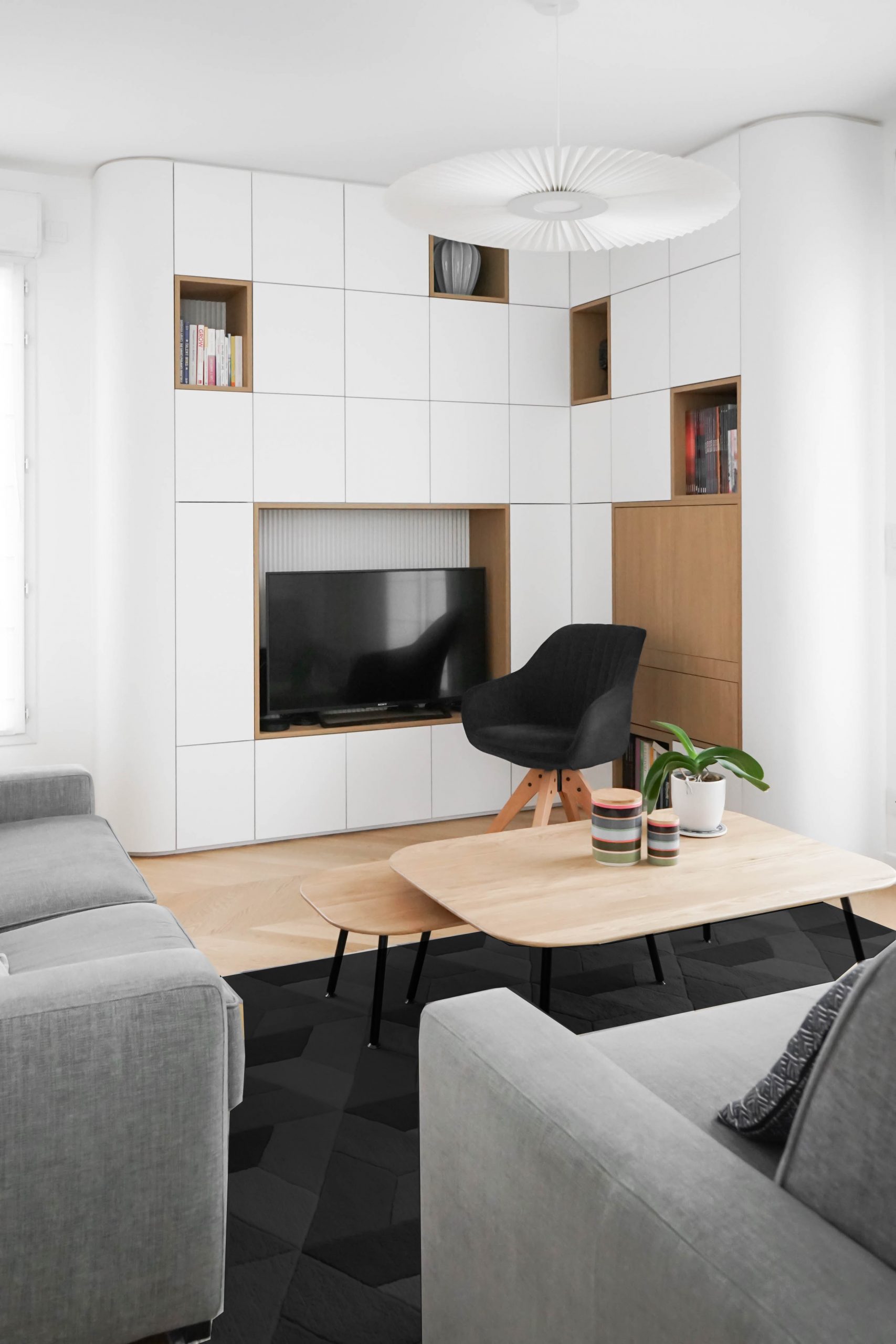 La configuration structurelle du lieu a permis une refonte totale de la distribution intérieure. Toutes les cloisons ont été déposées, offrant une liberté totale de réorganisation, seules les contraintes techniques (gaines, arrivées d’eau, réseaux) ayant guidé certains choix. Chaque pièce a été conçue sur mesure, avec un travail approfondi de menuiserie intégrée : placards, lits, bureaux, meubles TV, bibliothèques… Chaque élément a été pensé pour répondre aux besoins spécifiques et à la personnalité des membres de la famille. Le rangement est resté au cœur de la réflexion, garantissant un intérieur fonctionnel, fluide et chaleureux. Résultat : un projet dense, technique et totalement personnalisé, pensé pour accompagner les besoins évolutifs d’une jeune famille dynamique dans un lieu qui leur ressemble enfin.