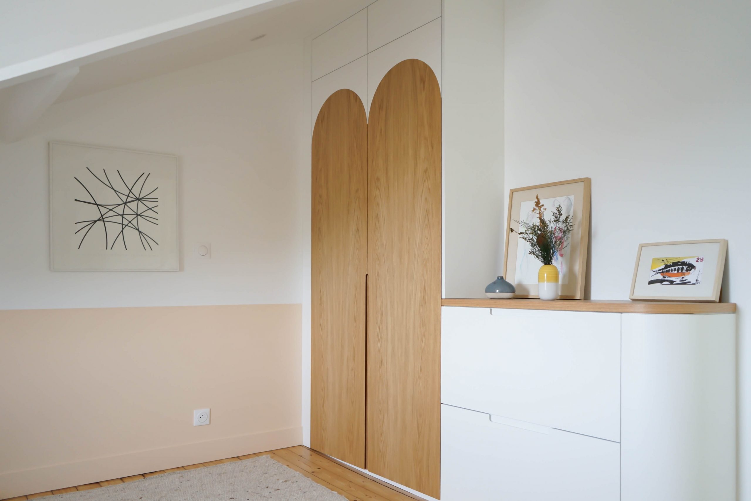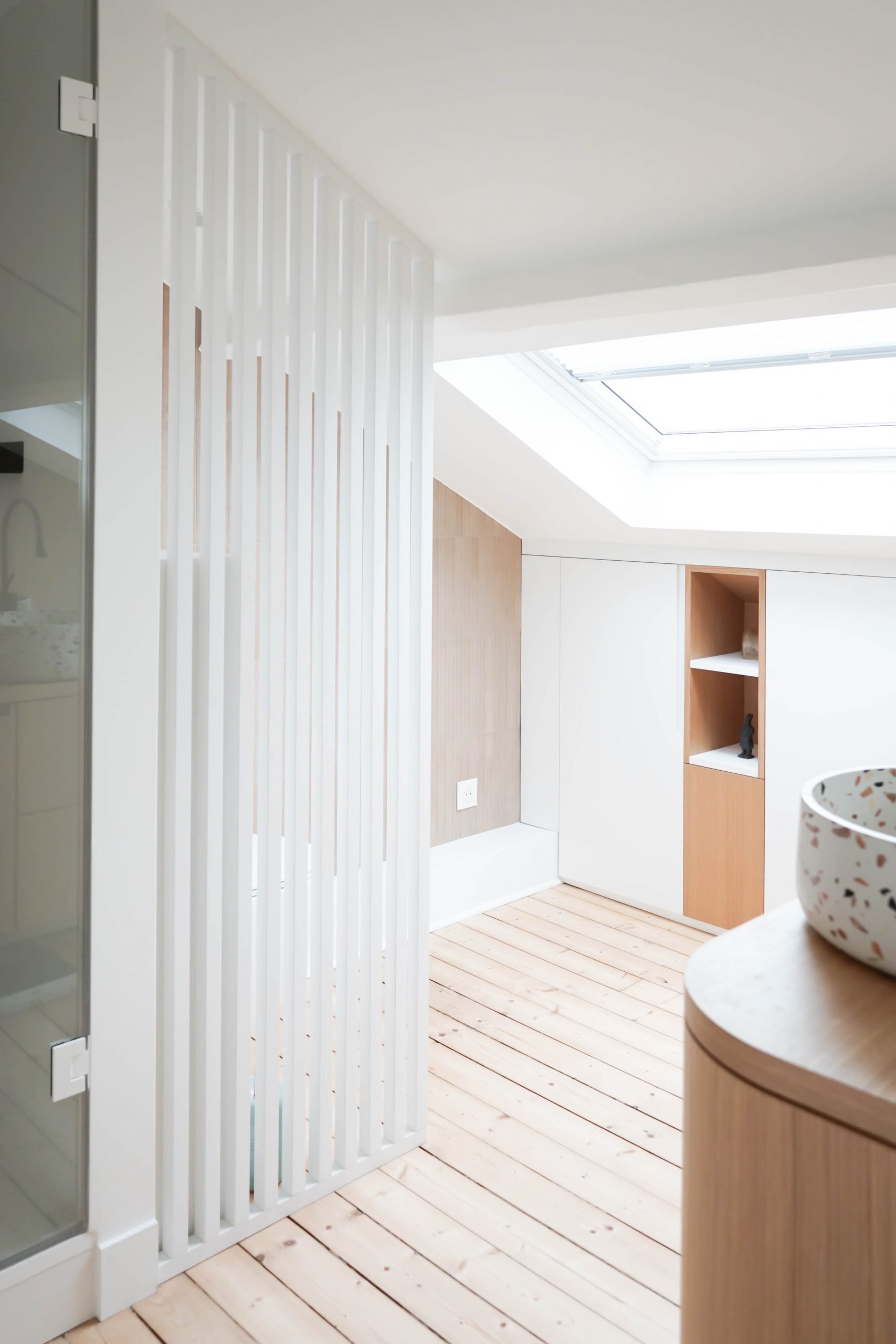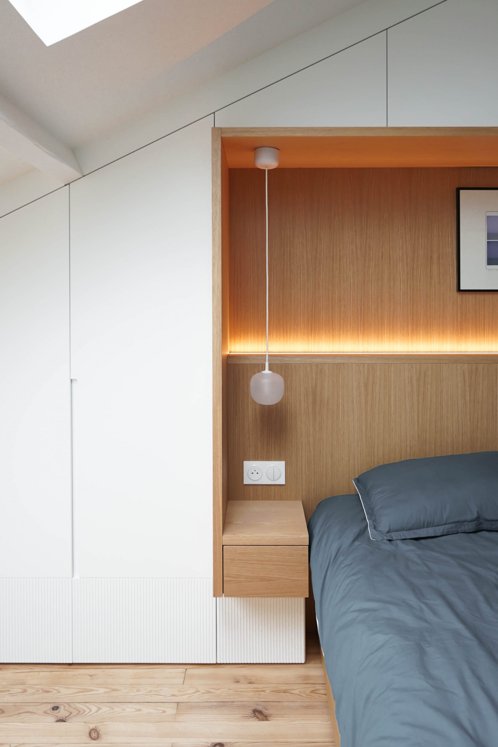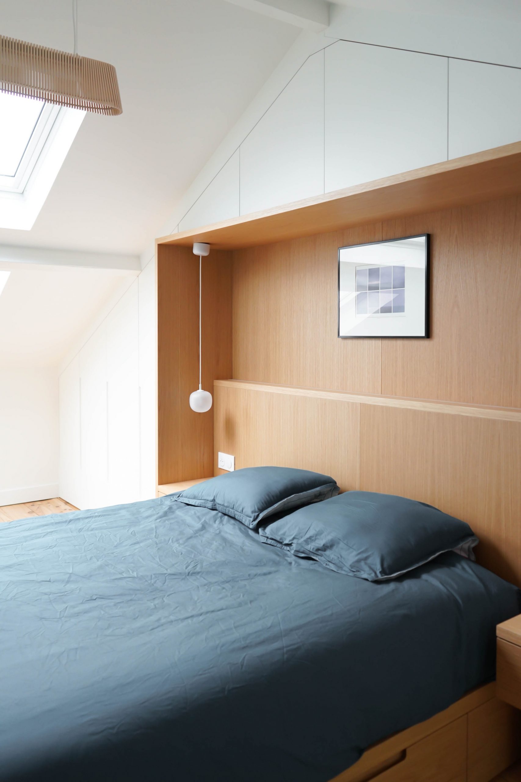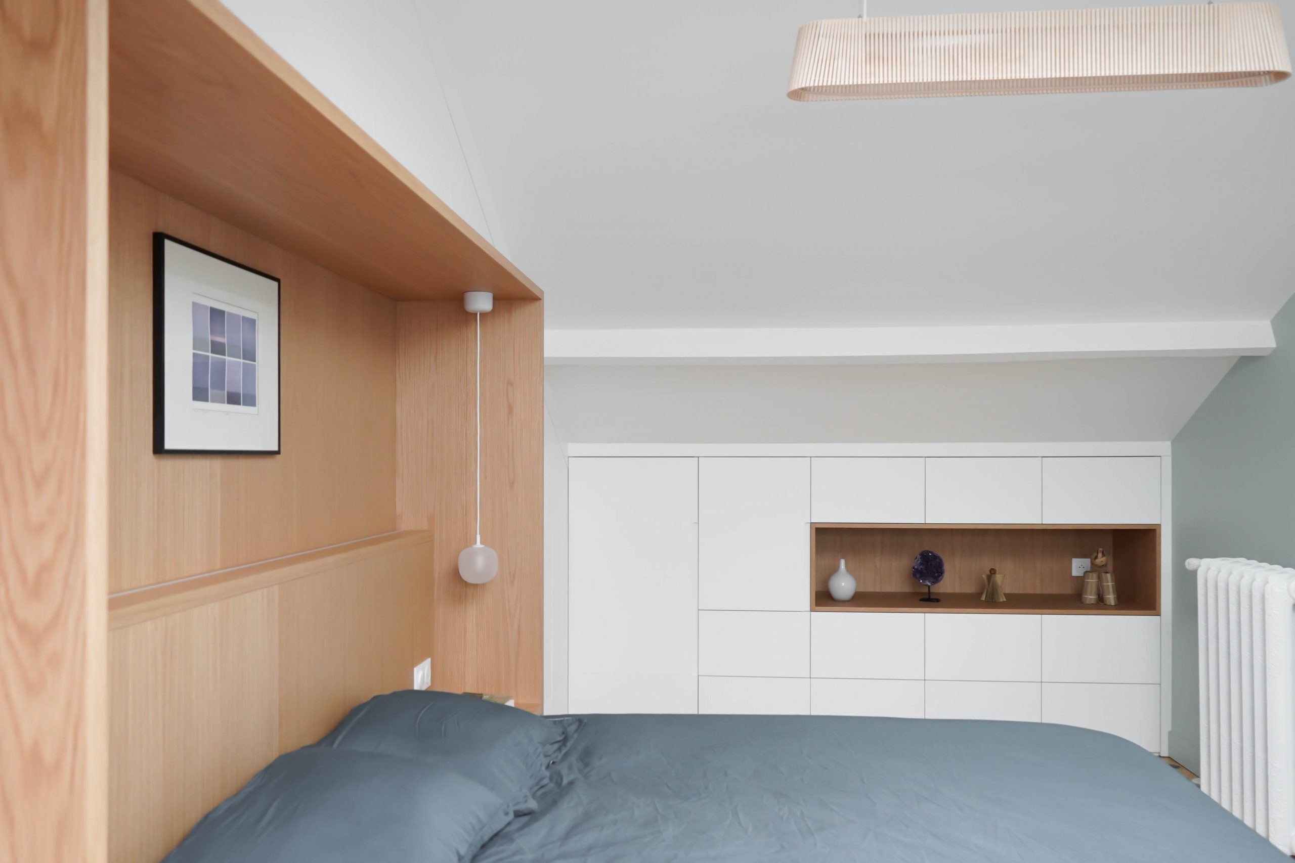 Pour renforcer la connexion avec le jardin, les ouvertures ont été agrandies et un nouveau velux a été créé dans la chambre principale, apportant lumière naturelle et profondeur de vue. Un meuble sur mesure sous pente a été dessiné dans la chambre principale, intégrant à la fois du rangement, des chevets et même un sommier, pour un ensemble cohérent et fonctionnel. Dans la seconde chambre, un grand dressing a été conçu avec une composition originale de portes, évitant l’effet de bloc massif et apportant une lecture plus légère à l’espace.