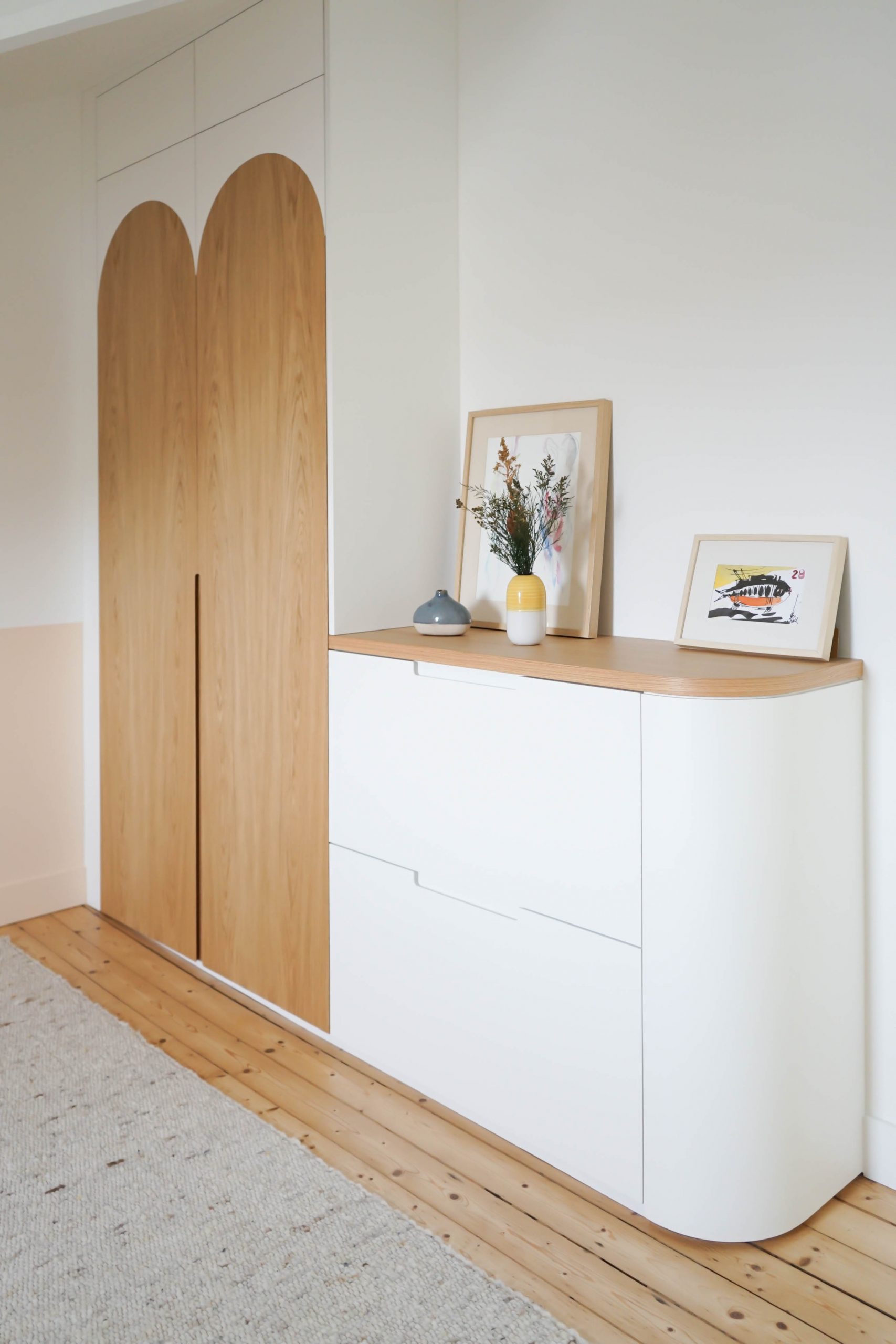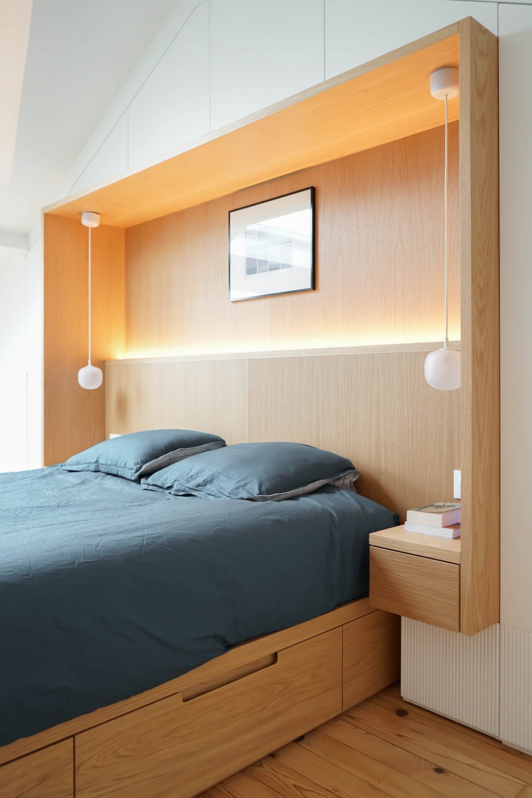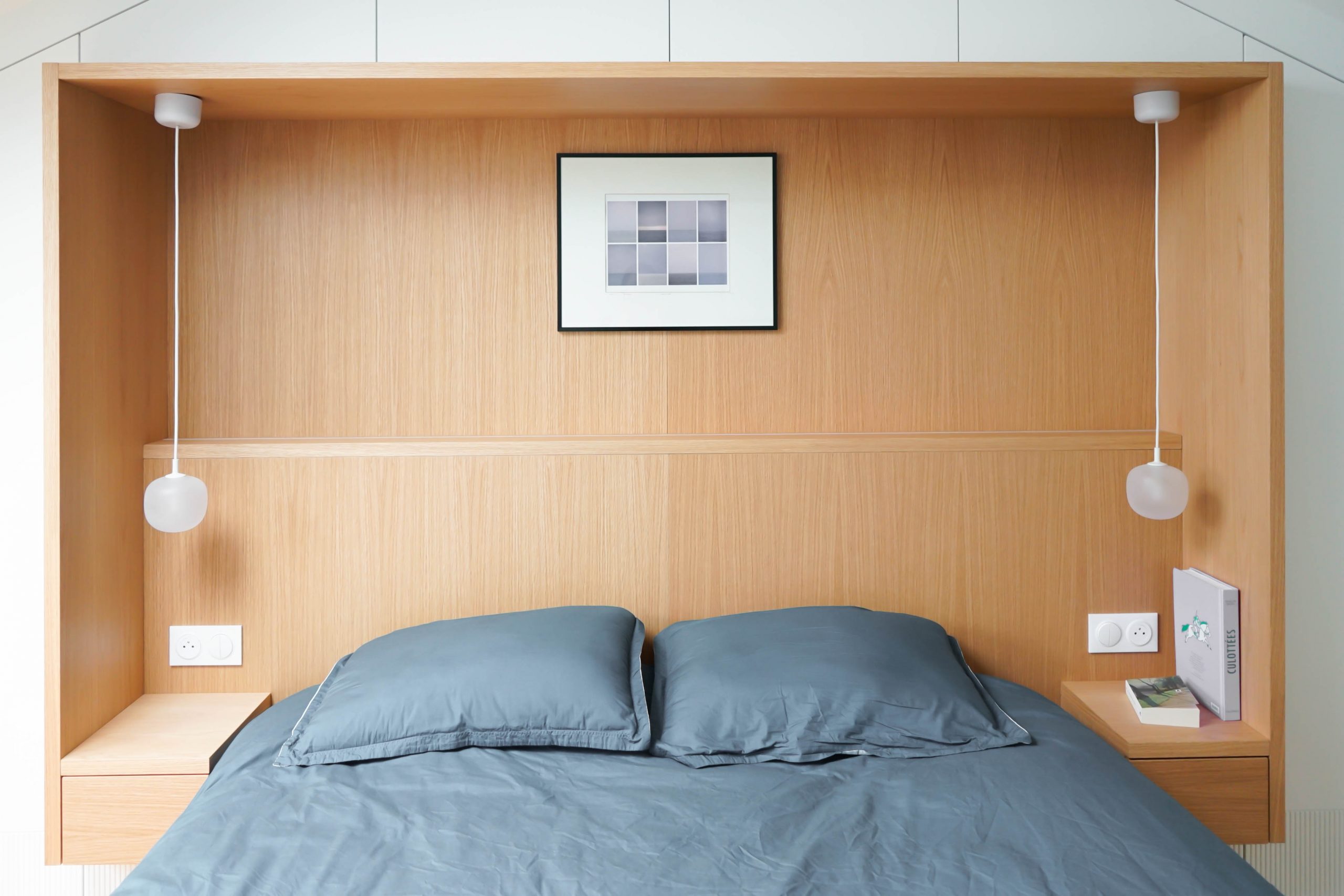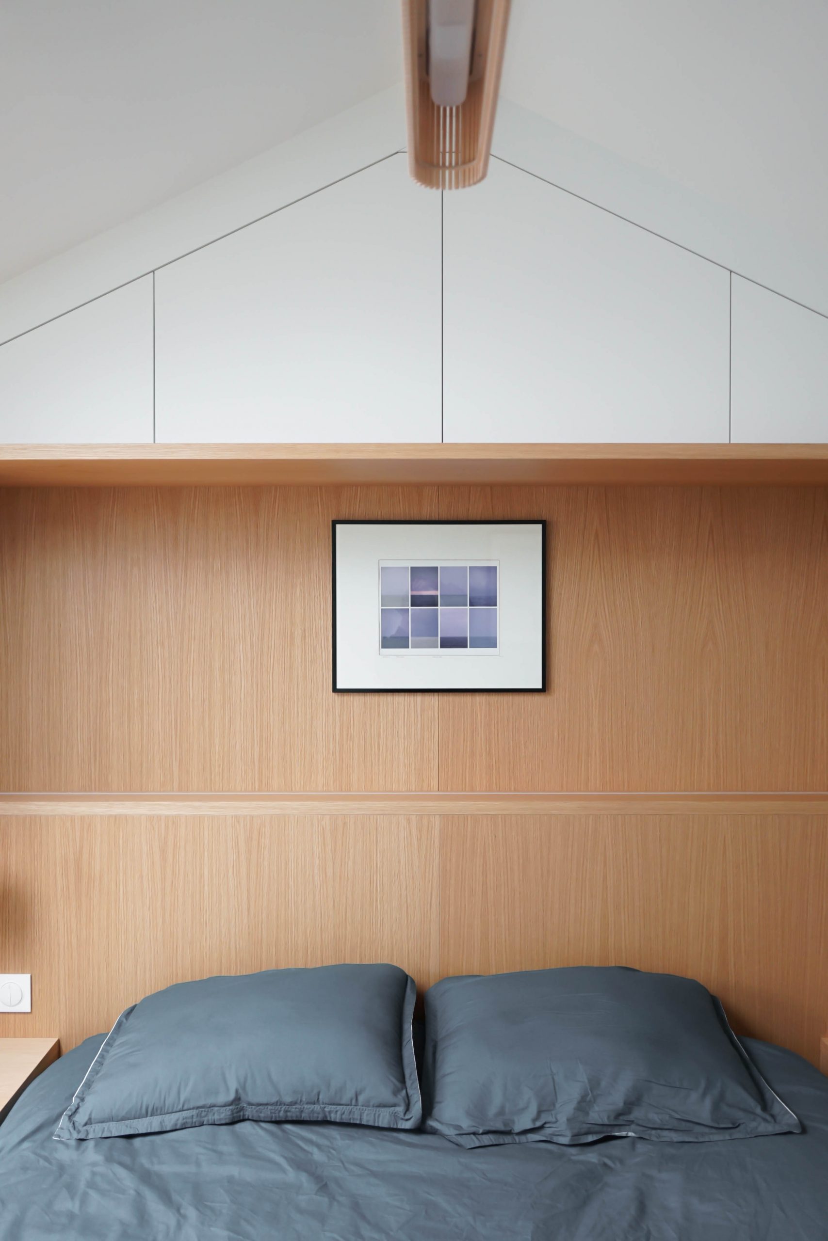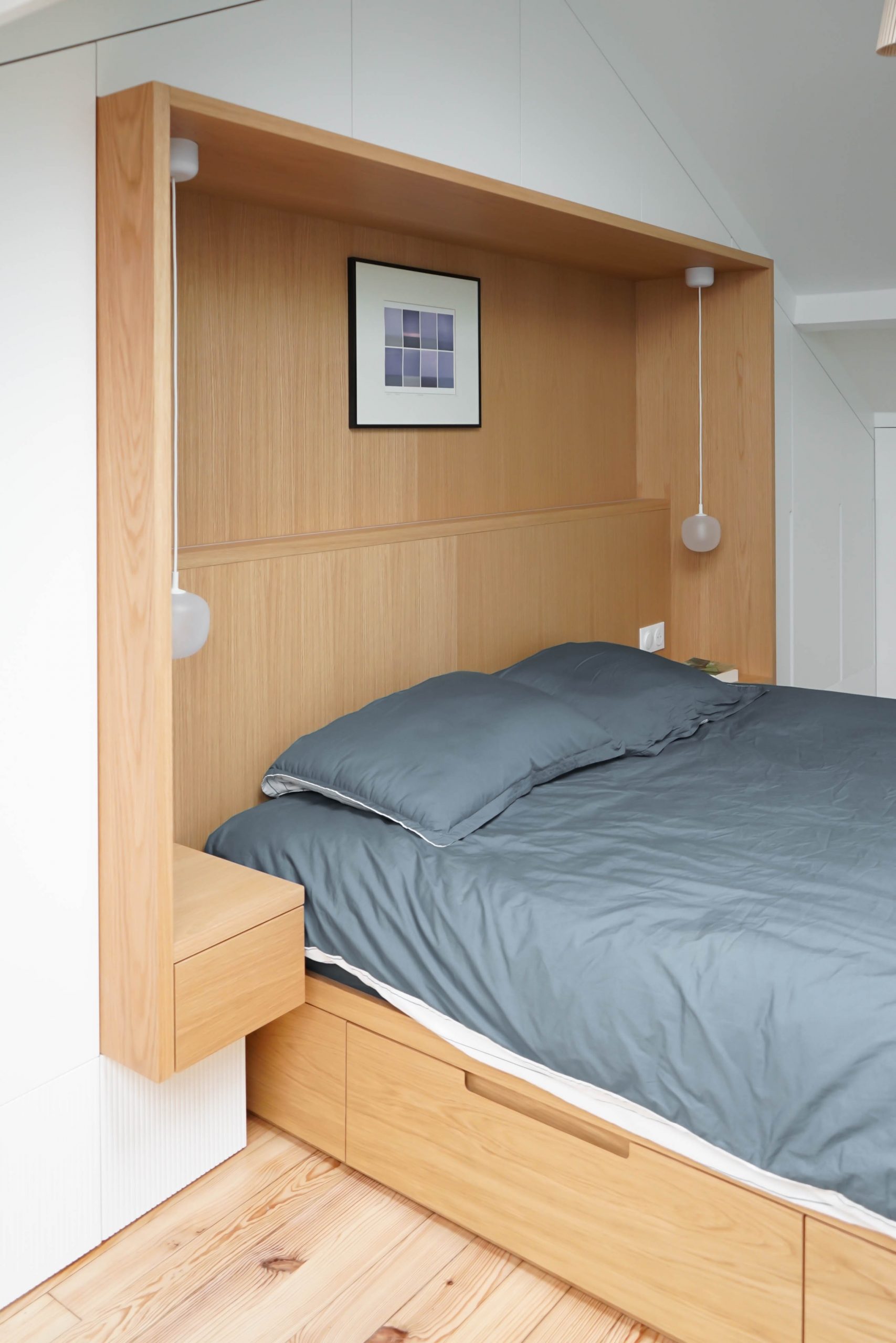 Pour renforcer la connexion avec le jardin, les ouvertures ont été agrandies et un nouveau velux a été créé dans la chambre principale, apportant lumière naturelle et profondeur de vue. Un meuble sur mesure sous pente a été dessiné dans la chambre principale, intégrant à la fois du rangement, des chevets et même un sommier, pour un ensemble cohérent et fonctionnel. Dans la seconde chambre, un grand dressing a été conçu avec une composition originale de portes, évitant l’effet de bloc massif et apportant une lecture plus légère à l’espace.