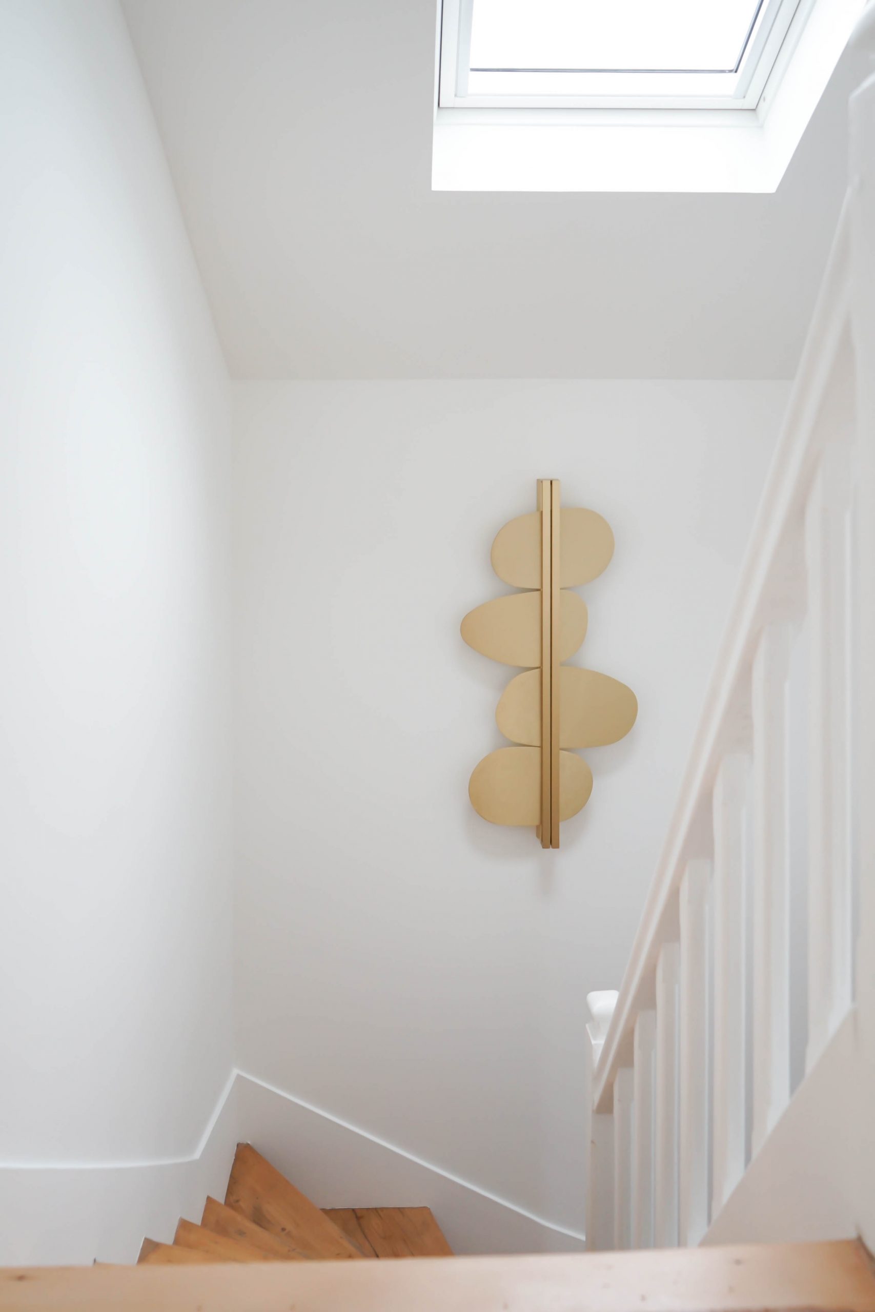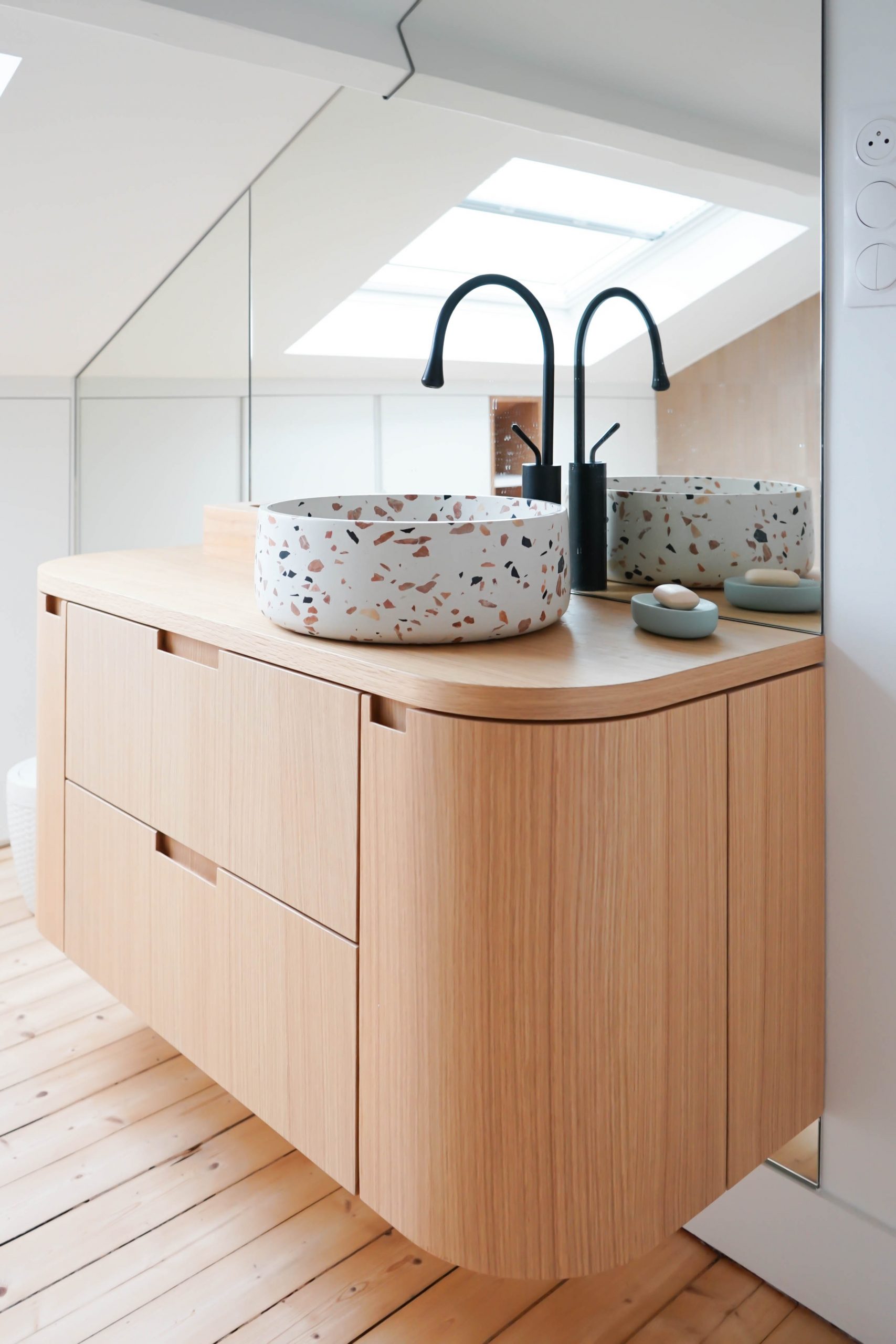La salle de bain a été pensée comme un lieu doux et lumineux, à travers un travail autour des matières et couleurs tendance : bois, terracotta, terrazzo et laiton composent une palette chaleureuse et solaire, à la fois contemporaine et intemporelle. Un projet précis, imaginé pour tirer parti de chaque recoin et faire de cet étage un véritable cocon sous les toits, adapté aux usages d’une famille en quête de confort et de style.
