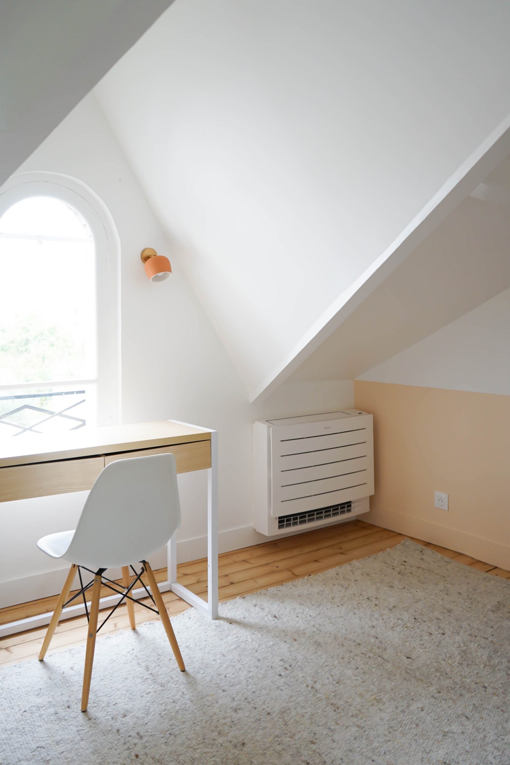 Dans cette belle maison en briques située à Colombes, la rénovation s’est concentrée sur le deuxième étage, partiellement mansardé, avec pour objectif de transformer cet espace en étage nuit confortable et fonctionnel. Ce niveau accueille une chambre principale, une seconde chambre à usage mixte (bureau, dressing et couchage d’appoint) ainsi qu’une salle de bain. Les volumes existants, traversés par des pentes de toit et des petits velux, offraient peu d’ouverture sur l’extérieur.