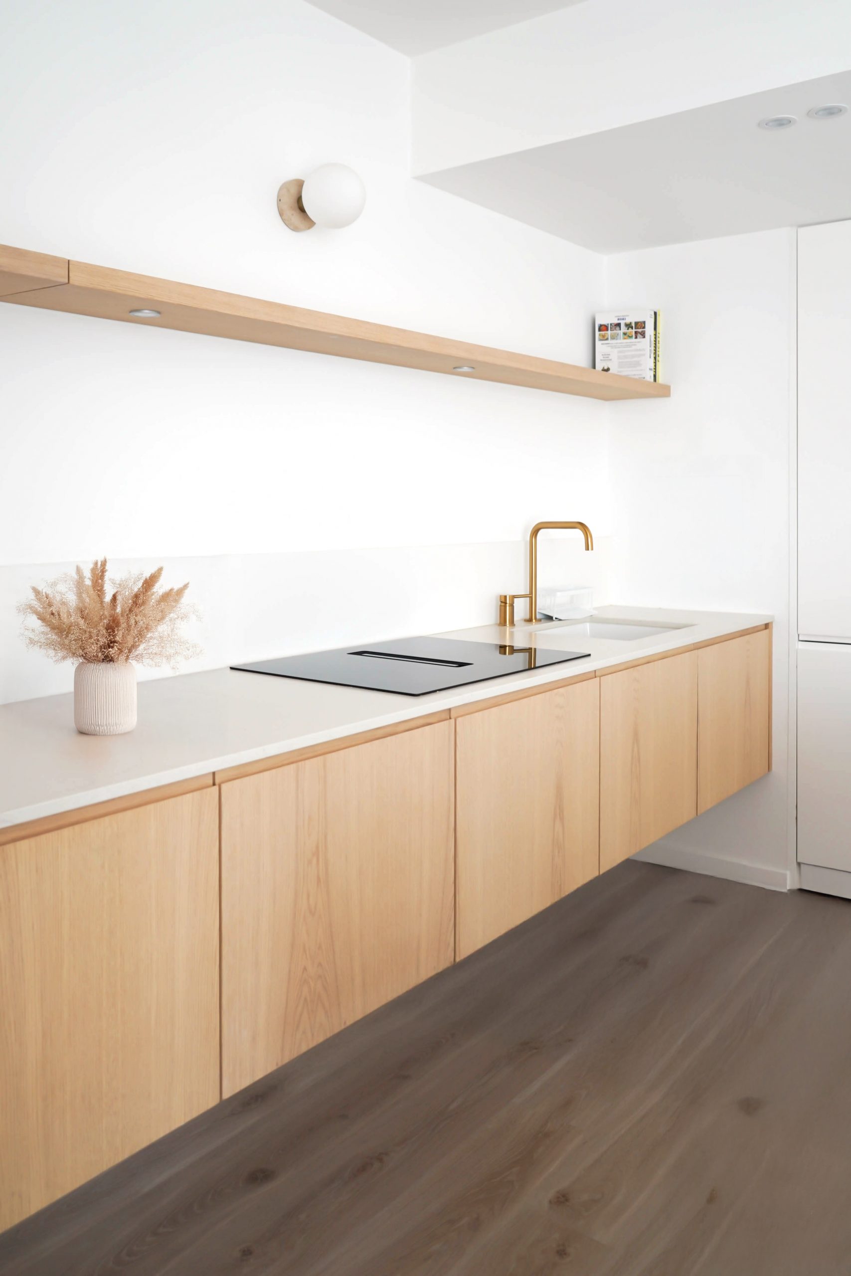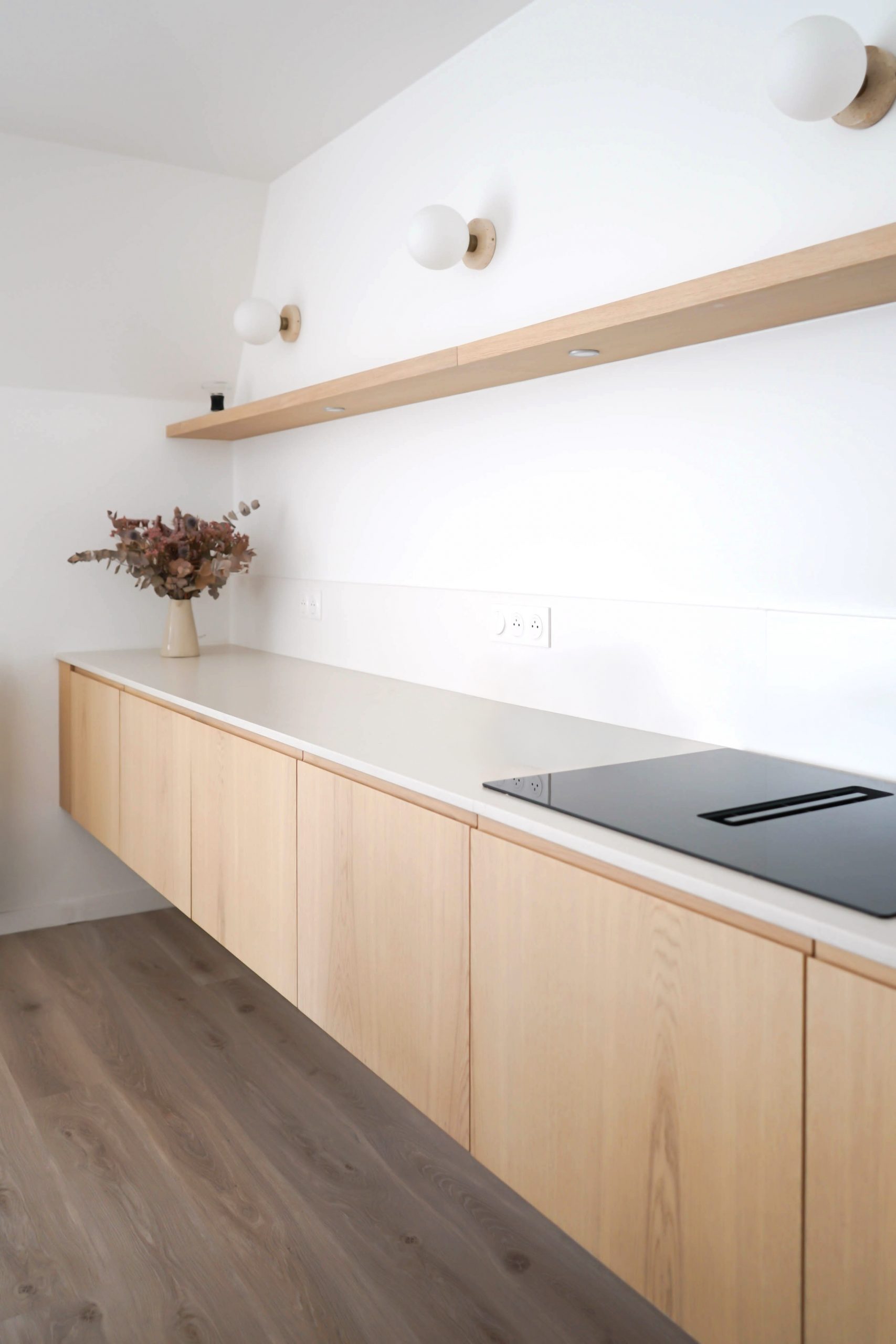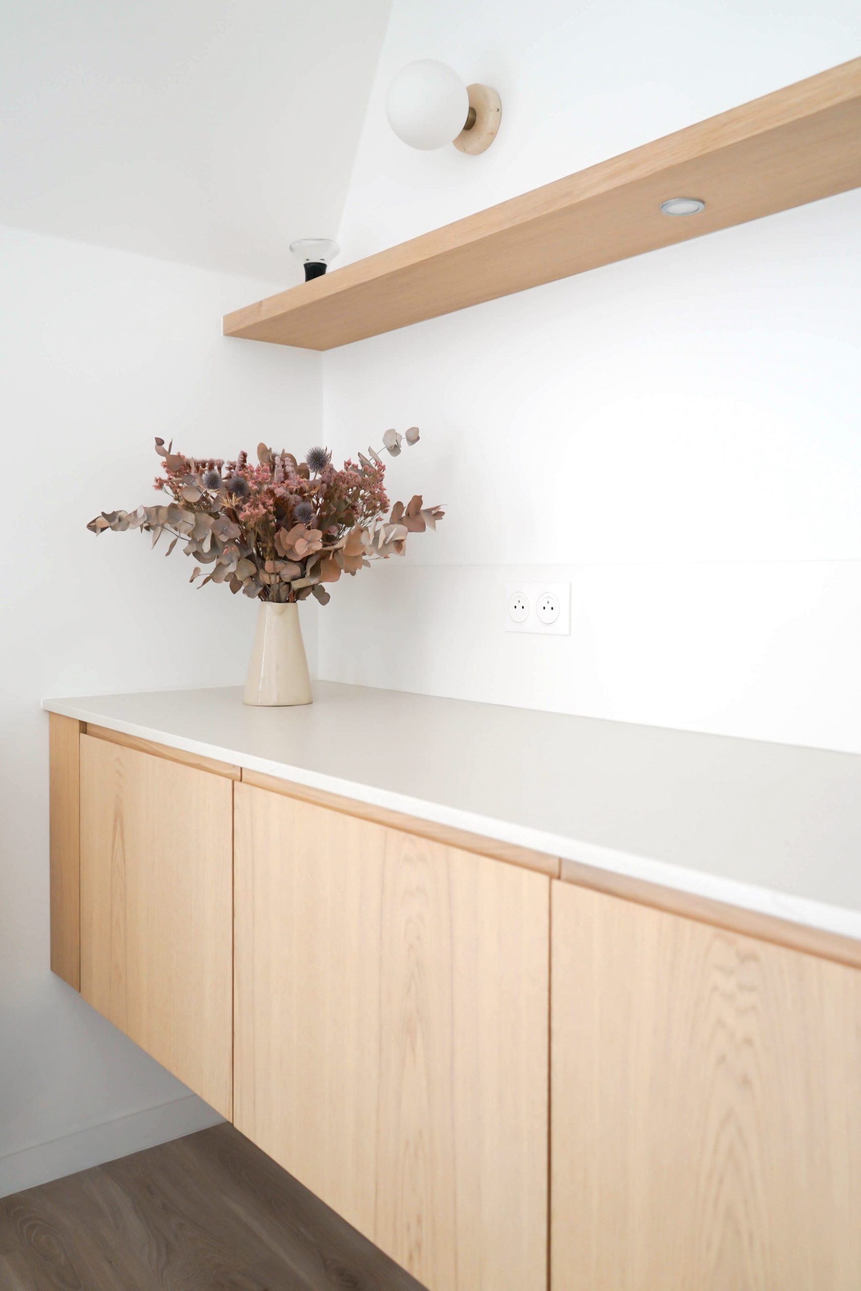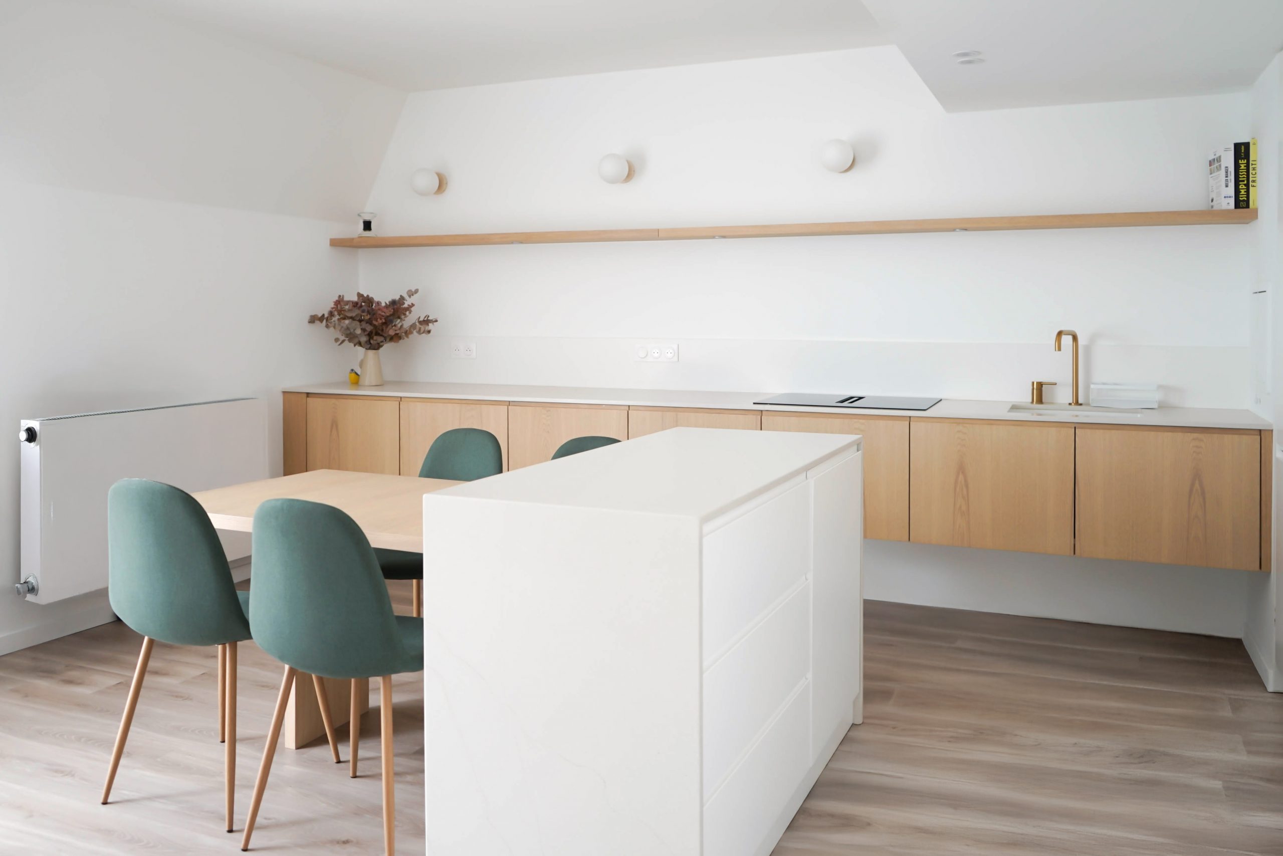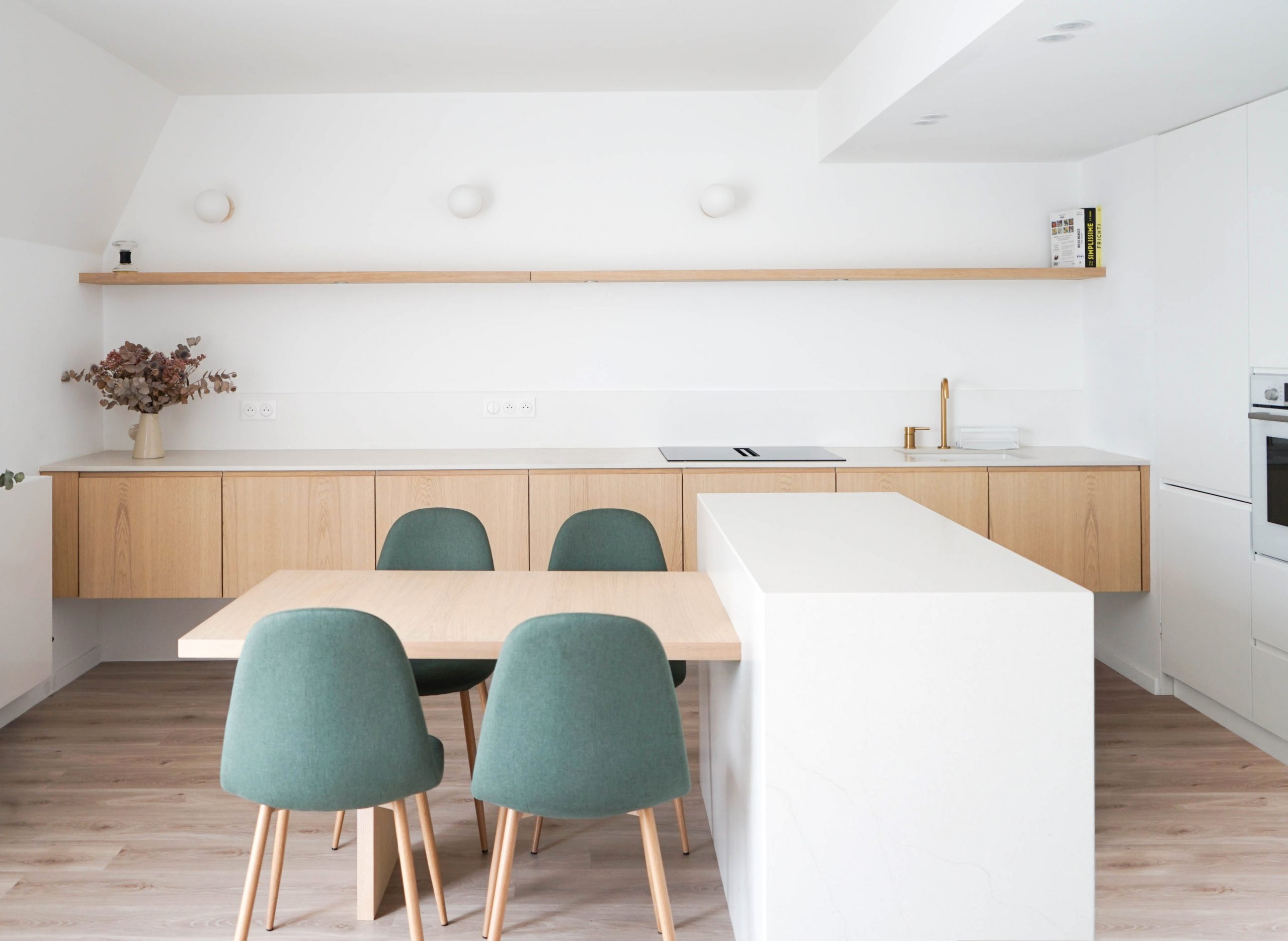 Une cuisine suspendue et minimaliste a été imaginée, accompagnée d’un îlot central faisant office de table sur mesure. Ce dispositif crée le lien entre cuisine et séjour, pour un ensemble chaleureux et accueillant, sans rupture visuelle. Résultat : un projet tout en finesse, qui démontre qu’un appartement neuf peut révéler tout son potentiel grâce à des interventions ciblées, pensées pour la vie quotidienne d’une jeune famille.