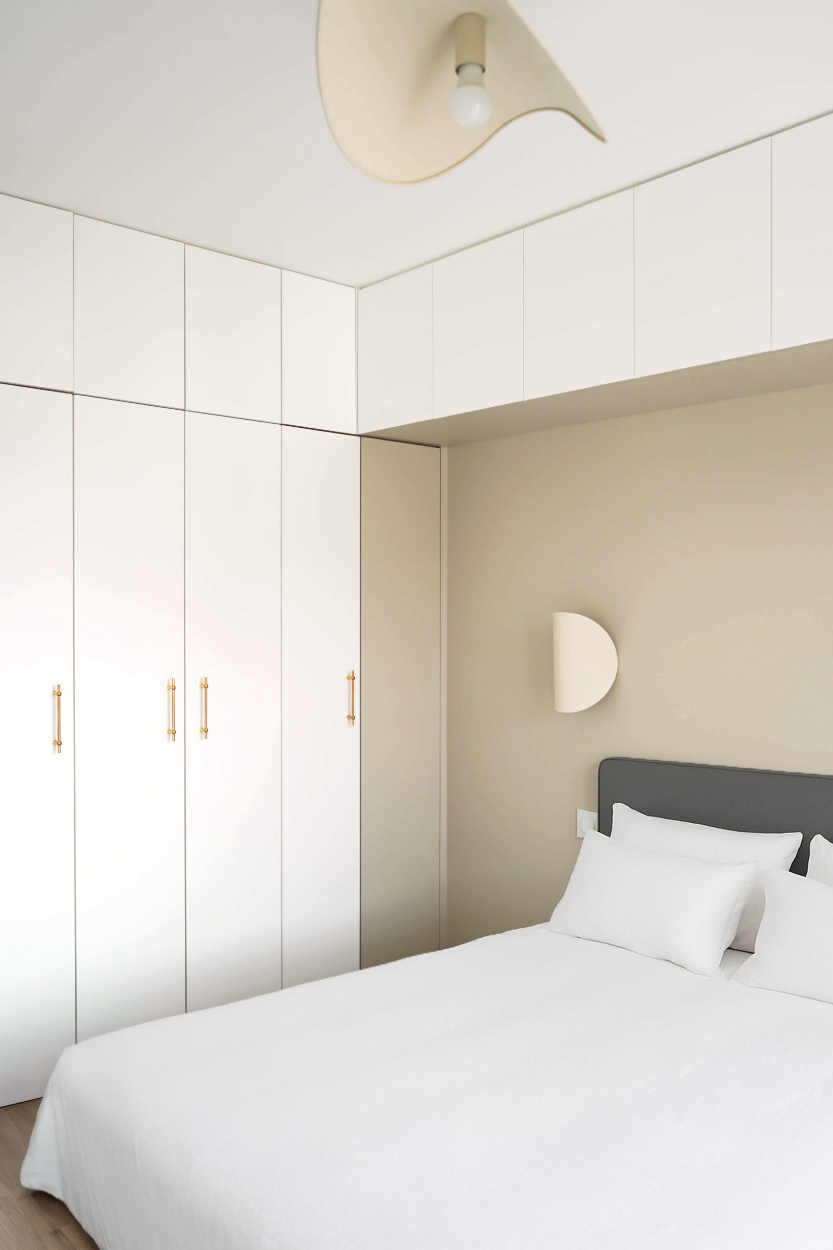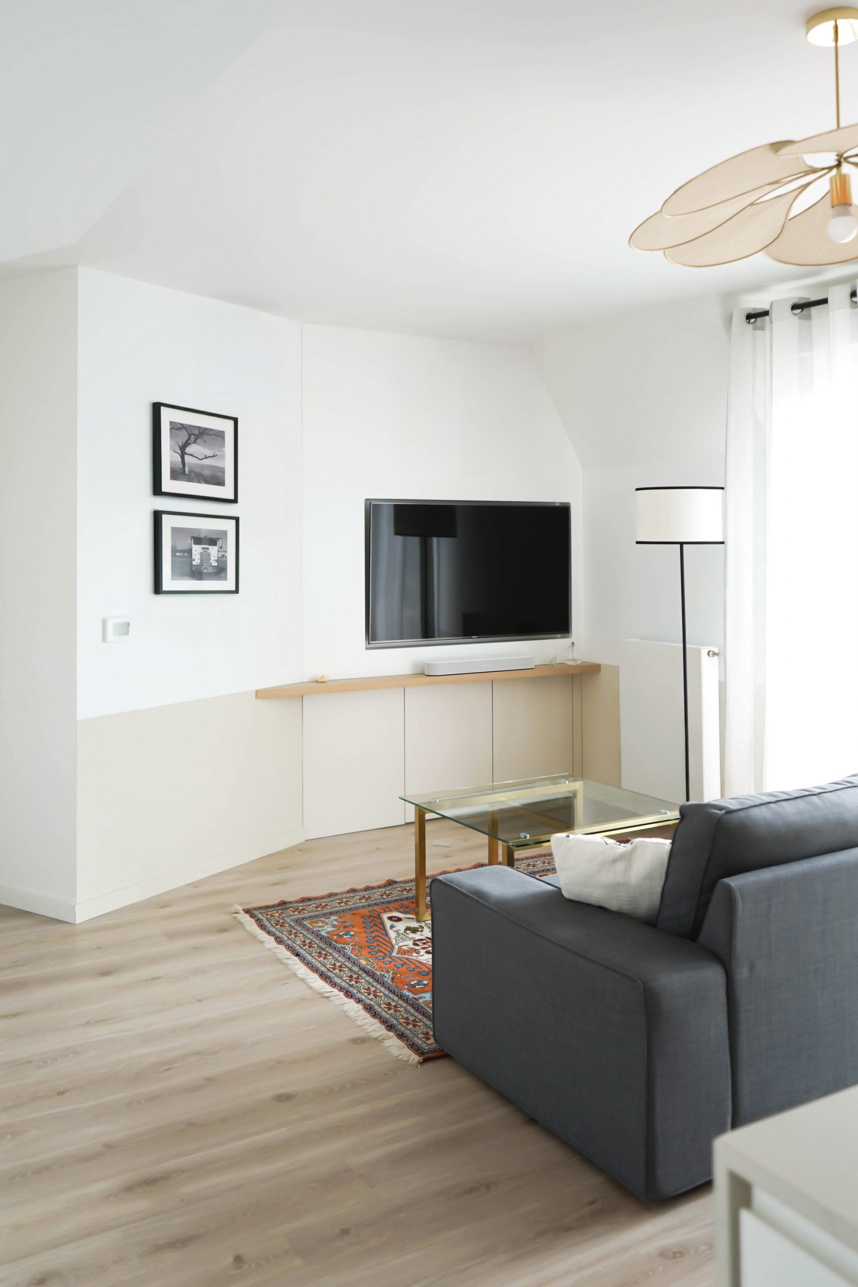 L’objectif était de transformer ces faiblesses en opportunités, grâce à des mobilier sur mesure conçus pour épouser les volumes, libérer l’espace et fluidifier la circulation. La chambre parentale intègre désormais un placard suspendu au-dessus du lit, élégant et discret. Dans le séjour, un meuble TV sur mesure vient masquer un angle perdu tout en apportant du rangement et une assise visuelle plus cohérente. Le cœur du projet se concentre sur la cuisine, que les clients souhaitaient ouverte sur le salon, légère et intégrée à l’espace de vie.