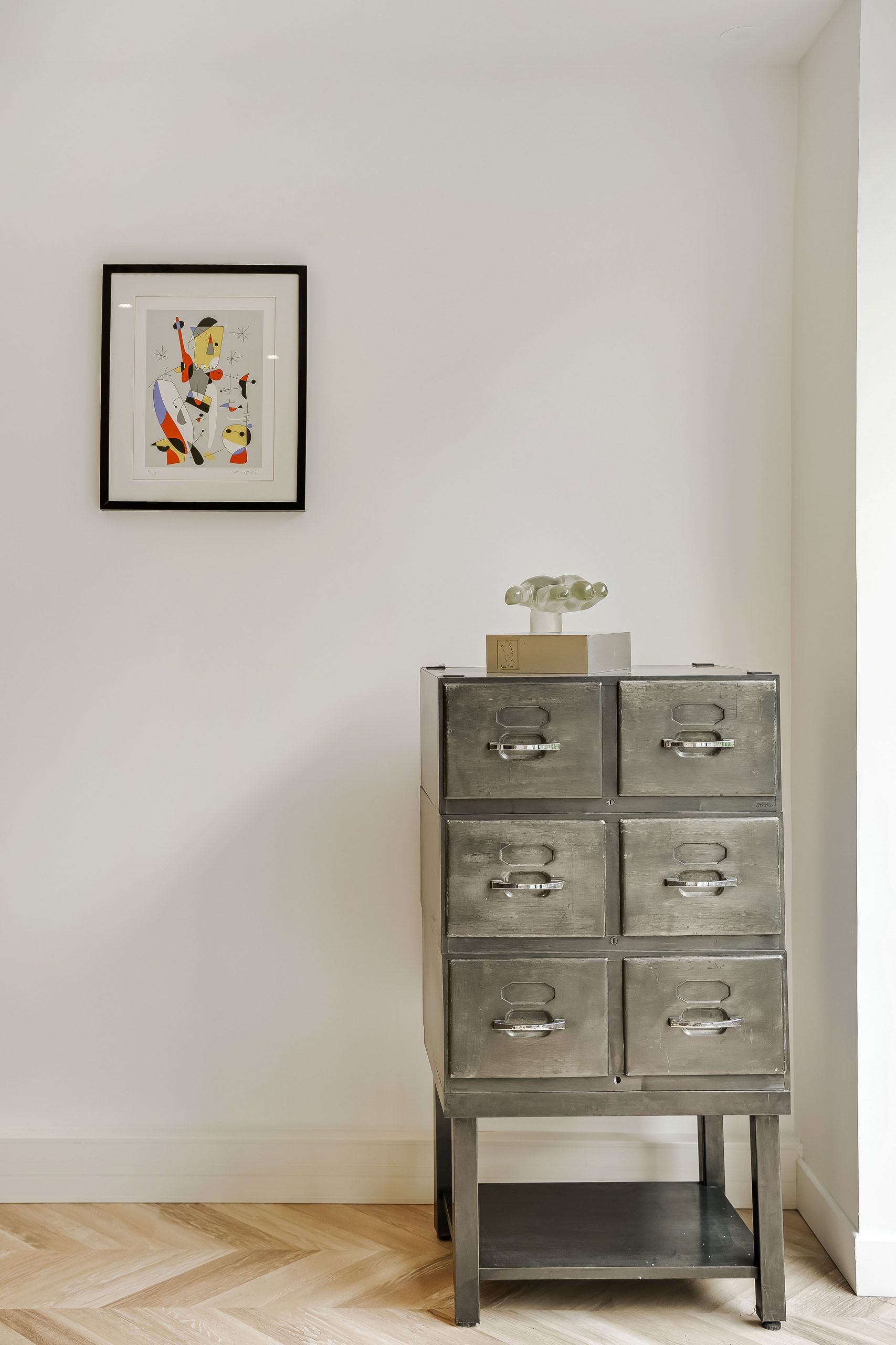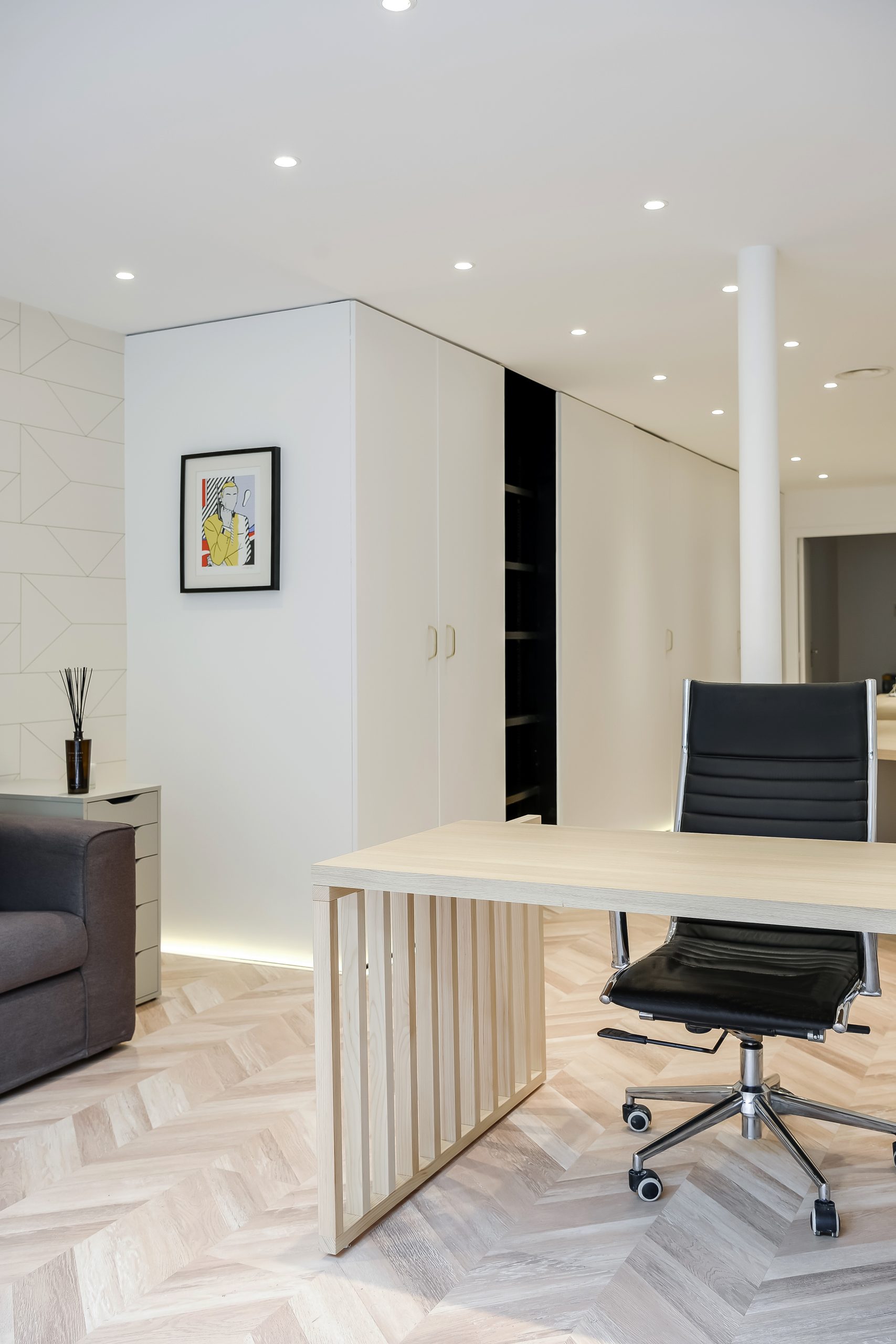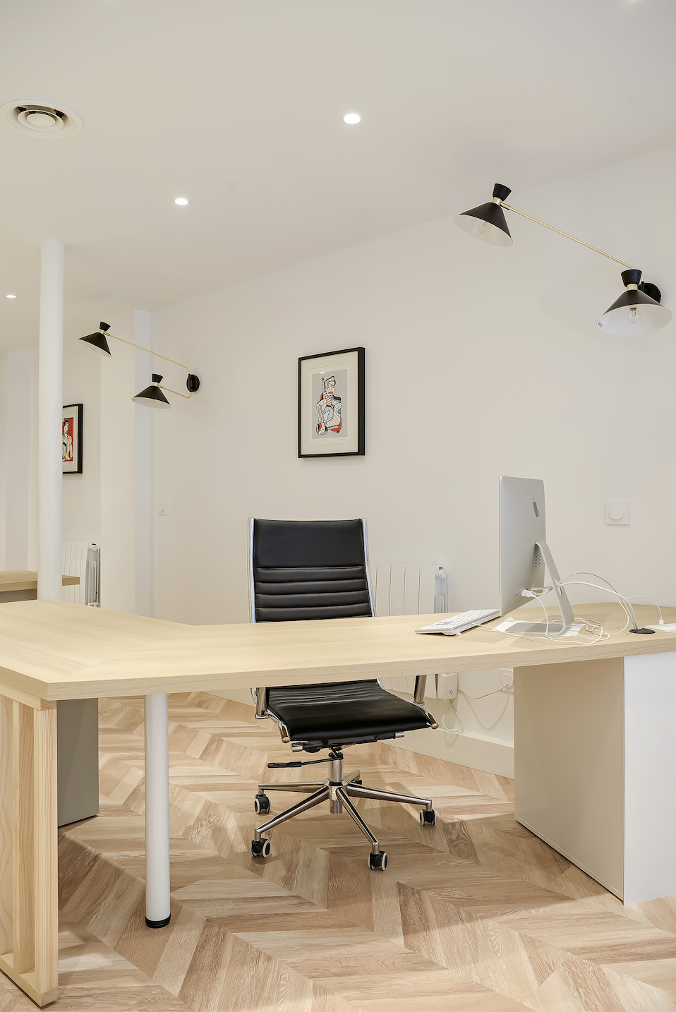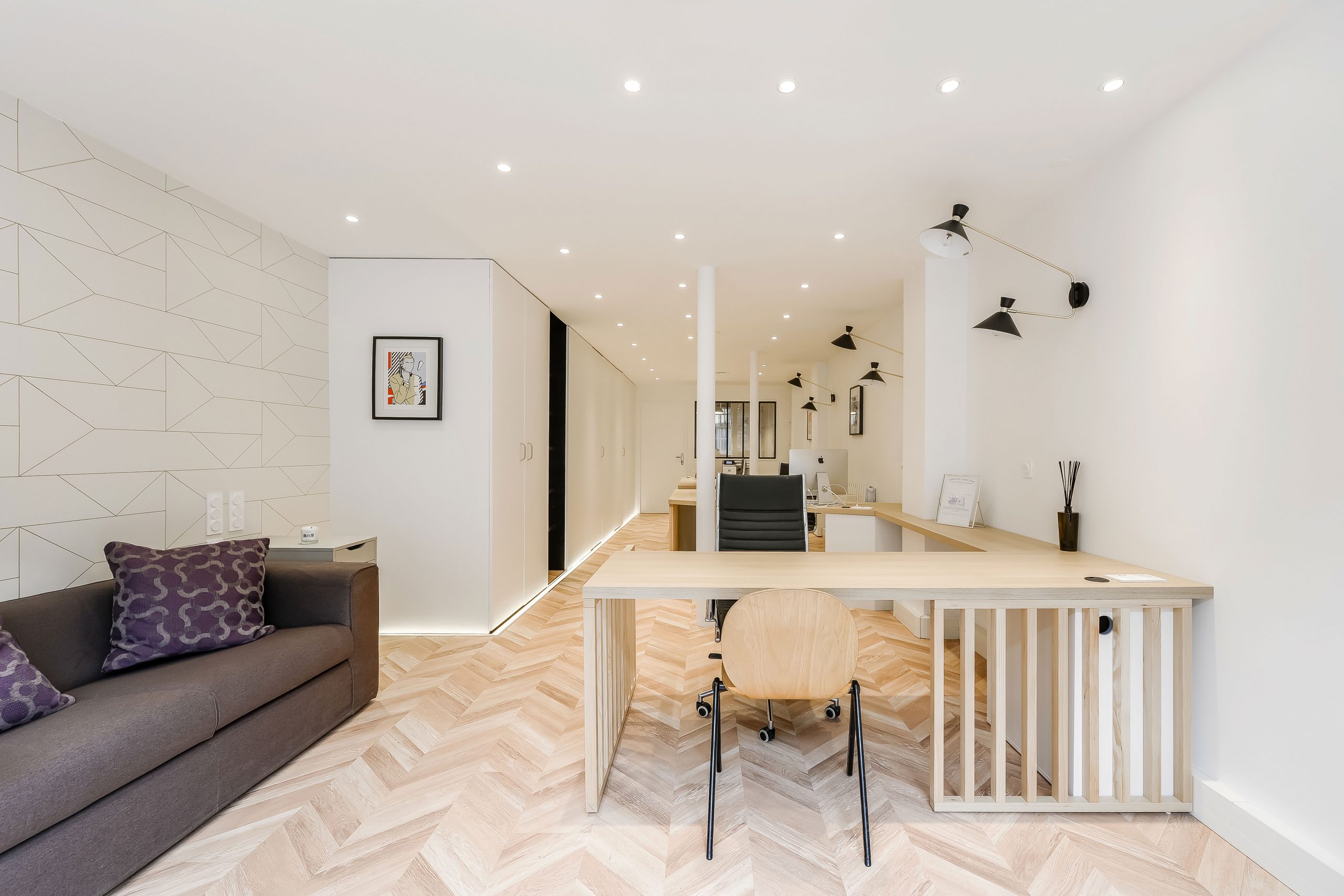 Ces bureaux de 80 m2, situés rue Lauriston dans le 16e arrondissement de Paris, ont été entièrement rénovés pour accueillir une agence immobilière dans un environnement à la fois structuré, fonctionnel et accueillant. L’organisation spatiale générale a été conservée : un espace d’attente à l’entrée, une grande zone de travail ouverte et un bureau fermé à l’arrière, visuellement connecté au reste des espaces pour préserver la continuité.