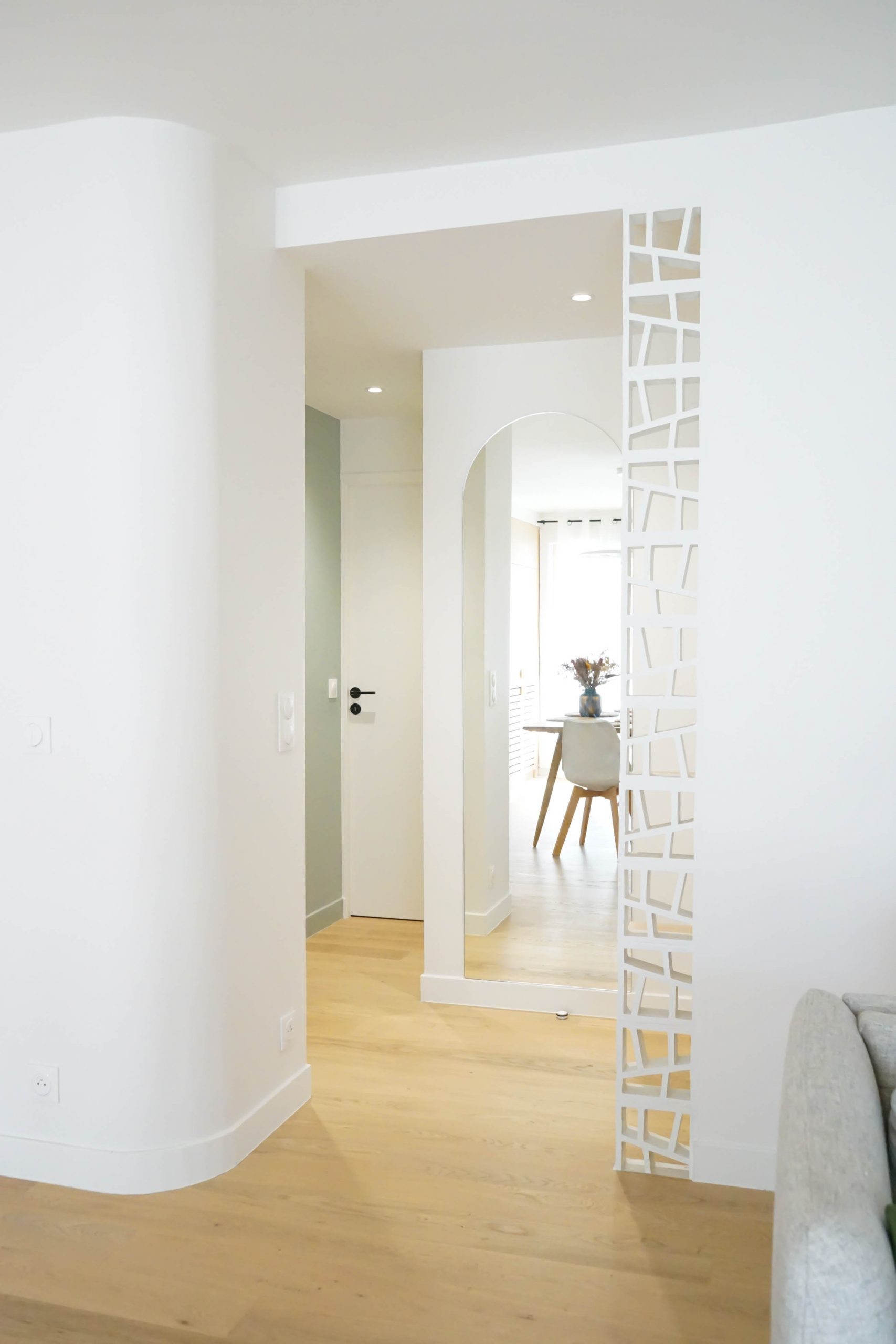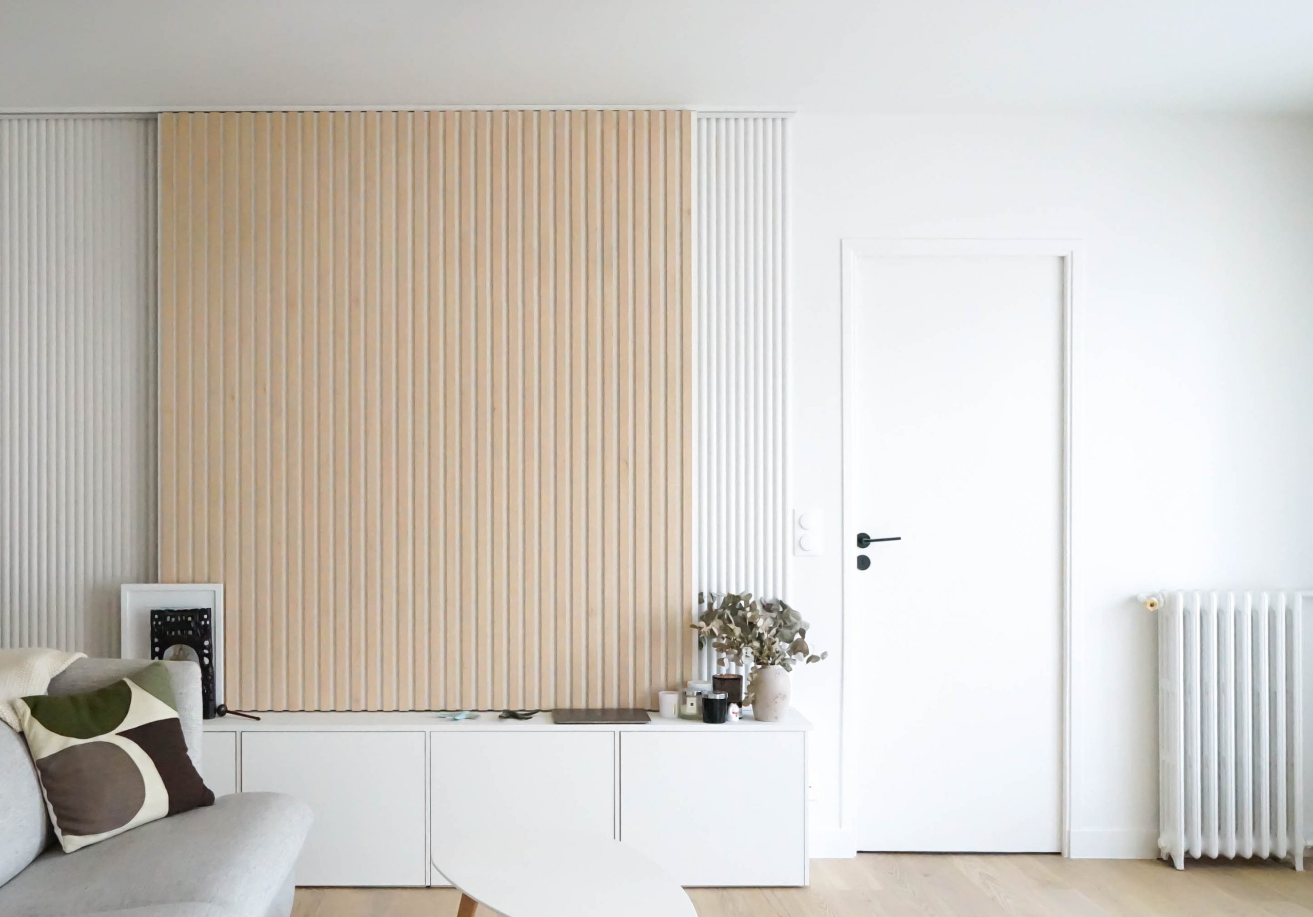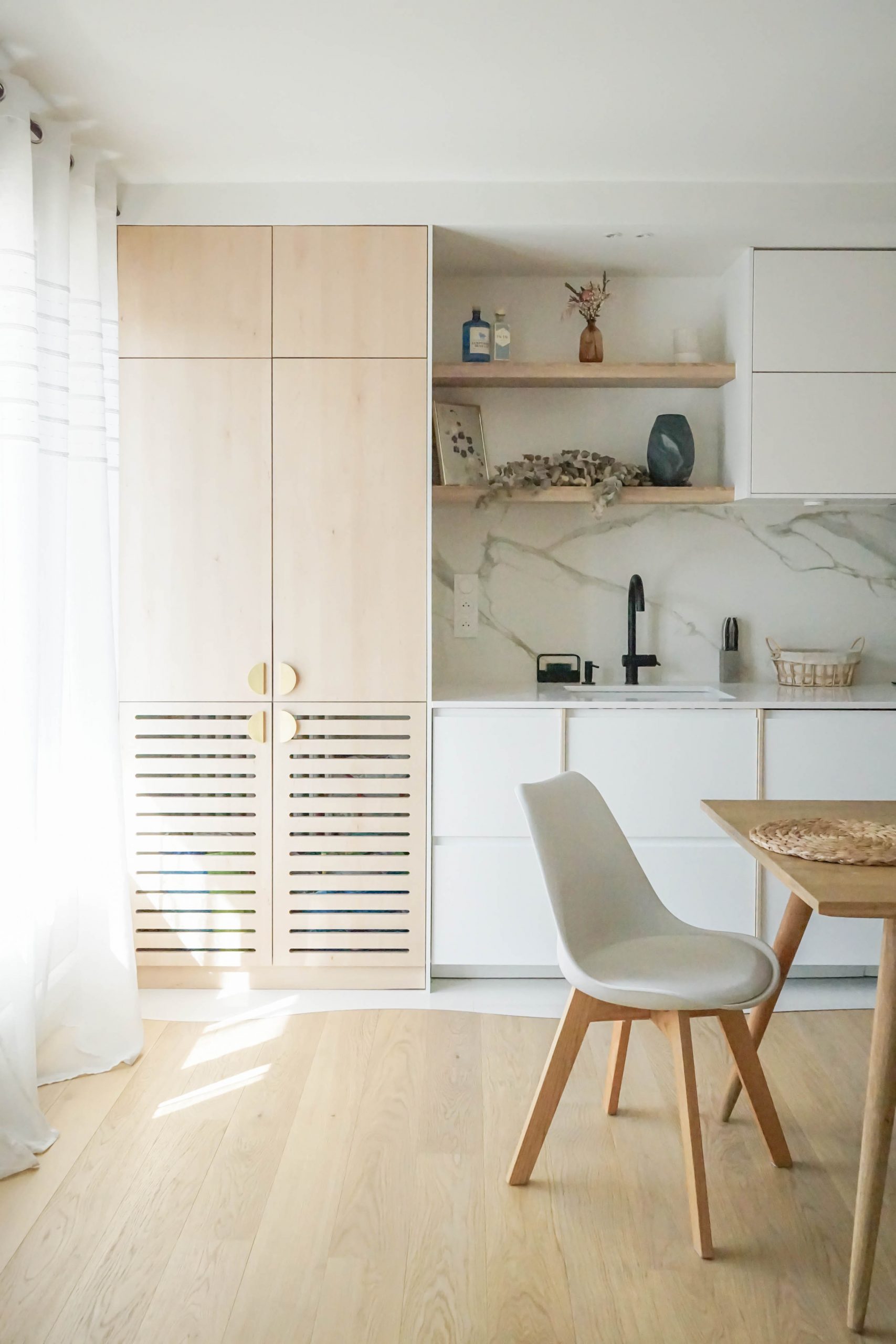 L’entrée a été repensée avec un claustra ajouré pour créer une transition douce vers la pièce de vie, et une petite salle d’eau avec WC a été ajoutée pour compléter le programme. Avec un budget maîtrisé, le choix s’est porté sur une cuisine mixant éléments Ikea et façades sur mesure, offrant un rendu unique et soigné. Pensée comme la pièce maîtresse de l’appartement, elle donne le ton de l’espace de vie : contemporain, fonctionnel et personnel. Dans le salon, un meuble de rangement bas filant permet de structurer l’espace sans l’alourdir.