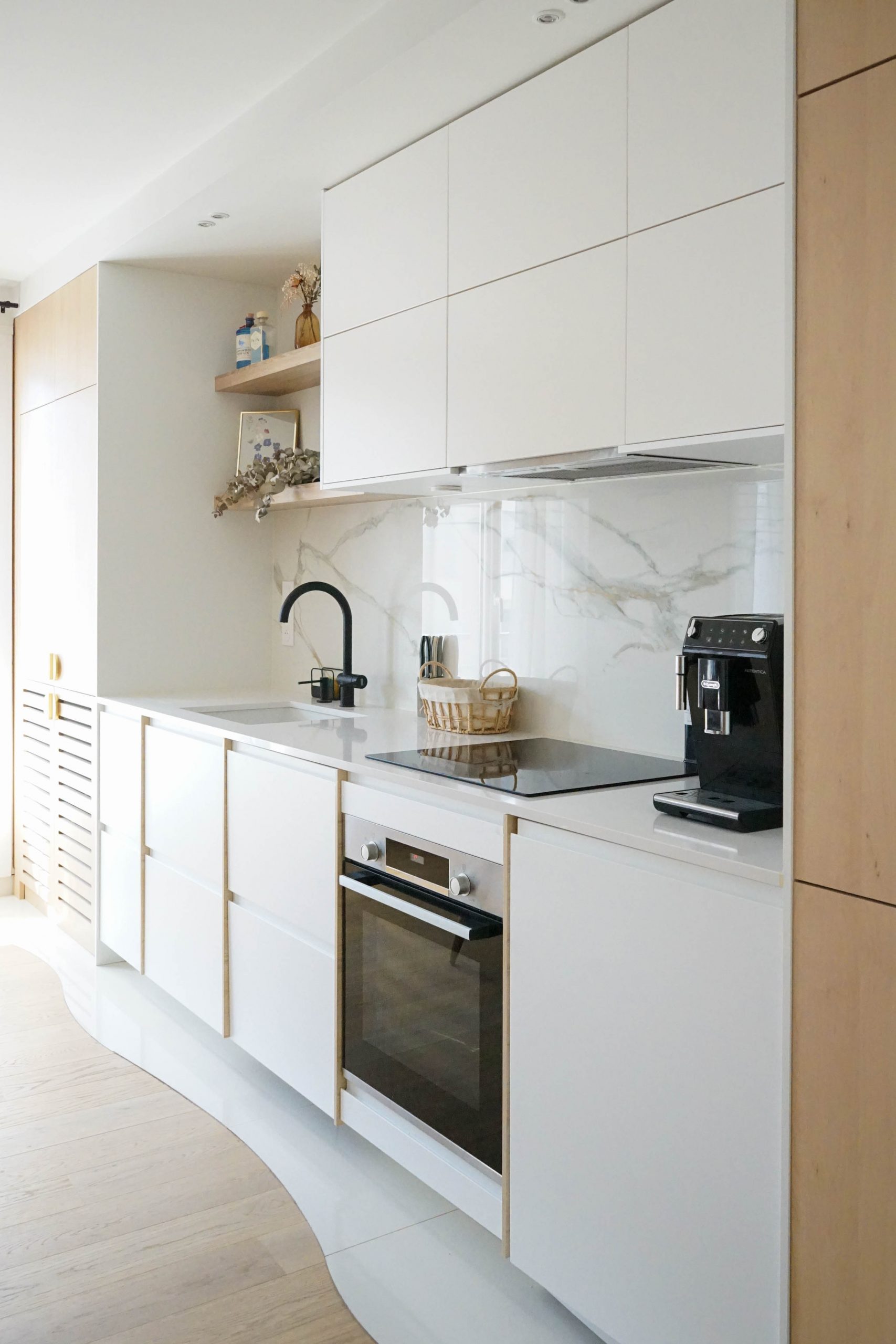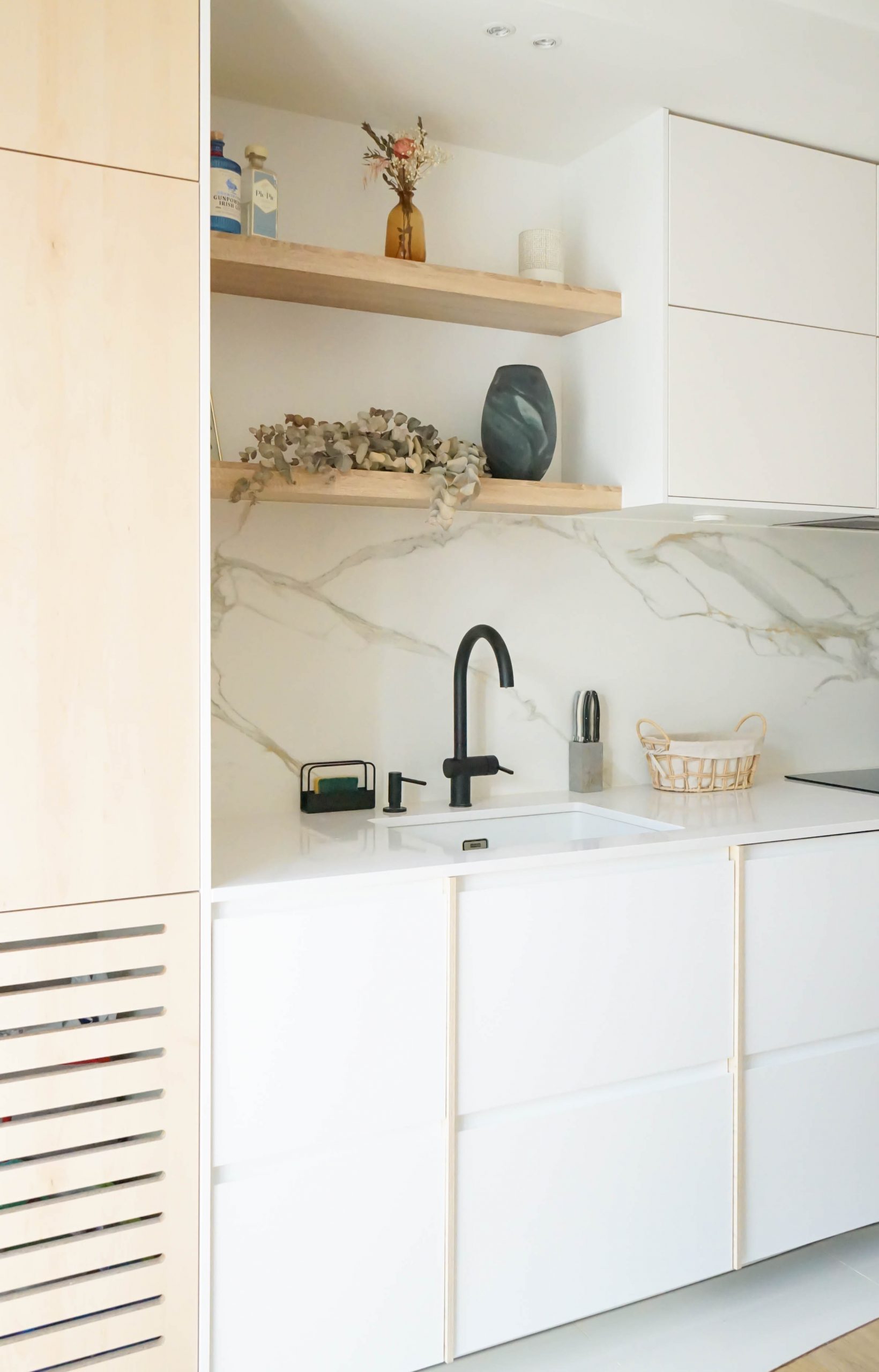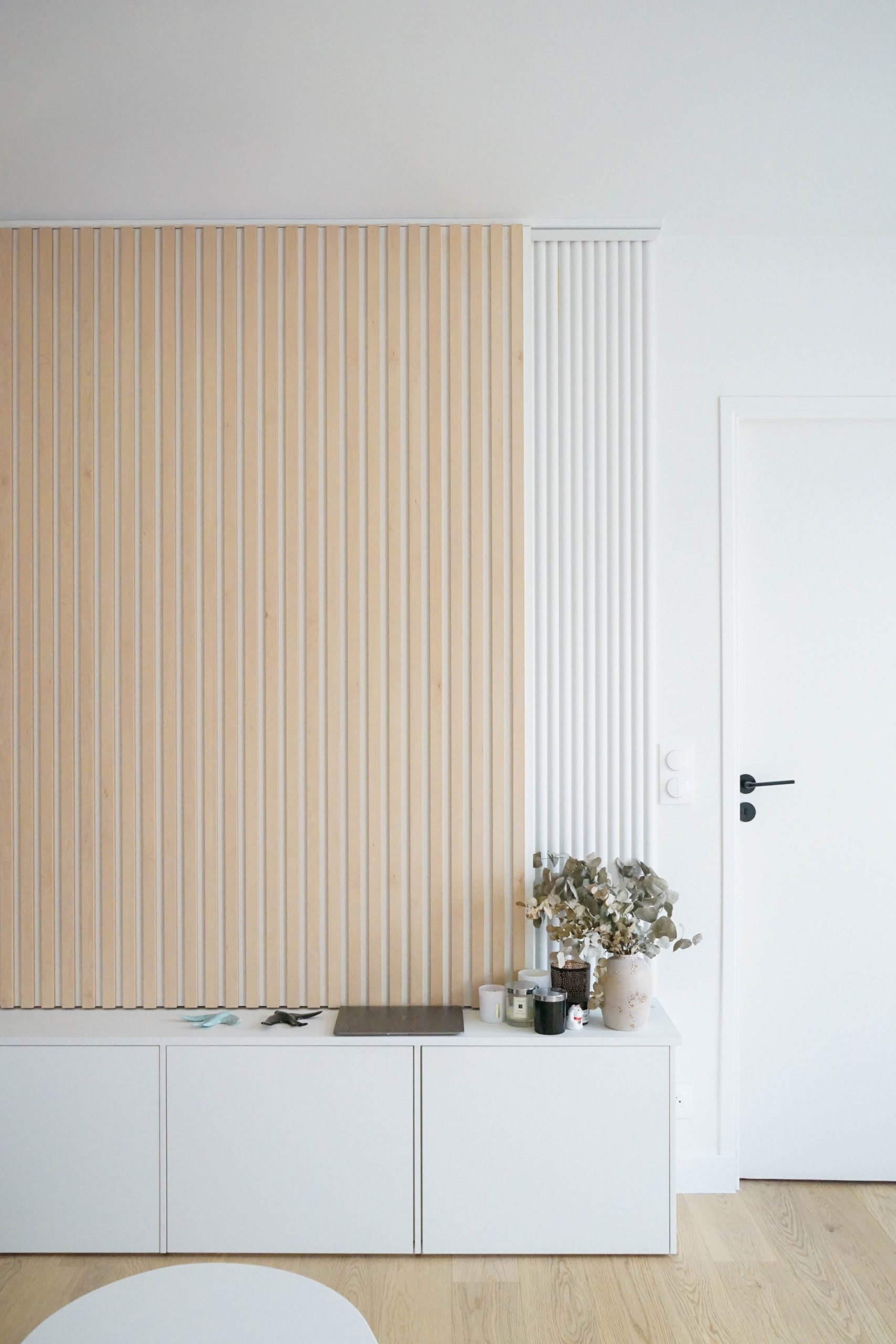 L’entrée a été repensée avec un claustra ajouré pour créer une transition douce vers la pièce de vie, et une petite salle d’eau avec WC a été ajoutée pour compléter le programme. Avec un budget maîtrisé, le choix s’est porté sur une cuisine mixant éléments Ikea et façades sur mesure, offrant un rendu unique et soigné. Pensée comme la pièce maîtresse de l’appartement, elle donne le ton de l’espace de vie : contemporain, fonctionnel et personnel. Dans le salon, un meuble de rangement bas filant permet de structurer l’espace sans l’alourdir.