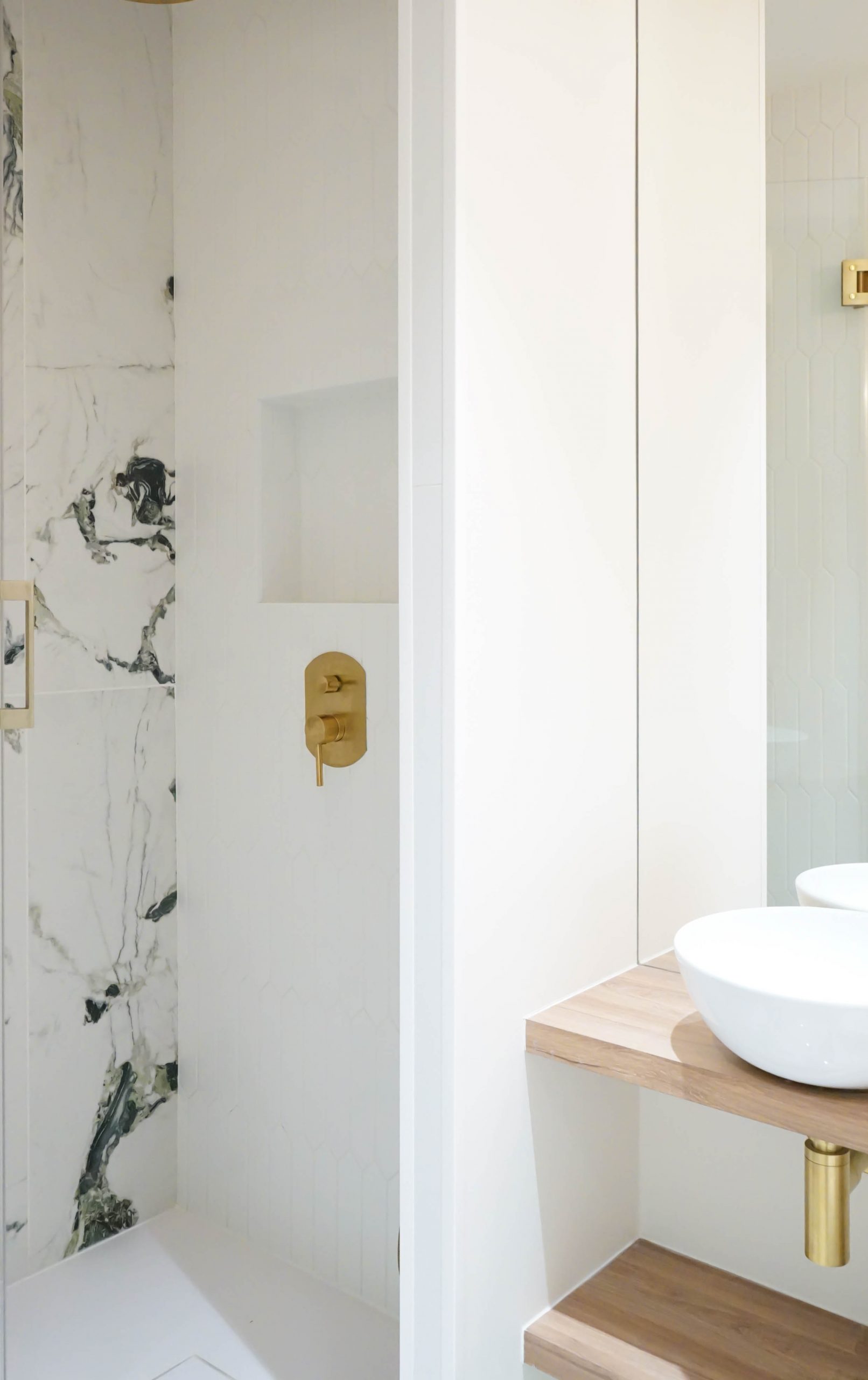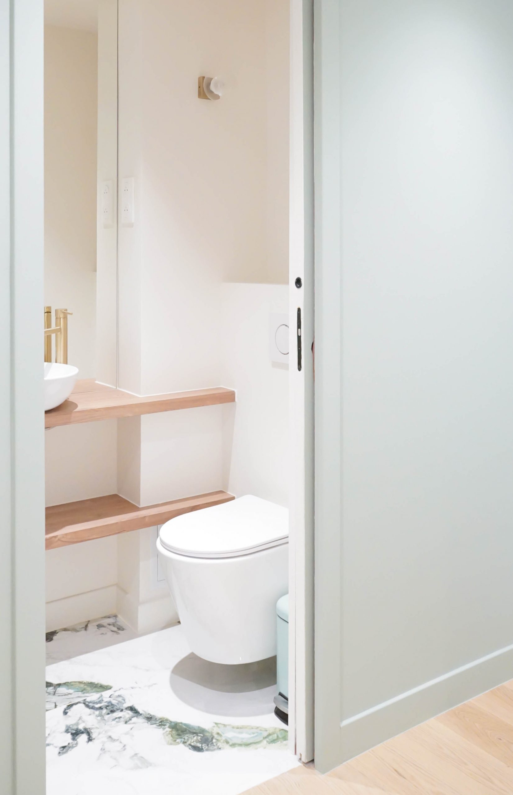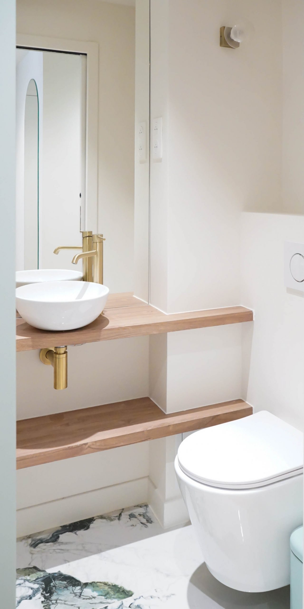 Un claustra coulissant sur rail dissimule la télévision, laissant apparaître un tableau lorsqu’elle n’est pas utilisée — une astuce à la fois esthétique et ludique. Les salles de bain ont été travaillées dans l’air du temps : marbre vert profond, meuble terracotta, finitions mates et chaleureuses. Un projet intelligent et créatif, qui montre qu’avec les bons choix, style et budget peuvent cohabiter sans compromis.
