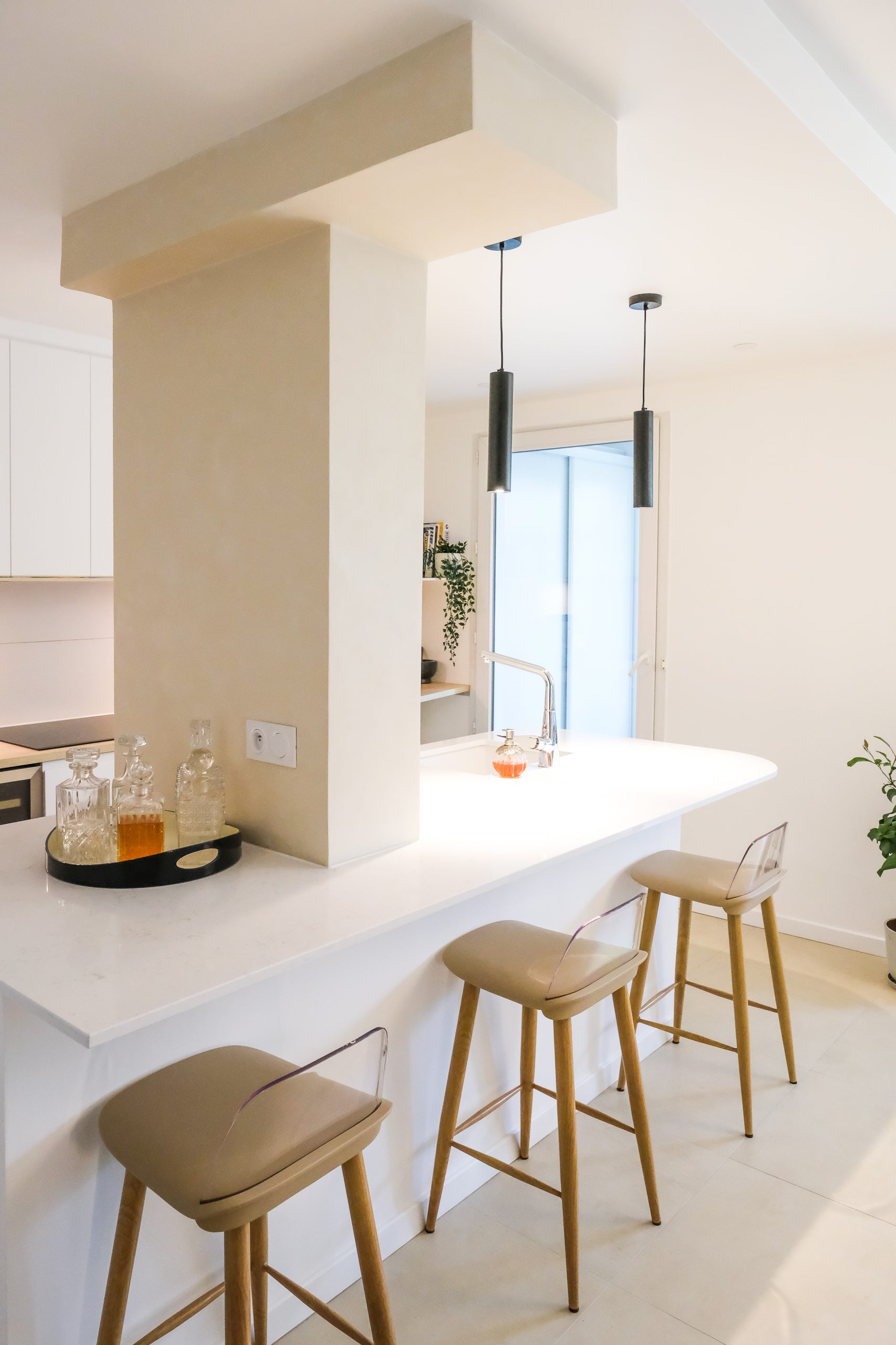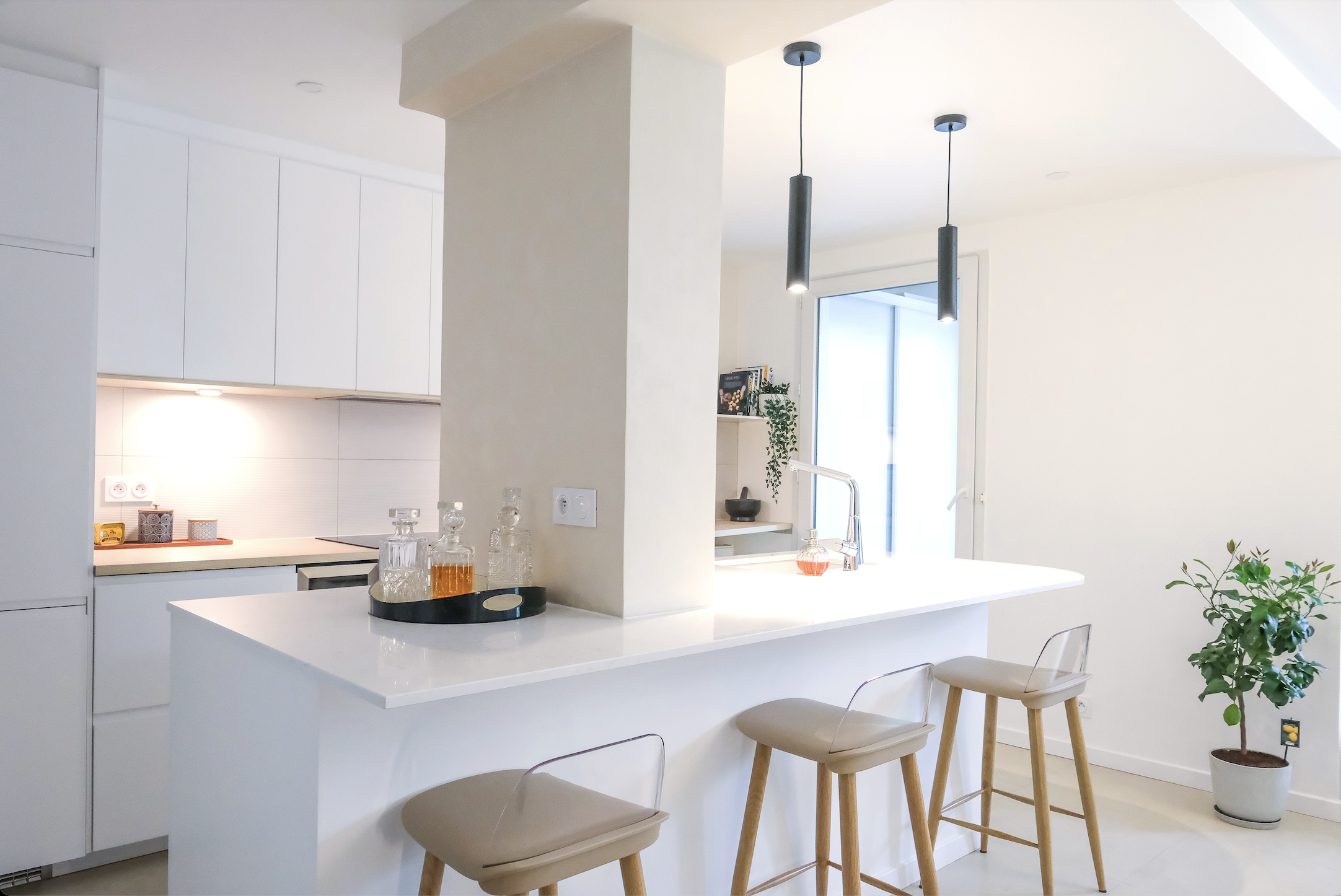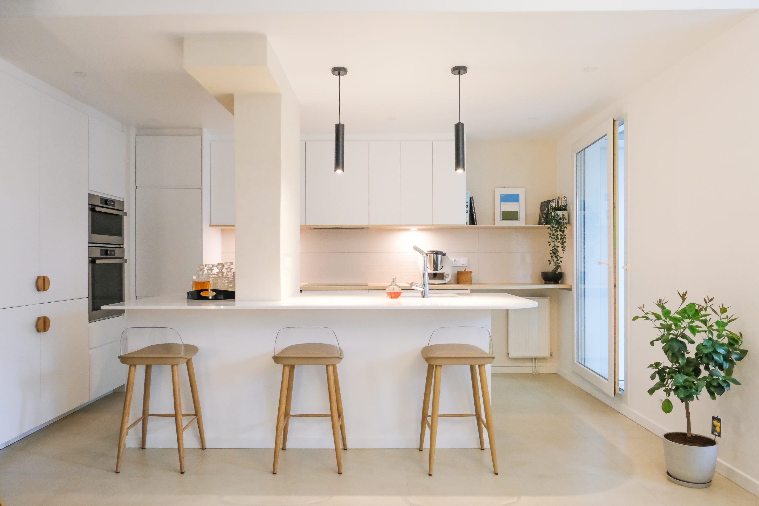 La palette a été volontairement claire, avec une cuisine blanche lumineuse, ponctuée de touches de bois naturel — étagères, poignées — pour apporter de la chaleur et du contraste. Un élément structurel imposant au centre de l’espace a été conservé et adouci grâce à une peinture à la chaux, qui l’intègre naturellement au nouvel aménagement tout en lui conférant un rôle esthétique. Pensée avec un budget maîtrisé, la cuisine repose sur une base IKEA personnalisée, enrichie de détails sur mesure qui lui donnent un caractère unique. Un petit projet par sa surface, mais soigné dans ses finitions, où chaque choix compte pour sublimer la lumière et le quotidien.