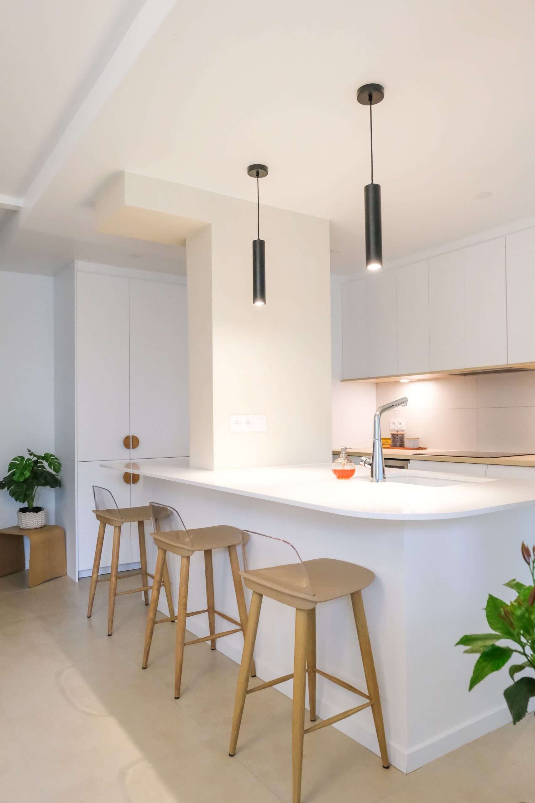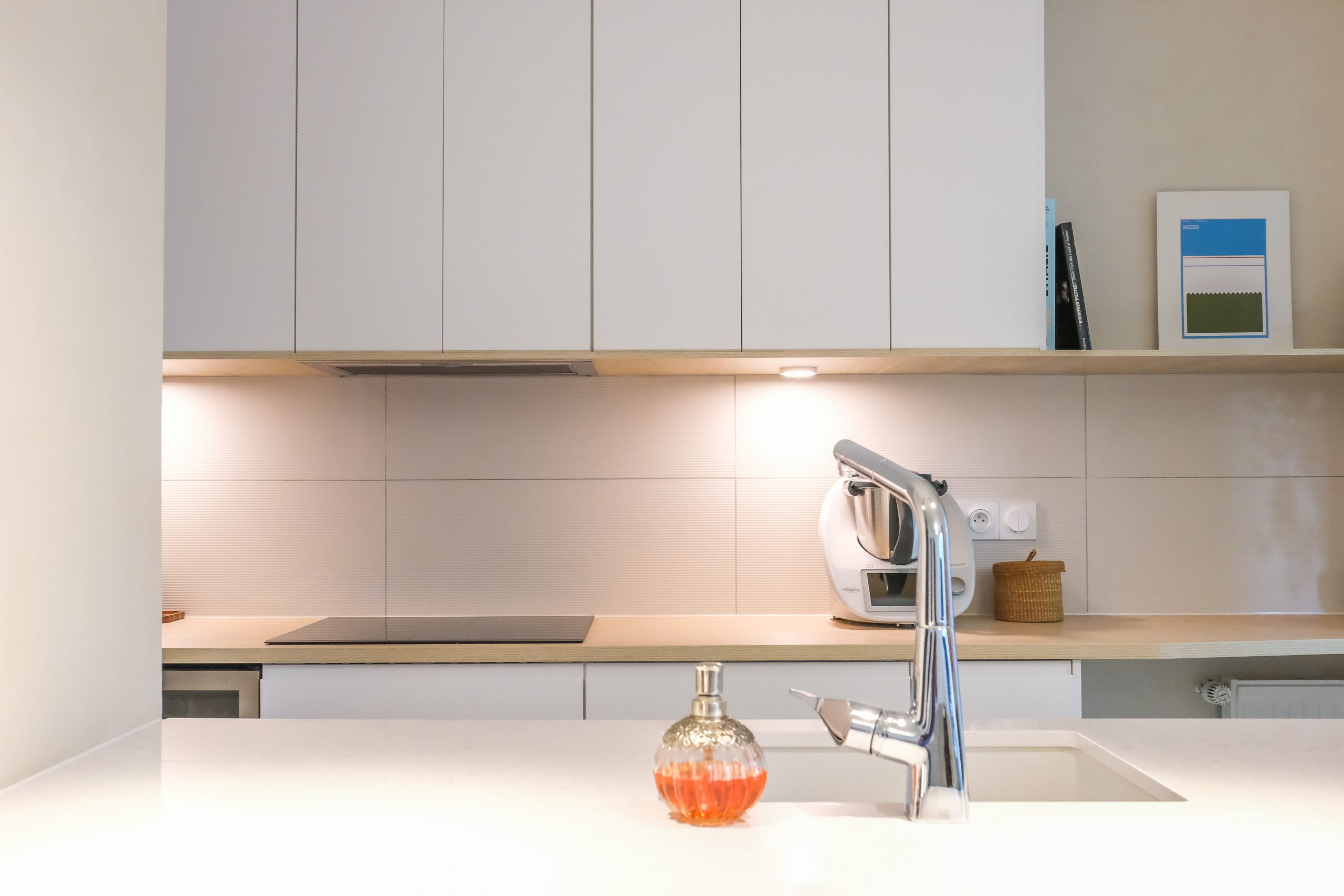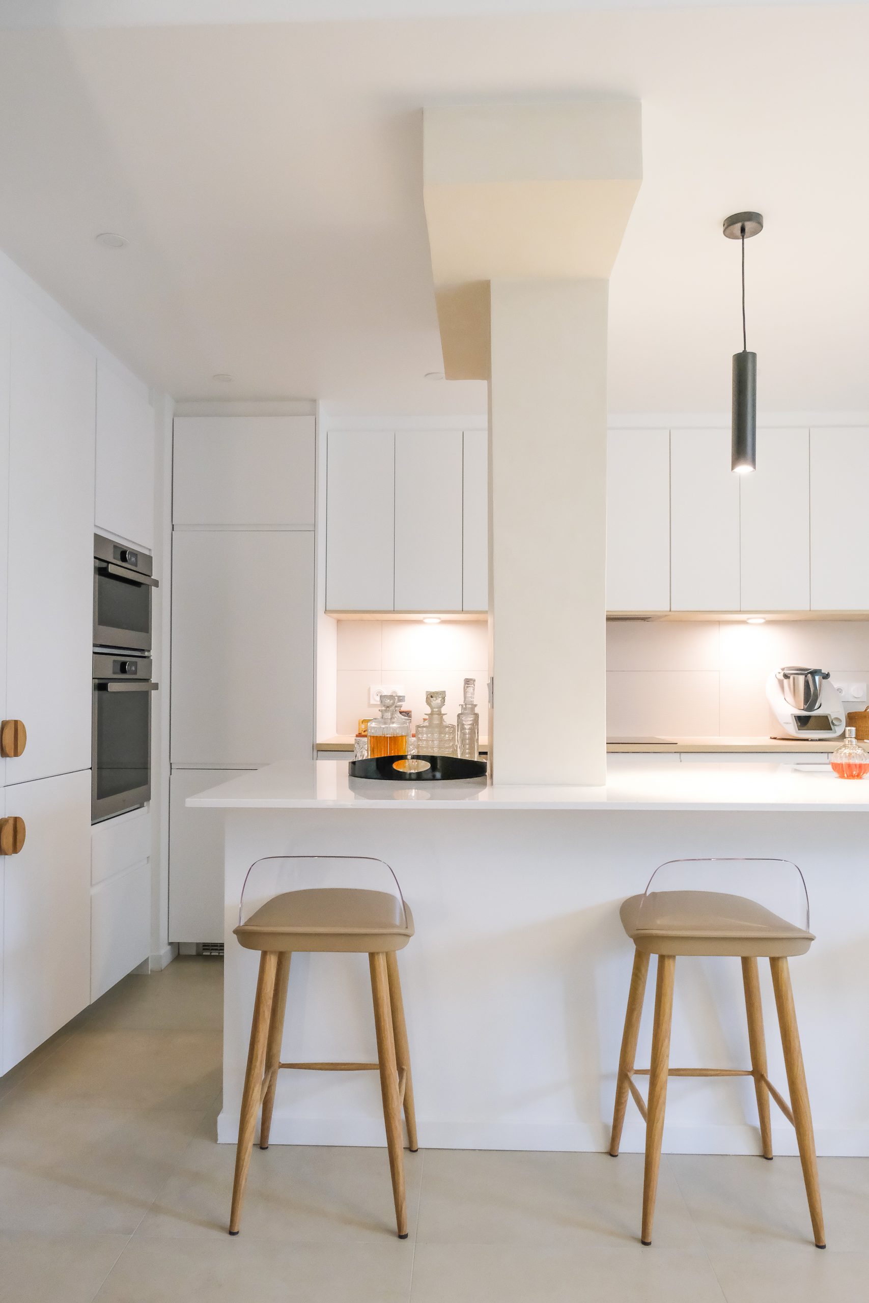 La palette a été volontairement claire, avec une cuisine blanche lumineuse, ponctuée de touches de bois naturel — étagères, poignées — pour apporter de la chaleur et du contraste. Un élément structurel imposant au centre de l’espace a été conservé et adouci grâce à une peinture à la chaux, qui l’intègre naturellement au nouvel aménagement tout en lui conférant un rôle esthétique. Pensée avec un budget maîtrisé, la cuisine repose sur une base IKEA personnalisée, enrichie de détails sur mesure qui lui donnent un caractère unique. Un petit projet par sa surface, mais soigné dans ses finitions, où chaque choix compte pour sublimer la lumière et le quotidien.