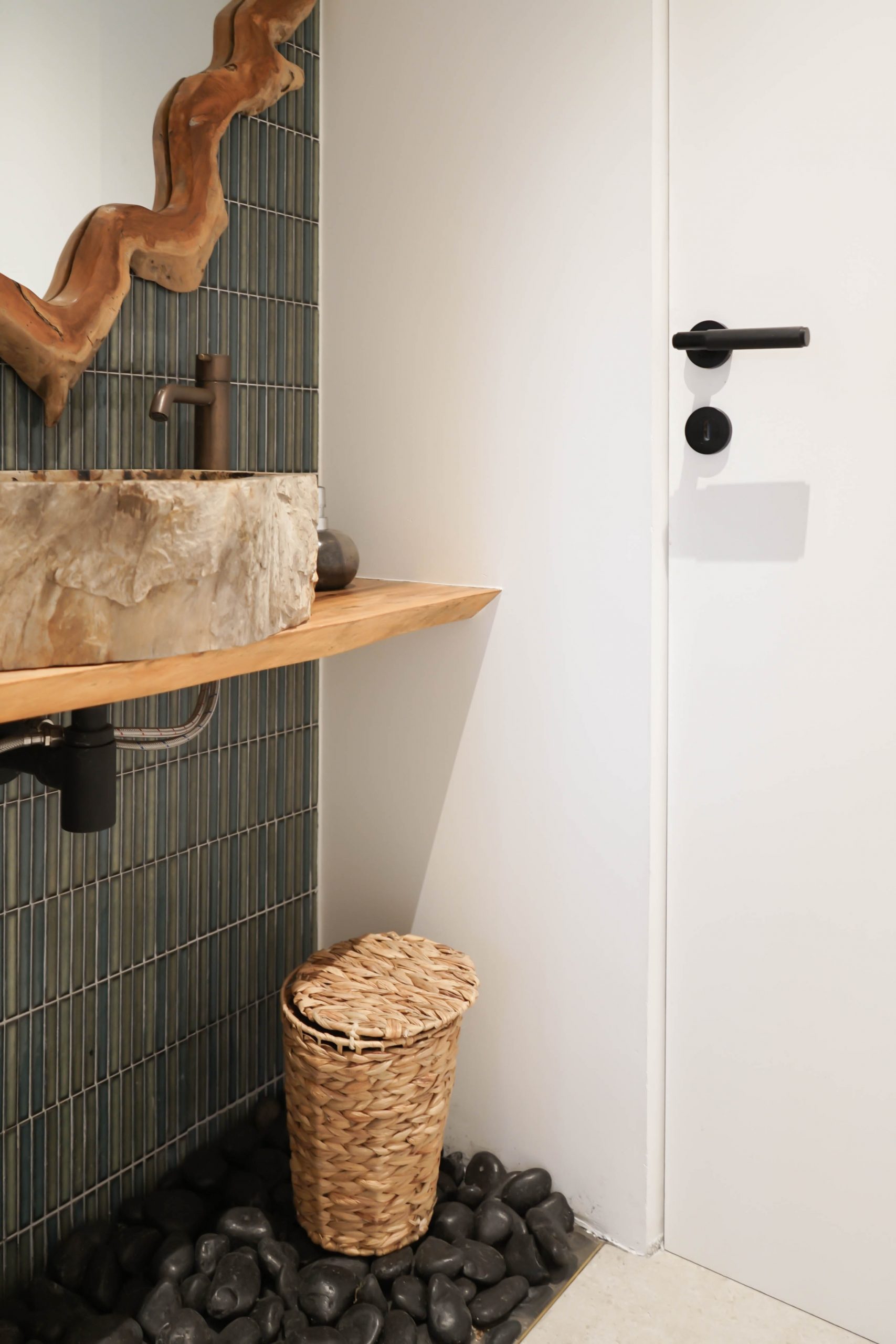 Chaque zone affirme son identité grâce à un traitement mural dédié — faïence, papier peint, peinture à la chaux — tout en conservant une cohérence esthétique globale. L’aménagement valorise les pièces exposées sans jamais leur voler l’attention.